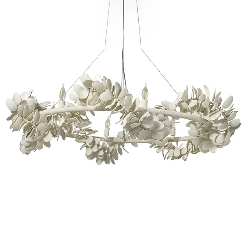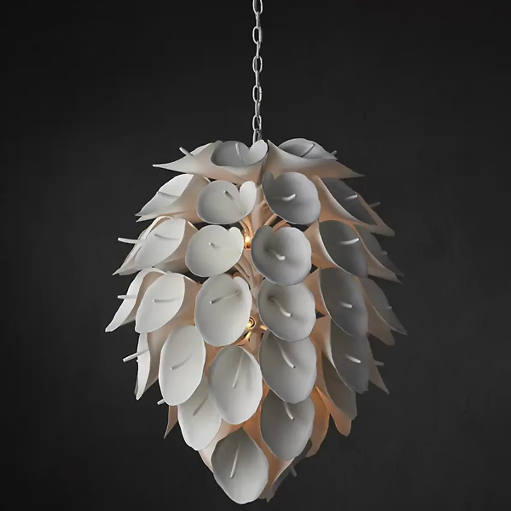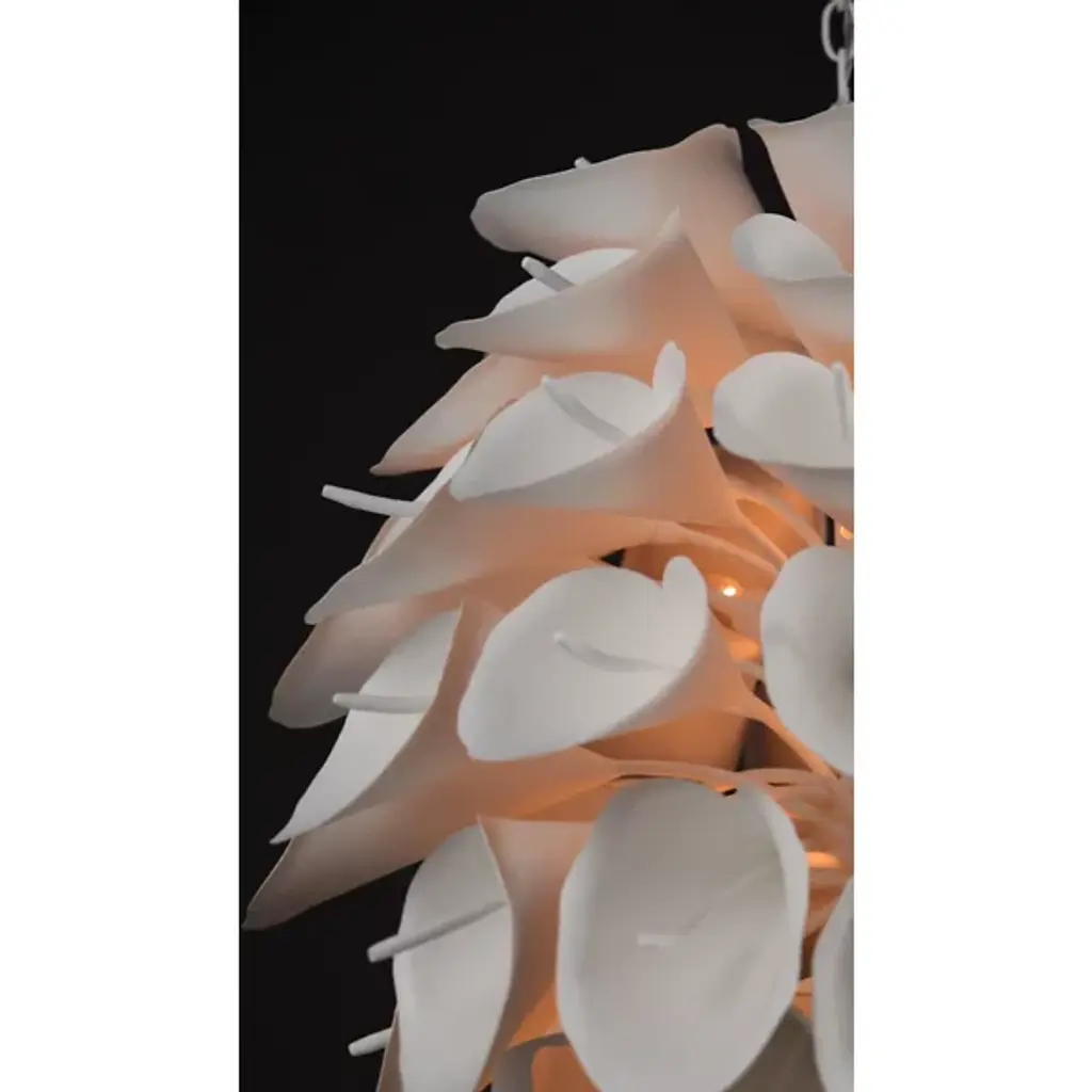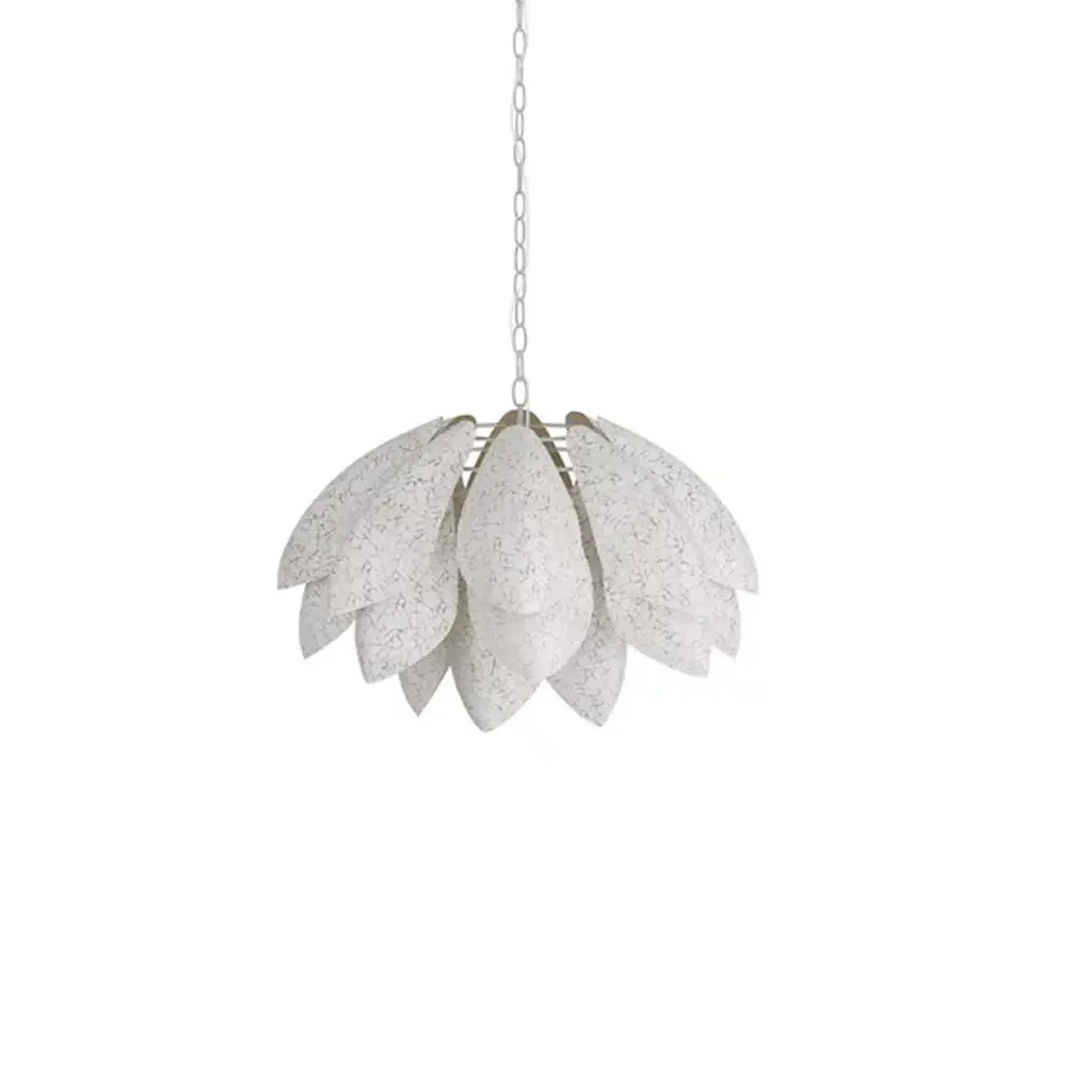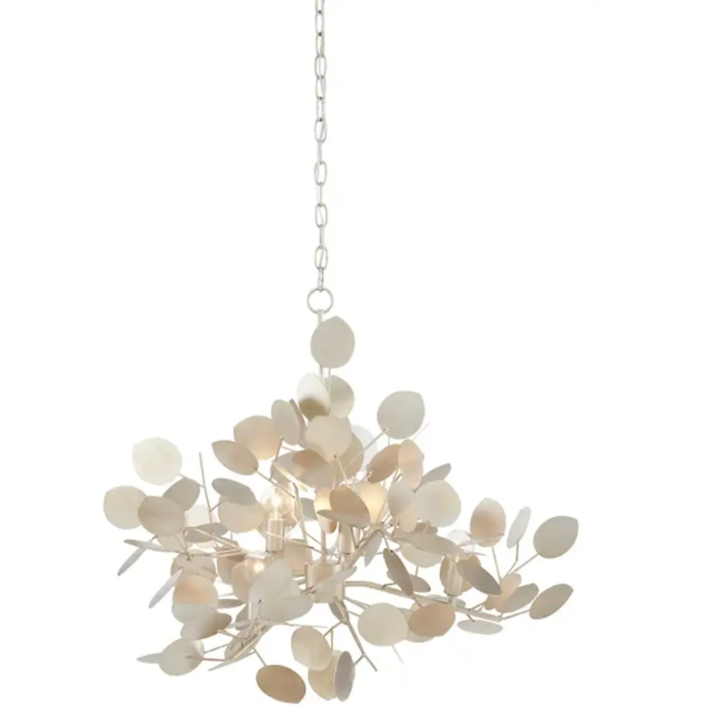 The Diego Chandelier from Currey & Company exudes enchantment with its teardrop-shaped design crafted from wrought iron and finished in white gesso. Designed by Marjorie Skouras, it pays homage to the Yucatan Peninsula, her cherished home. Inspired by the flourishing Calla Lily native to her surroundings, this white chandelier is part of her collection, celebrating the region's rich flora and fauna. Adjustable from 40.25" to 108.25" with the included chain, rod kit, and cable, additional options are available to accommodate longer drops, ensuring it fits perfectly into any space.