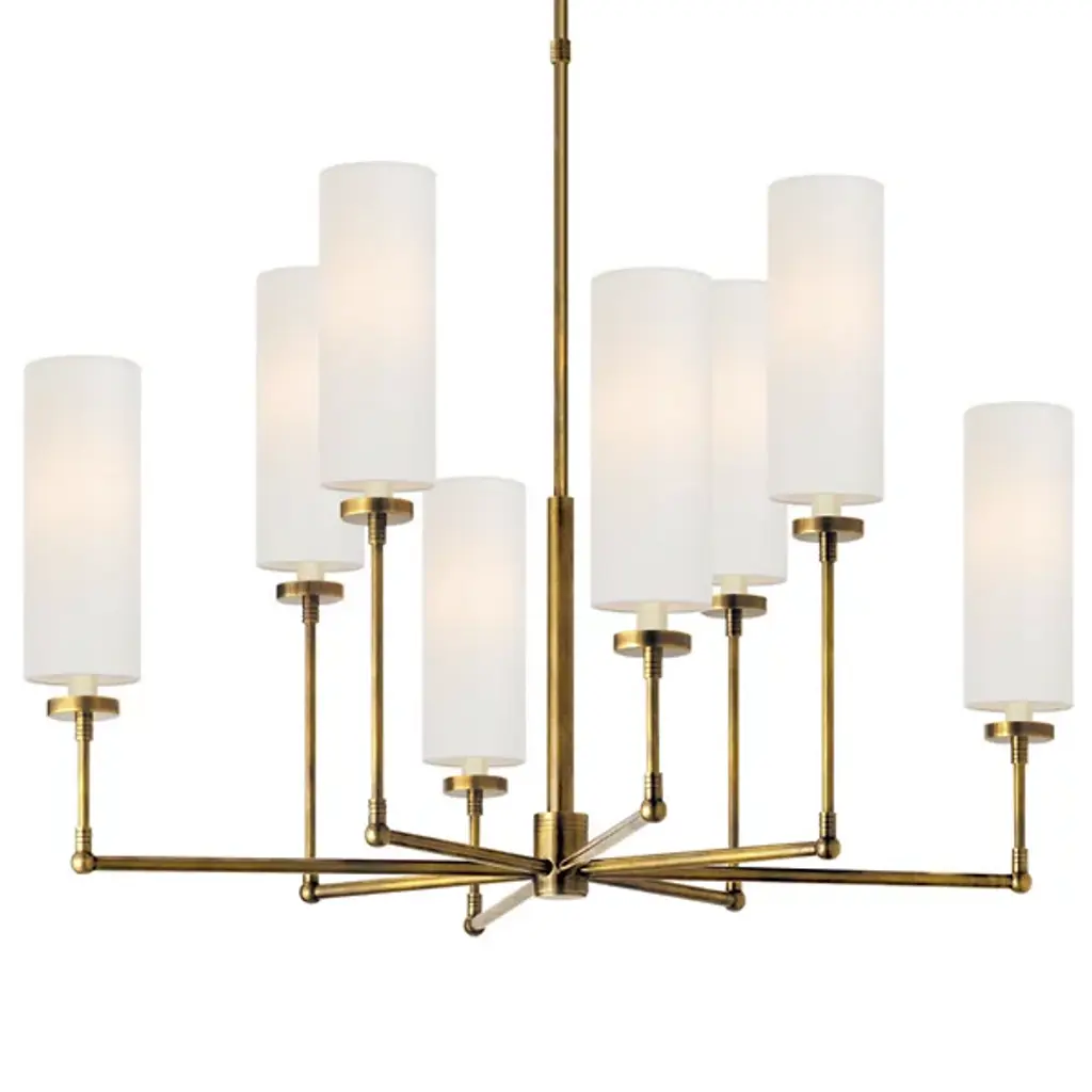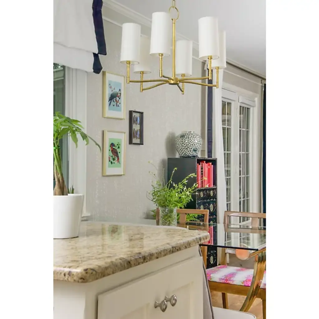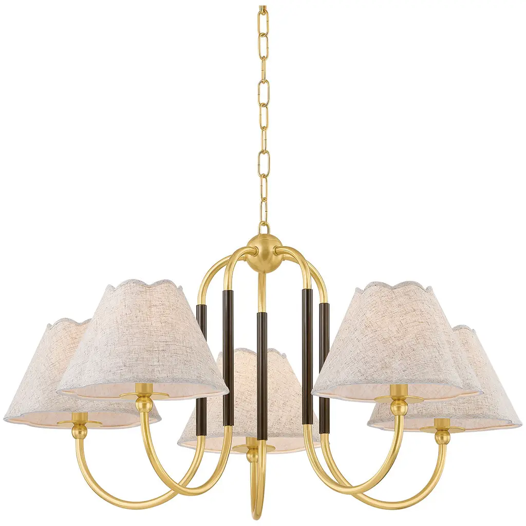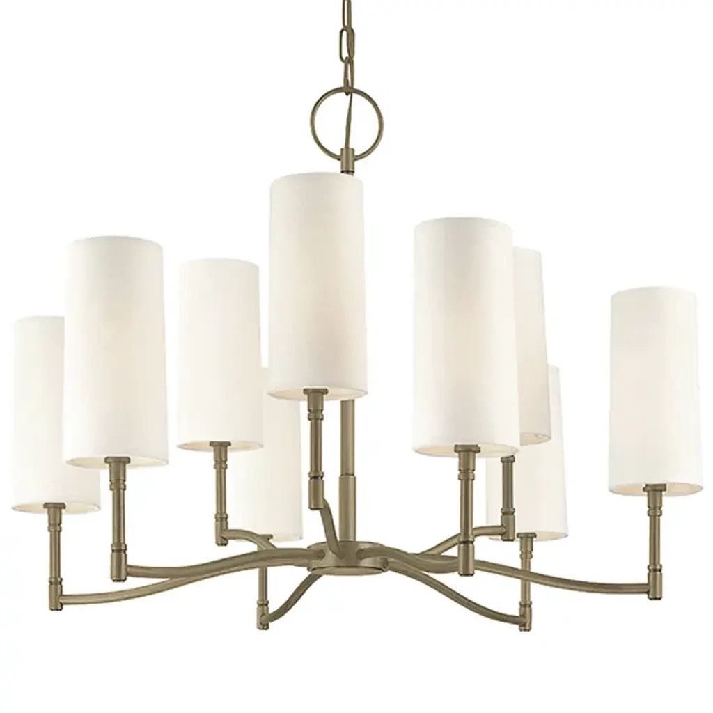 Slender arms with clean, gentle curves give the Hudson Valley Dillon Chandelier a graceful presence in a wide range of traditional and transitional interiors. The arms and the rest of the metal frame are available in a variety of rich finishes, all of which beautifully complement the six or nine Off White linen shades.