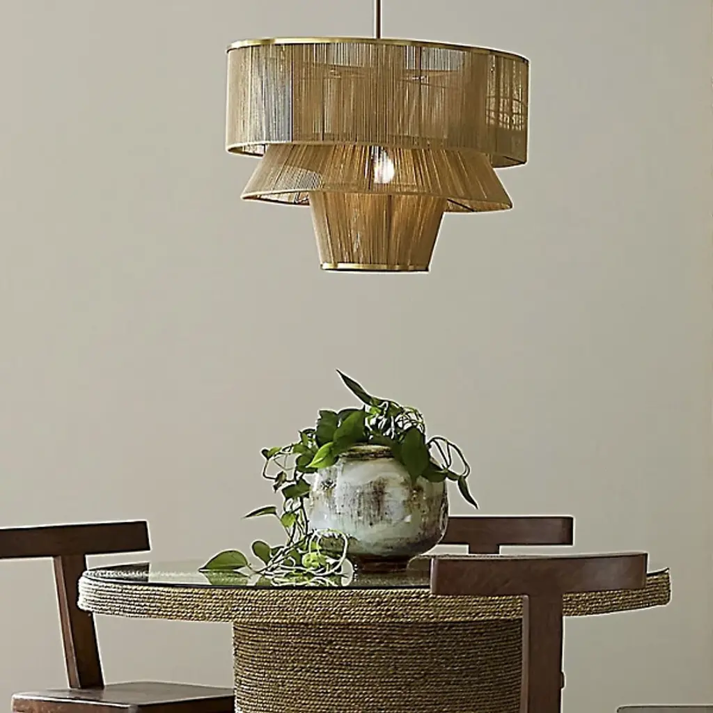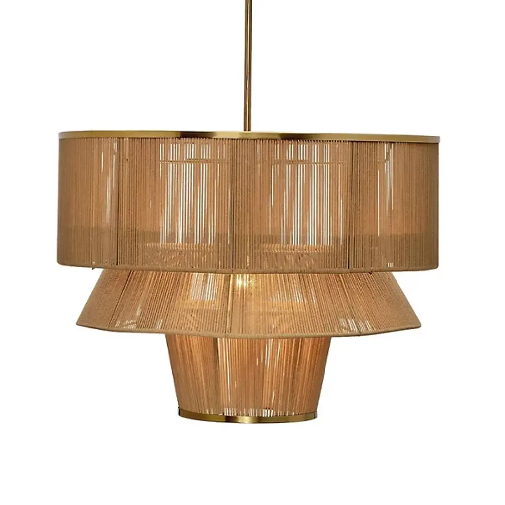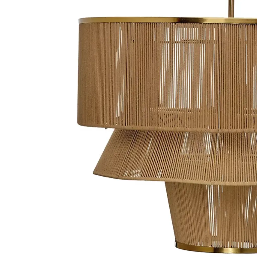 The Dimension Chandelier from Jamie Young Co. offers a modern twist on coastal design, featuring three handcrafted tiers wrapped in natural cotton rope. The first and third tiers are accented with warm metal rims, while the inner tiers are hand-edged with cotton trim for added texture. Suspended from an adjustable iron rod with an antiqued brass finish, it brings warmth and sophistication to any space. This beautifully crafted fixture perfectly over a dining table instantly elevates tropical or coastal-inspired décor with effortless charm.