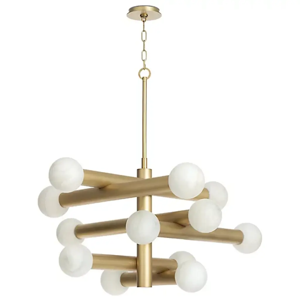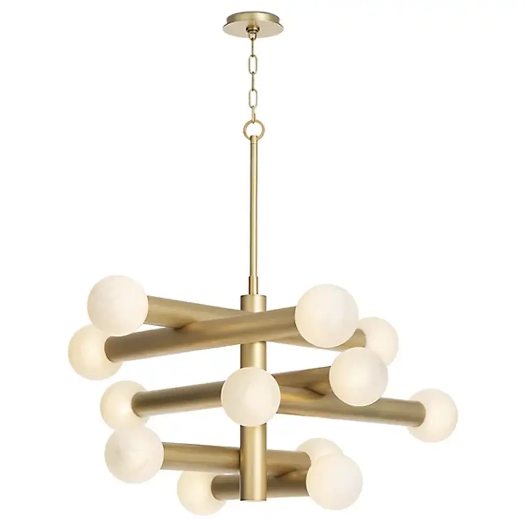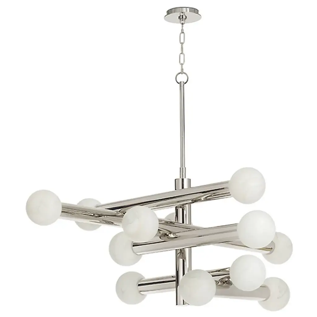 The Dion Chandelier from Regina Andrew features a sleek, modern design that captures the essence of mid-century modern aesthetics. This chandelier effortlessly combines contemporary sophistication with timeless elegance, featuring a stylish metal base and alabaster-like glass globes. Ideal for making a bold statement in larger spaces, the Dion Chandelier emits a warm, inviting glow, adding a touch of modern flair to dining rooms and living areas. Transform your space with the striking and elegant illumination of the Dion Chandelier.