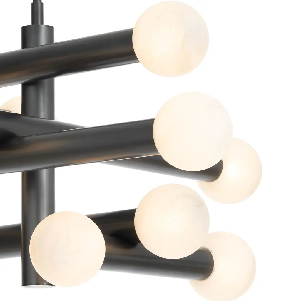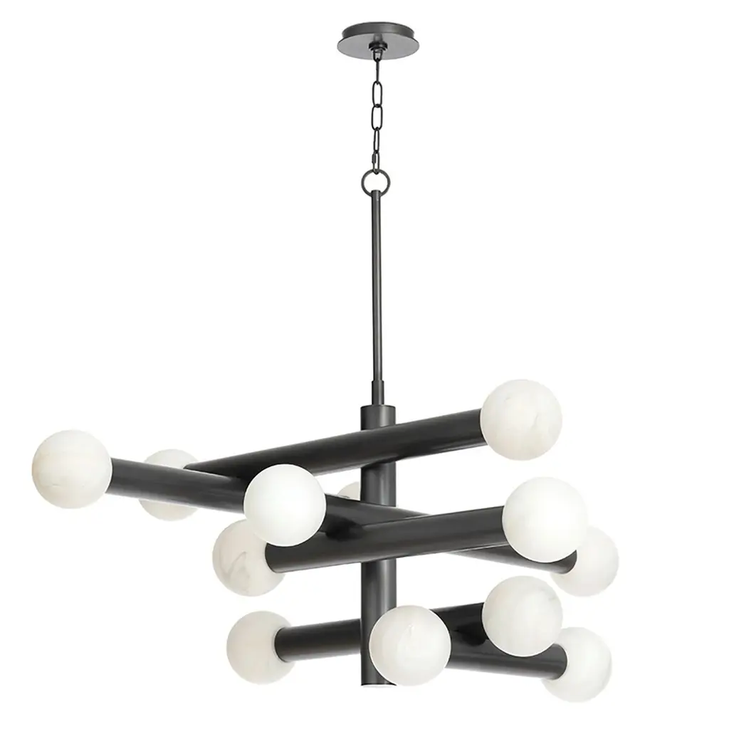 The Dion Chandelier captivates with its modern and sleek design, embracing the essence of mid-century modern aesthetics. The chandelier showcases a metal base and alabaster-like glass globes, seamlessly blending contemporary sophistication with timeless elegance. Perfect for creating a statement in larger spaces, the Dion Chandelier radiates warm illumination and adds a touch of modern flair to dining rooms and living areas.