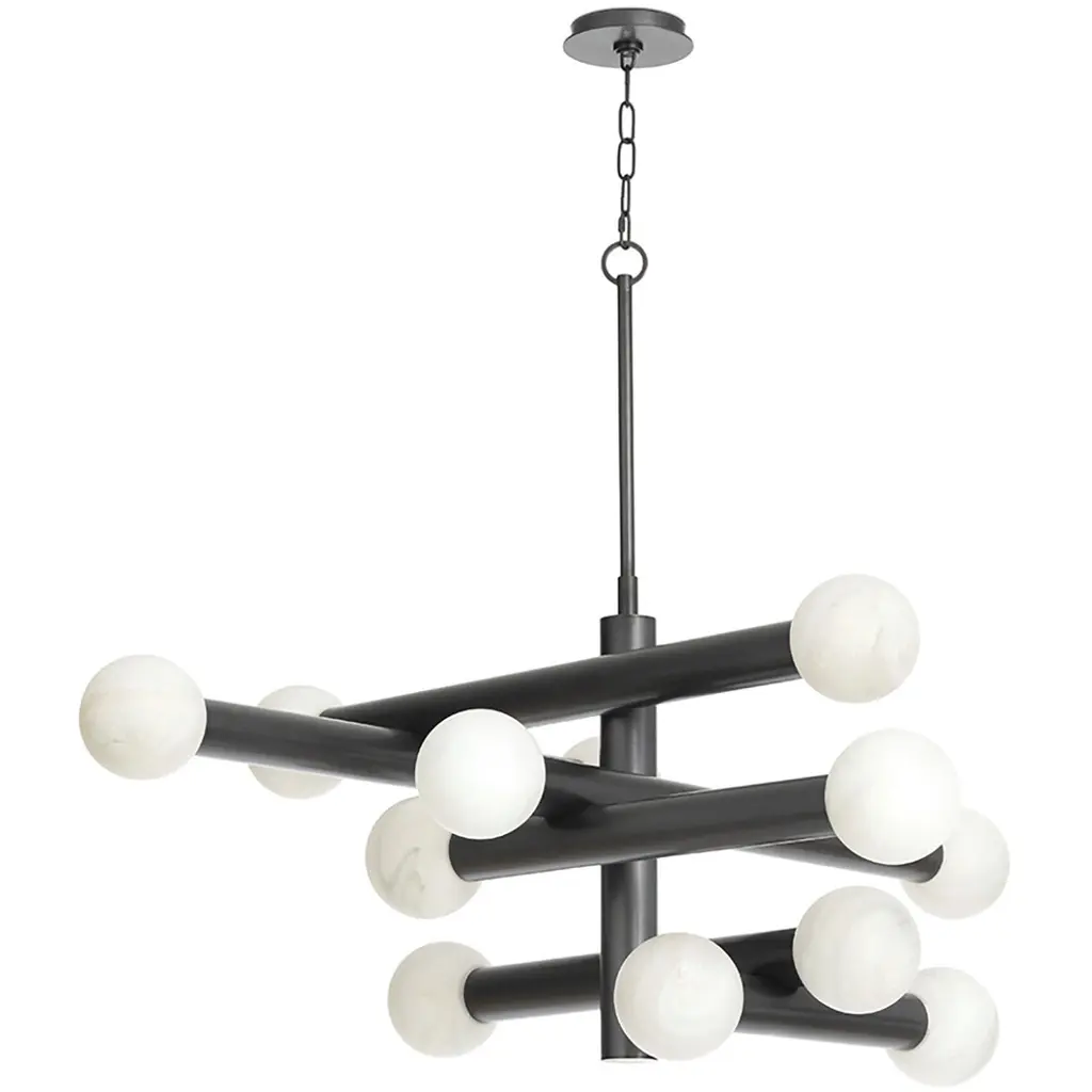 The Dion Chandelier captivates with its modern and sleek design, embracing the essence of mid-century modern aesthetics. The chandelier showcases a metal base and alabaster-like glass globes, seamlessly blending contemporary sophistication with timeless elegance. Perfect for creating a statement in larger spaces, the Dion Chandelier radiates warm illumination and adds a touch of modern flair to dining rooms and living areas.