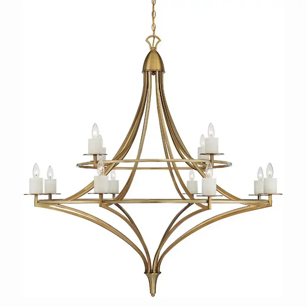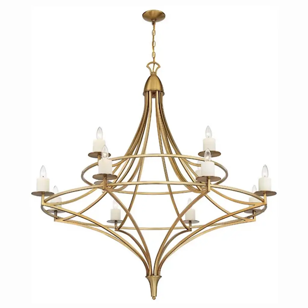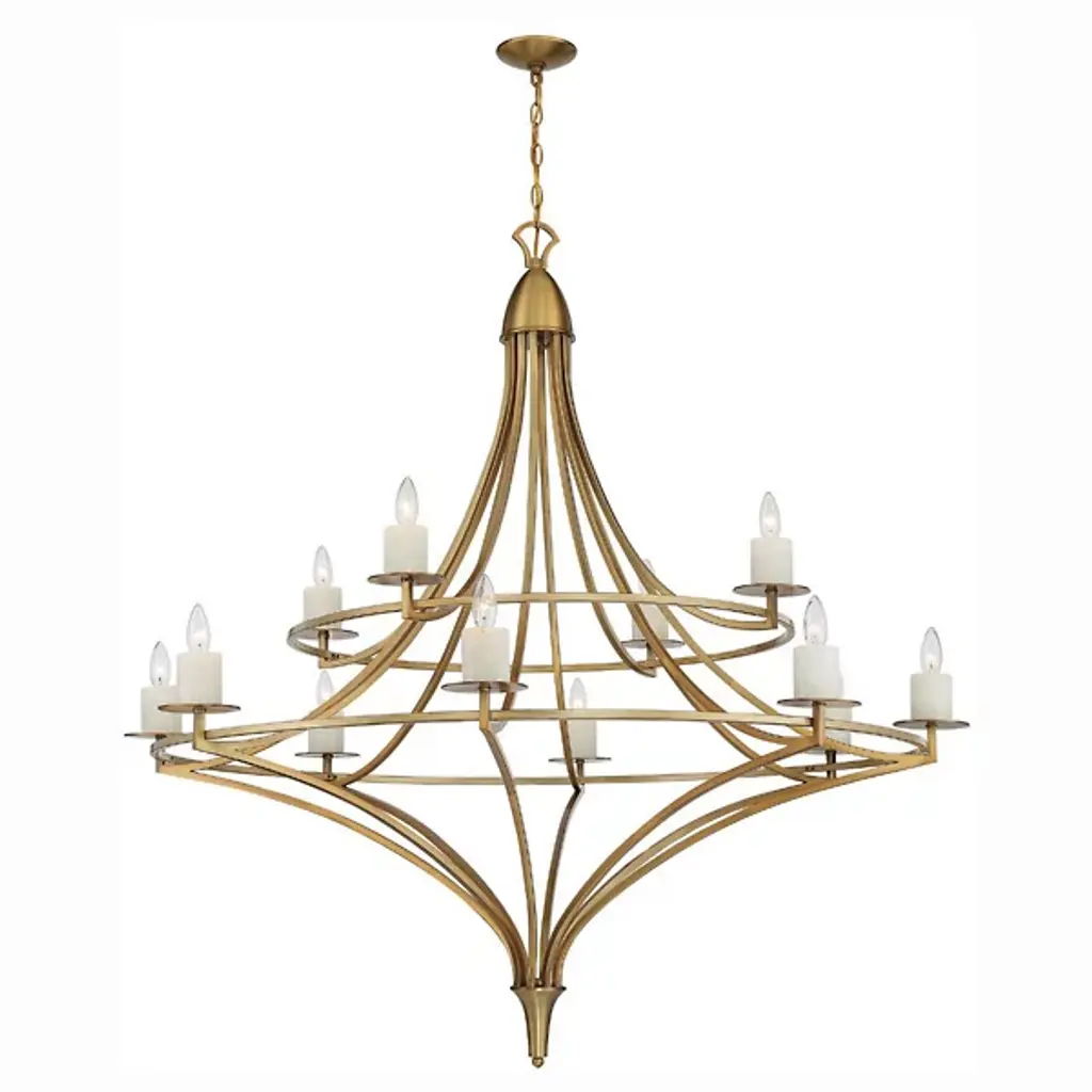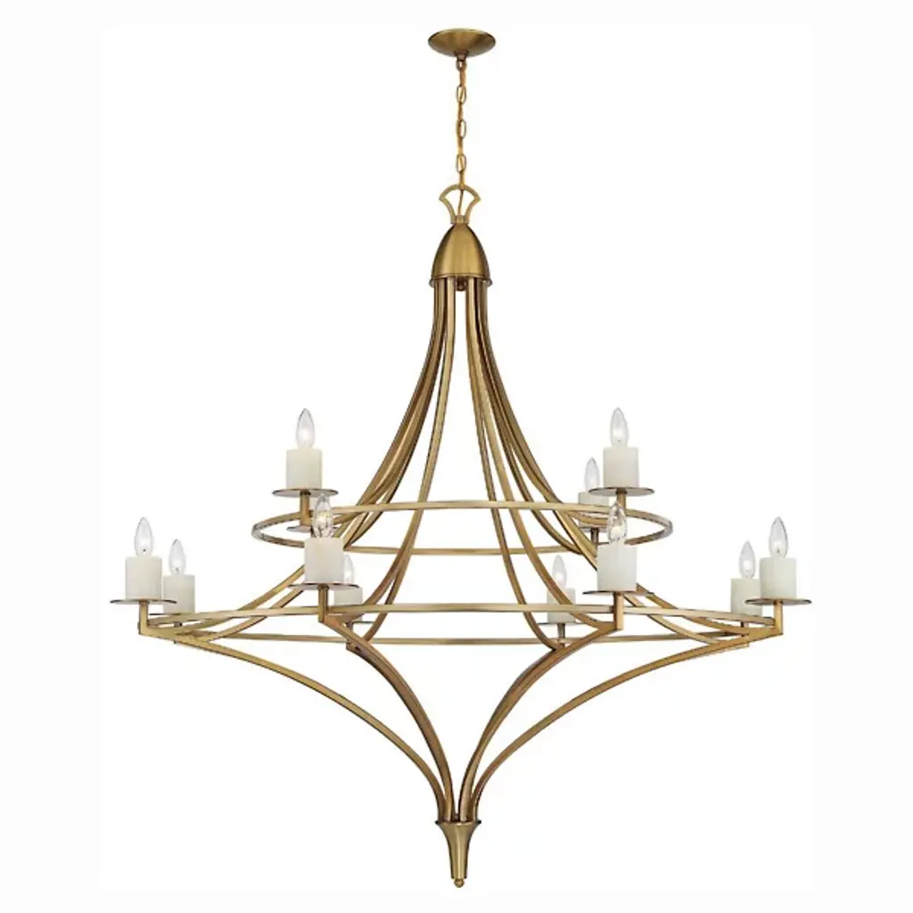 Transitionally designed with a fluid composition. Savoy House presented the Director Chandelier. The entire piece drops from an adjustable chain link from a canopy attached to the ceiling. The bodice slopes down and tucks back in the bottom, evoking a subtle diamond silhouette. Each tier features squat faux candelabra bases for a touch of elegant whimsy. It’s a visually striking chandelier that draws from mid-mod influence while maintaining a timeless appeal.