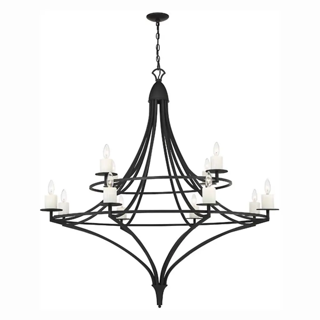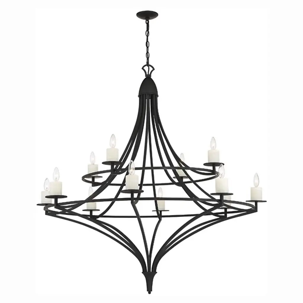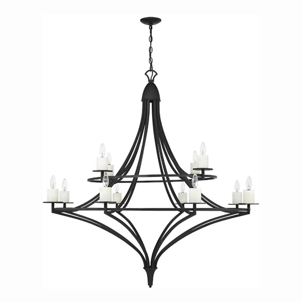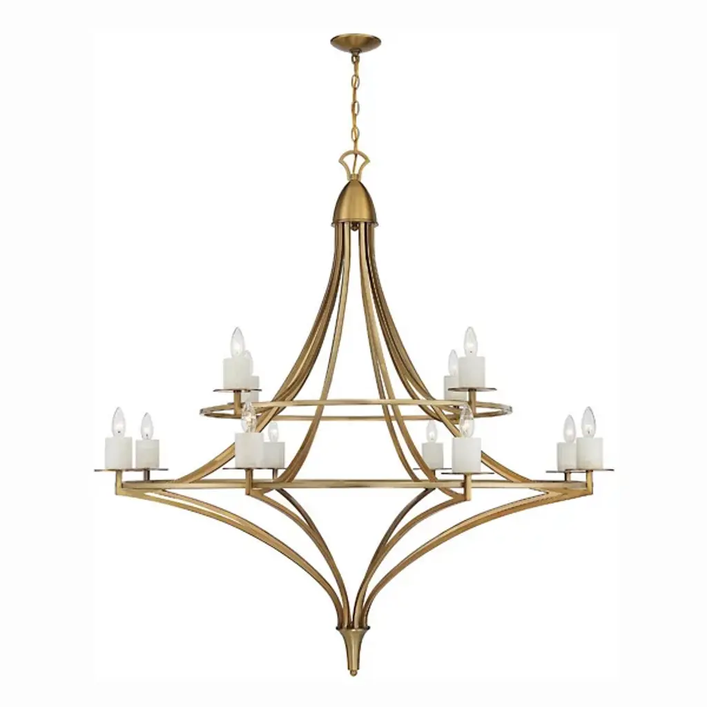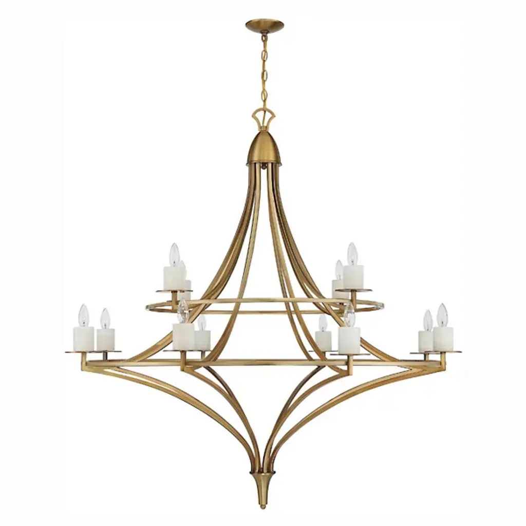 Transitionally designed with a fluid composition. Savoy House presented the Director Chandelier. The entire piece drops from an adjustable chain link from a canopy attached to the ceiling. The bodice slopes down and tucks back in the bottom, evoking a subtle diamond silhouette. Each tier features squat faux candelabra bases for a touch of elegant whimsy. It’s a visually striking chandelier that draws from mid-mod influence while maintaining a timeless appeal.