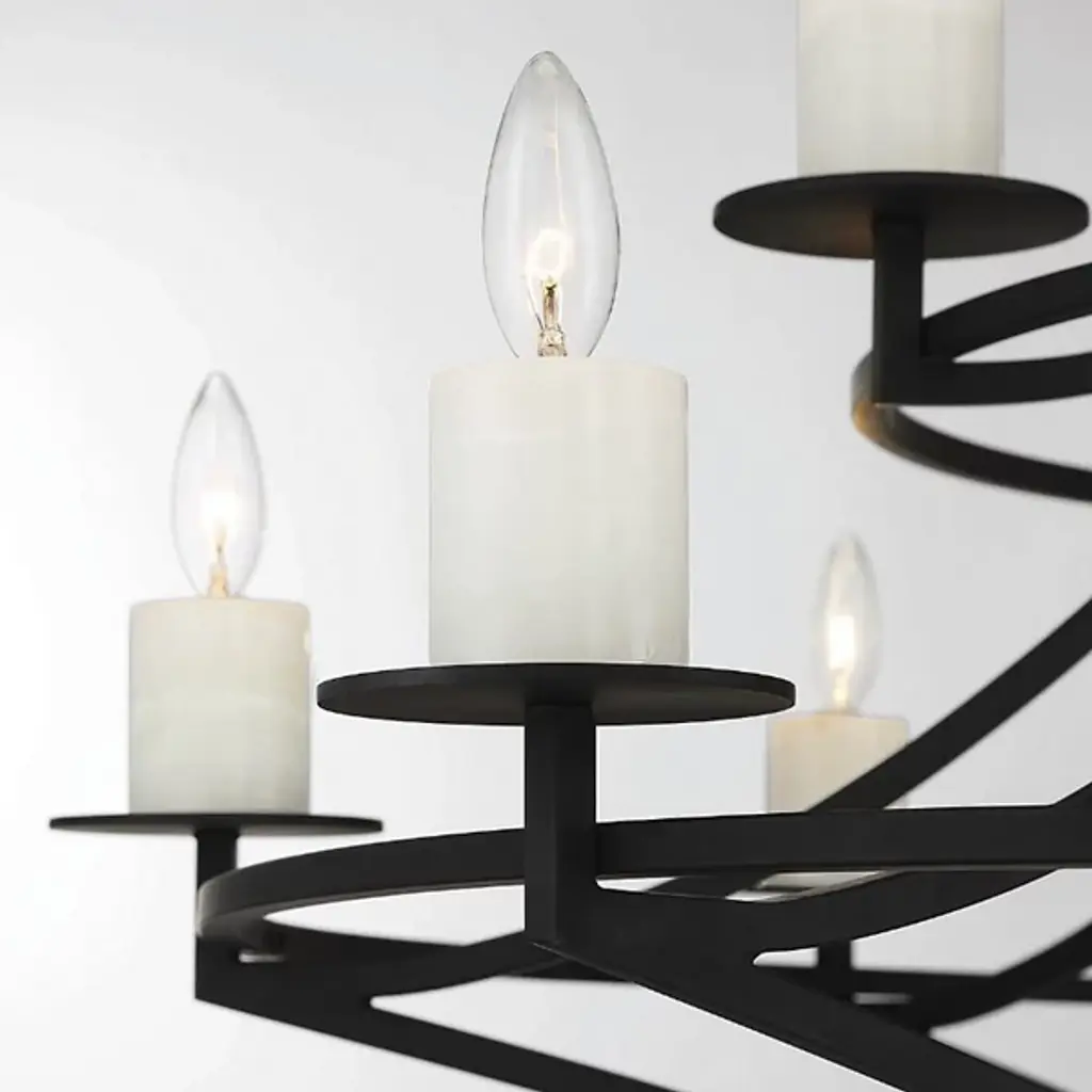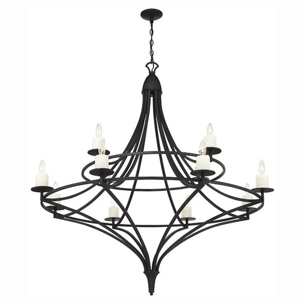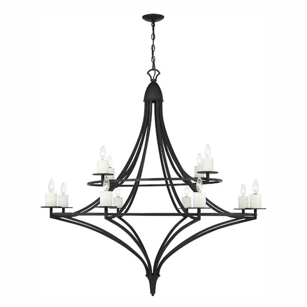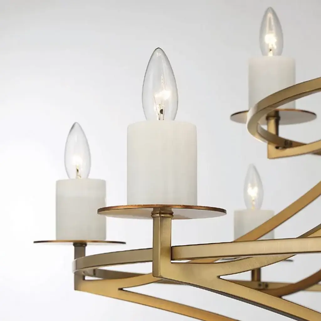 Transitionally designed with a fluid composition. Savoy House presented the Director Chandelier. The entire piece drops from an adjustable chain link from a canopy attached to the ceiling. The bodice slopes down and tucks back in the bottom, evoking a subtle diamond silhouette. Each tier features squat faux candelabra bases for a touch of elegant whimsy. It’s a visually striking chandelier that draws from mid-mod influence while maintaining a timeless appeal.