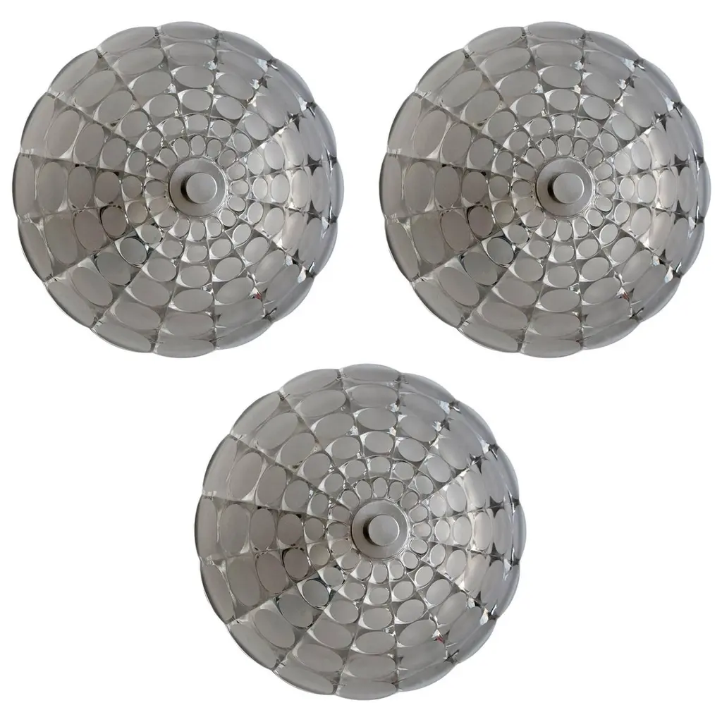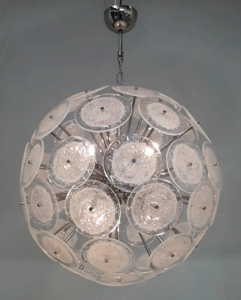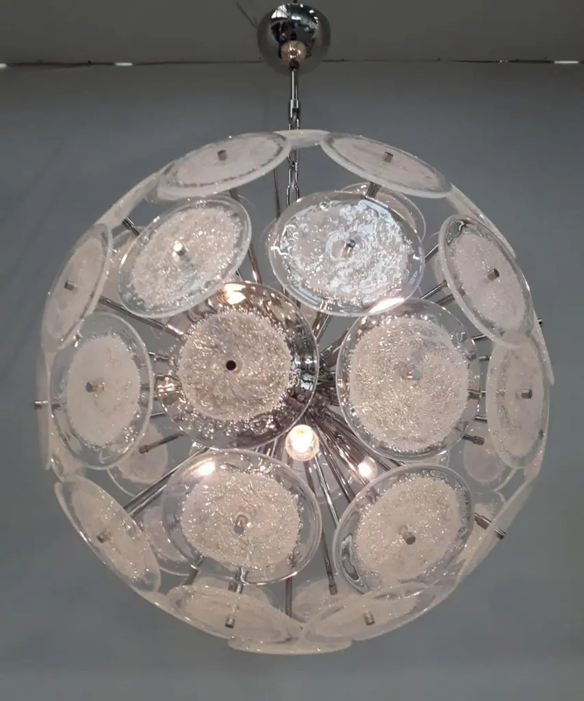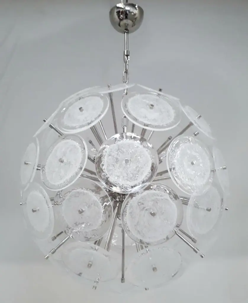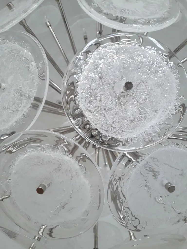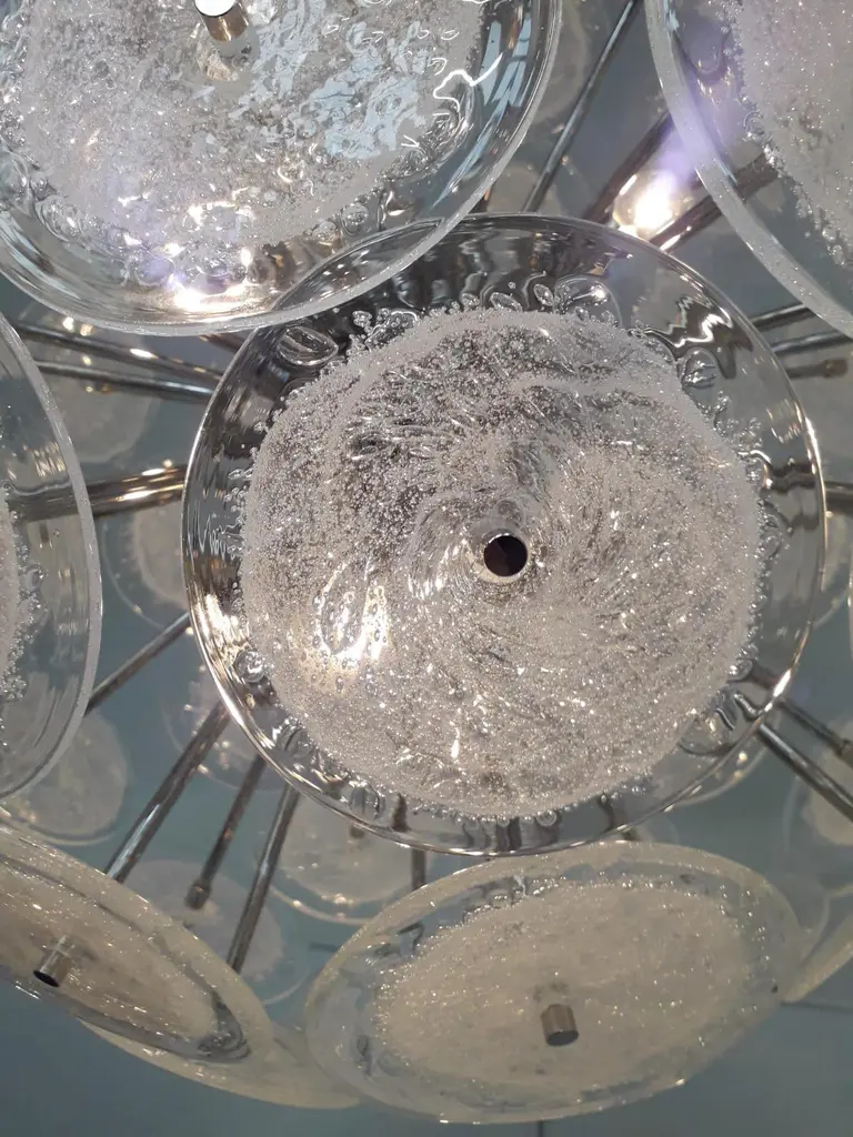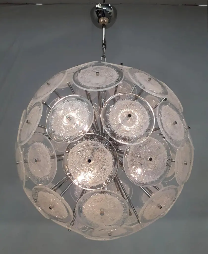 Italian round Sputnik chandelier with clear Murano glass discs hand blown with bubbles using Pulegoso technique, mounted on nickel metal finish frame, by Fabio Ltd, made in Italy6 lights / E12 or E14 type / max 40W eachMeasures: Diameter 27.5 inches, height 27.5 inches plus chain and canopyOrder only / this item ships from ItalyOrder reference #: FABIOLTD C941.