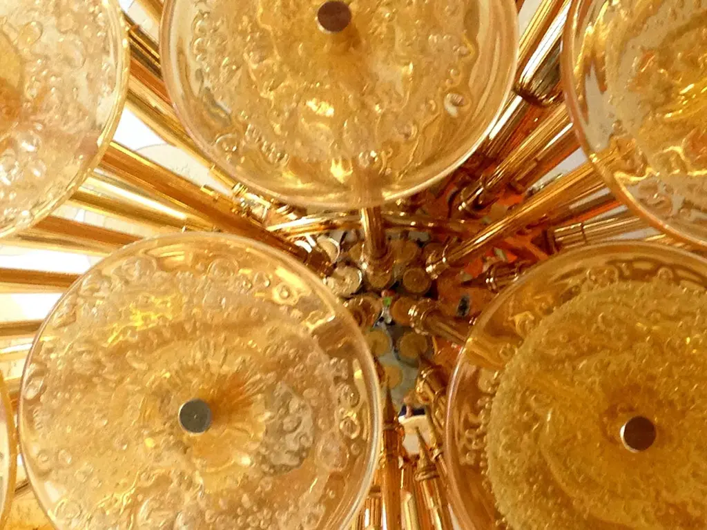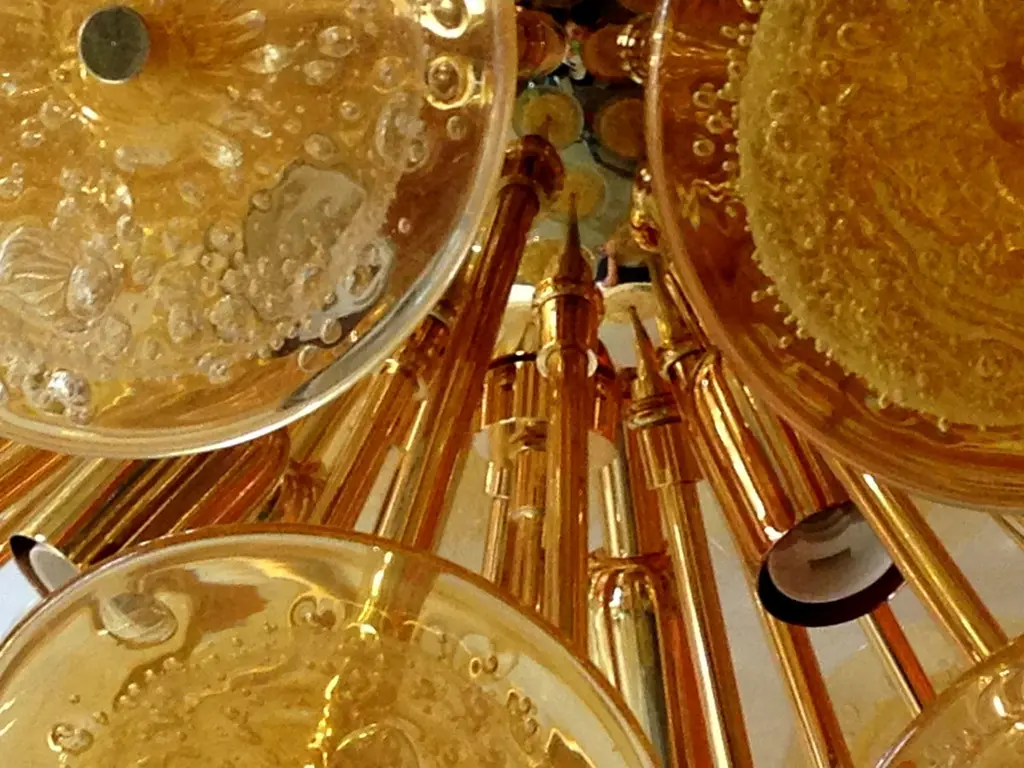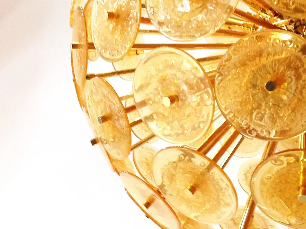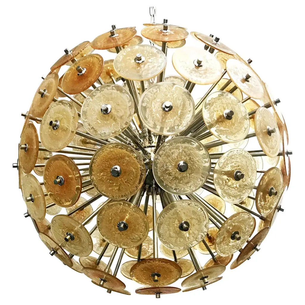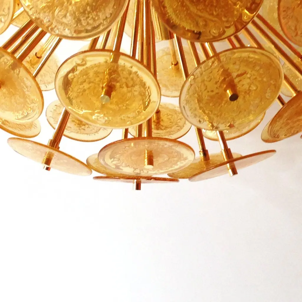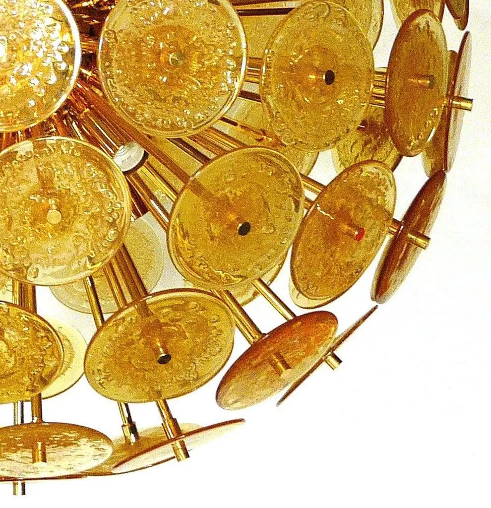 Italian round sputnik chandelier with amber Murano glass discs blown with bubbles using Pulegoso technique, mounted on 24-karat gold-plated metal frame by Fabio Ltd / Made in Italy12 lights / E26 or E27 type / max 60W eachMeasures: Diameter 37.5 inches / height 37.5 inches plus chain and canopyOrder only / This item ships from ItalyOrder reference #: FABIOLTD VADM