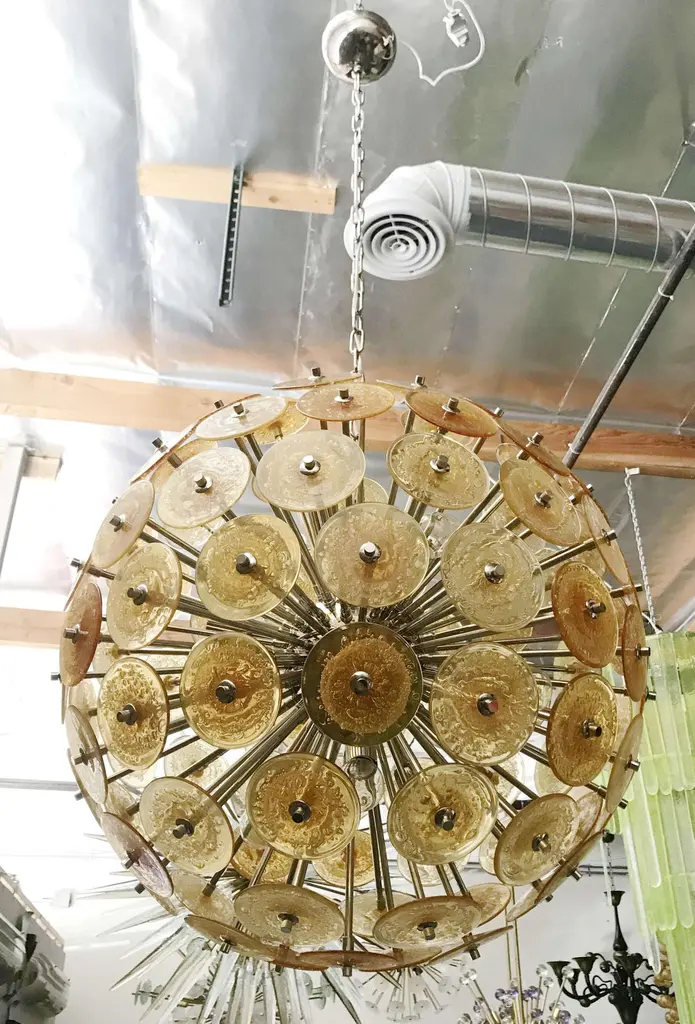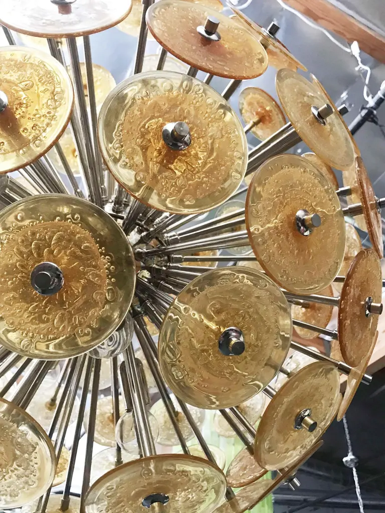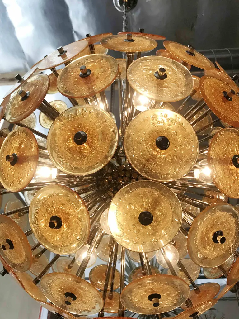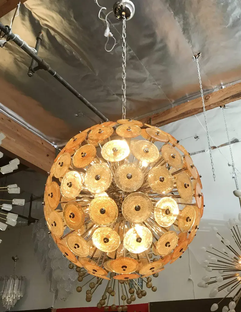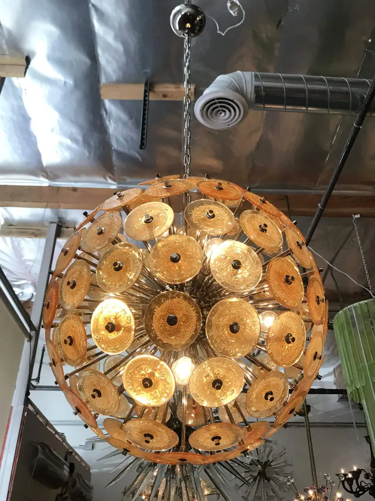 Italian round Sputnik chandelier with amber Murano glass discs hand blown with bubbles using Pulegoso technique, mounted on nickel metal finish frame, by Fabio Ltd, made in Italy12 lights / E12 or E14 type / max 40W eachMeasures: Diameter 37.5 inches, height 37.5 inches plus chain and canopyOrder only, this item ships from ItalyOrder reference #: FABIOLTD C645