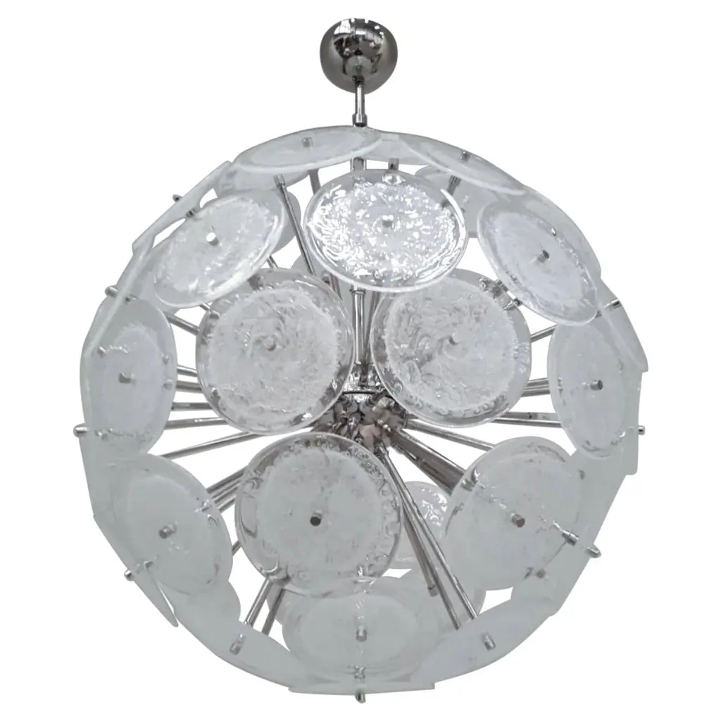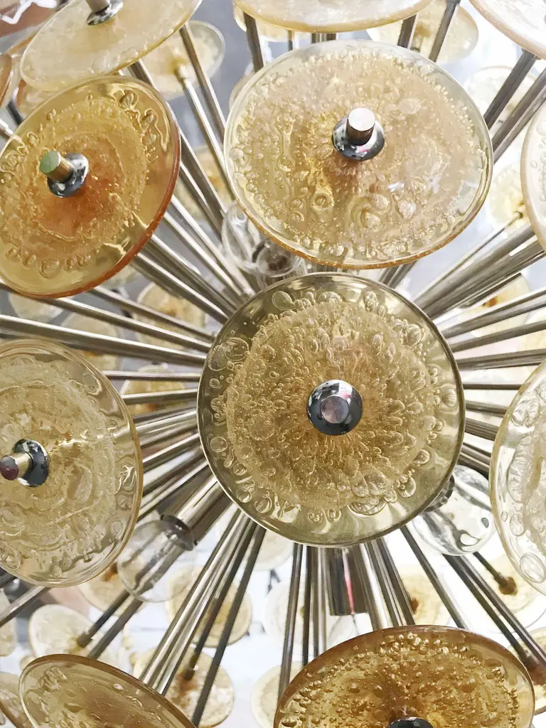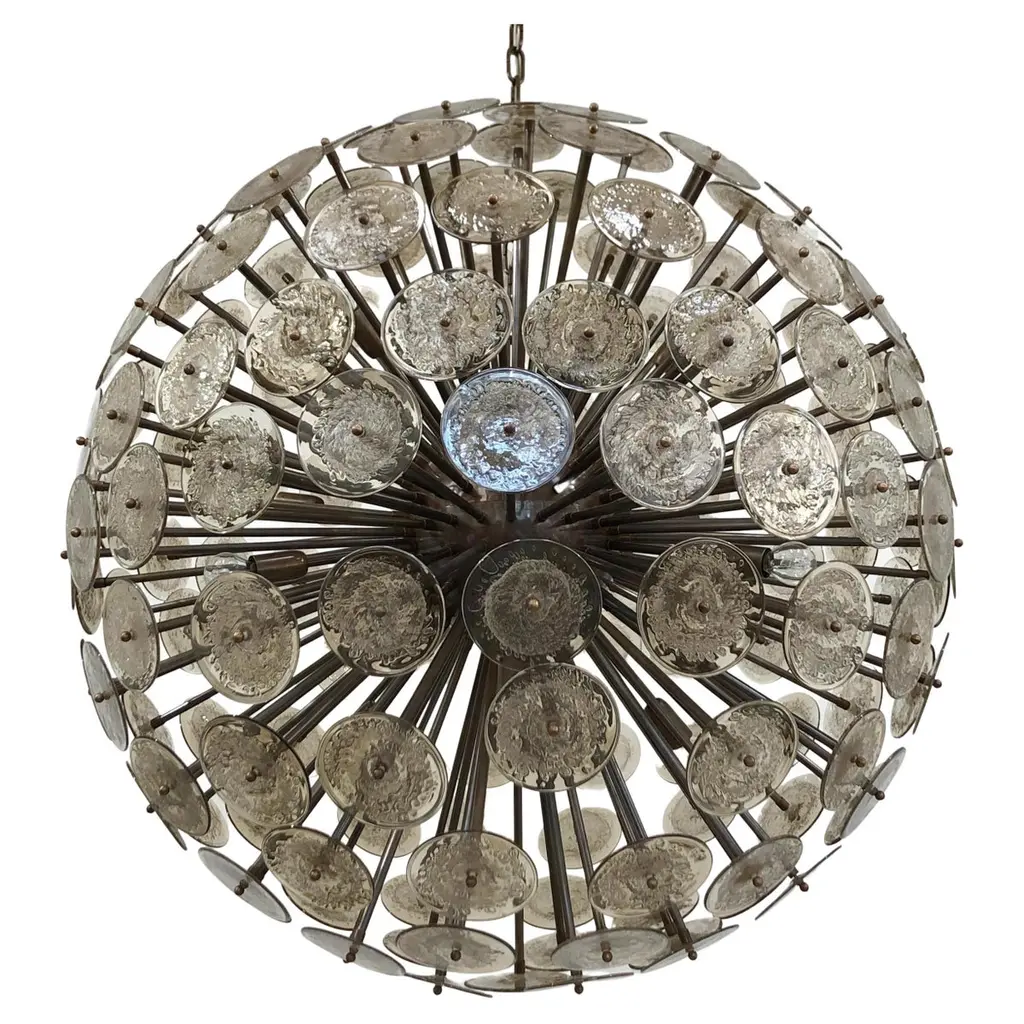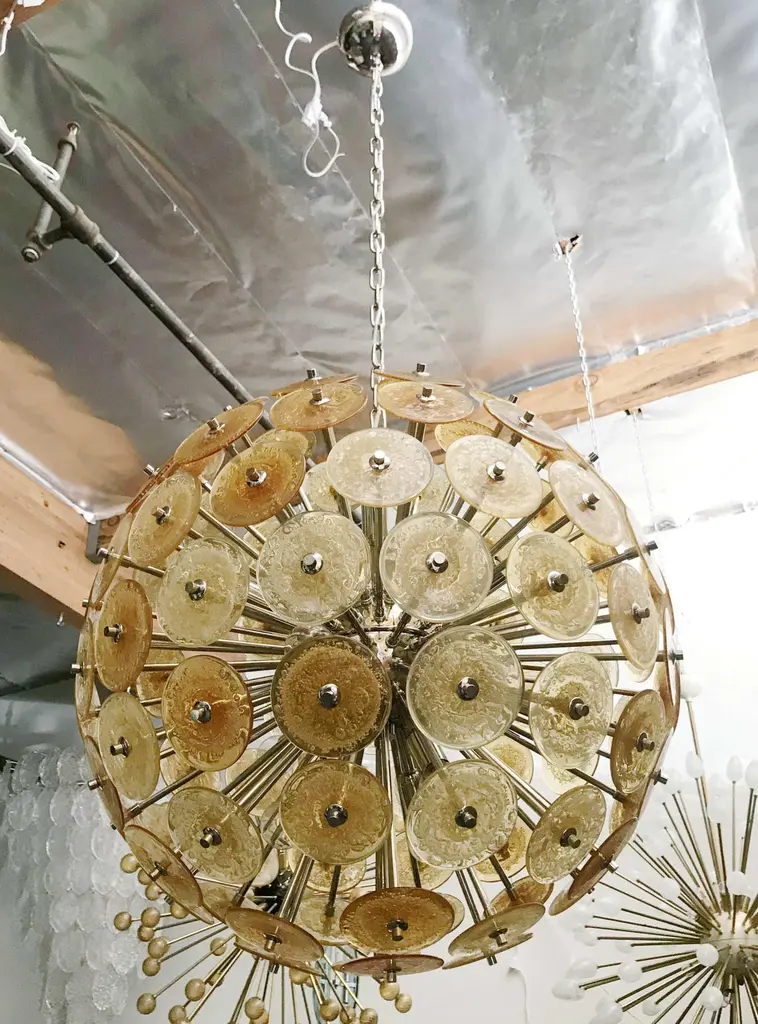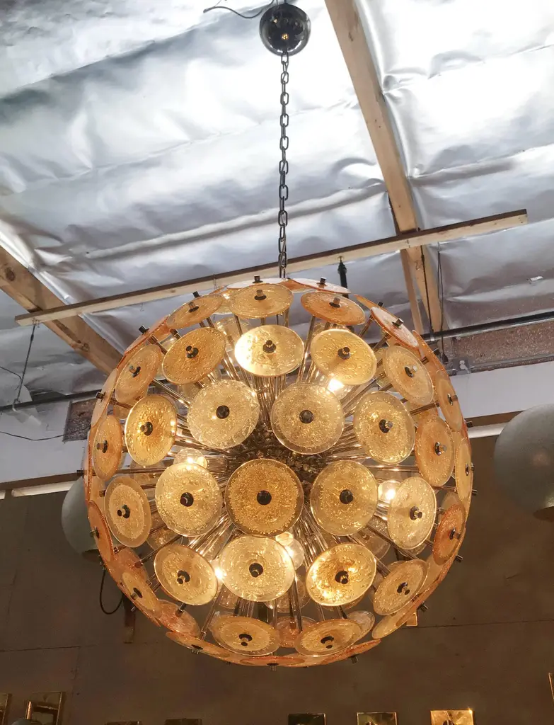 Italian round Sputnik chandelier with amber Murano glass discs hand blown with bubbles using Pulegoso technique, mounted on nickel metal finish frame, by Fabio Ltd, made in Italy12 lights / E12 or E14 type / max 40W eachMeasures: Diameter 37.5 inches, height 37.5 inches plus chain and canopyOrder only, this item ships from ItalyOrder reference #: FABIOLTD C645