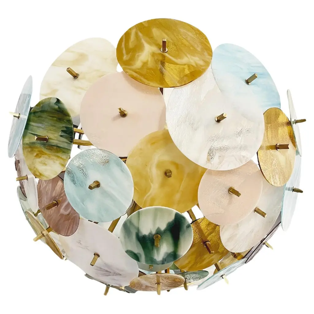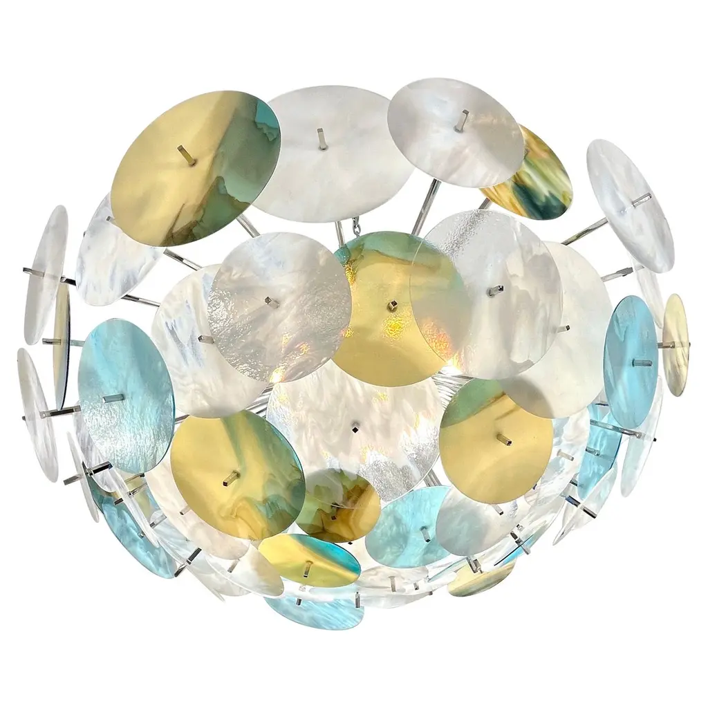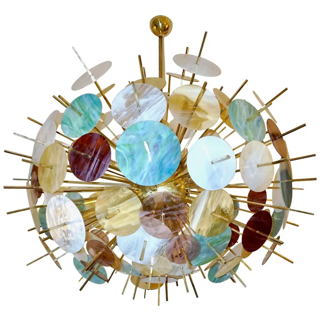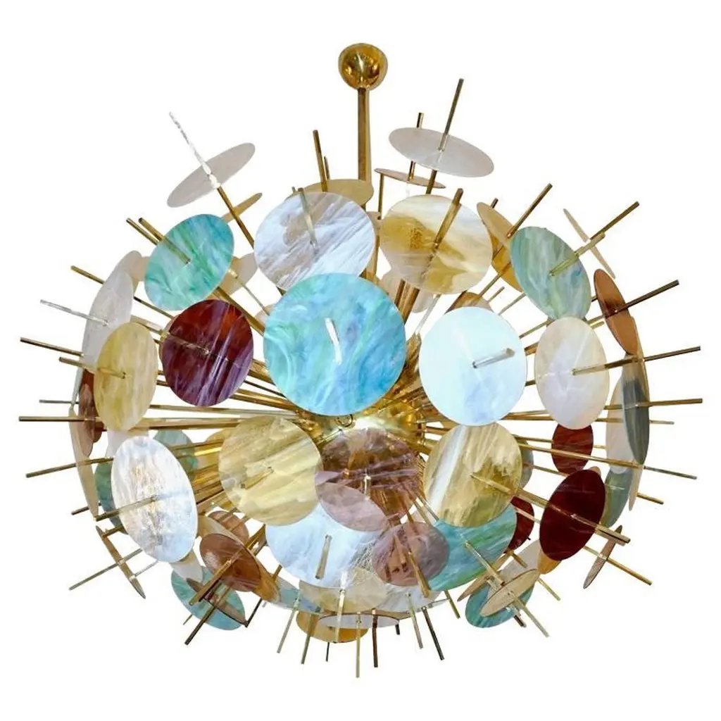 Italian round Sputnik chandelier with amber Murano glass discs hand blown with bubbles using Pulegoso technique, mounted on nickel metal finish frame, by Fabio Ltd, made in Italy12 lights / E12 or E14 type / max 40W eachMeasures: Diameter 37.5 inches, height 37.5 inches plus chain and canopyOrder only, this item ships from ItalyOrder reference #: FABIOLTD C645