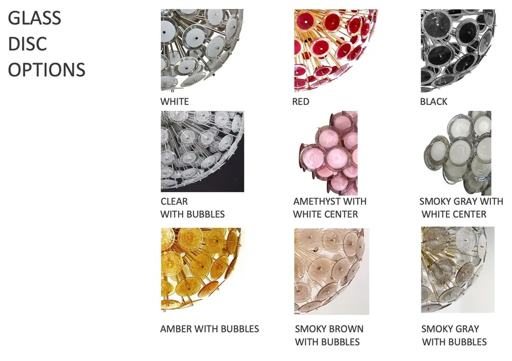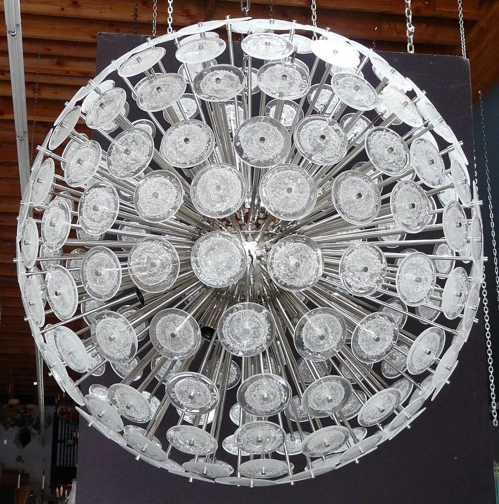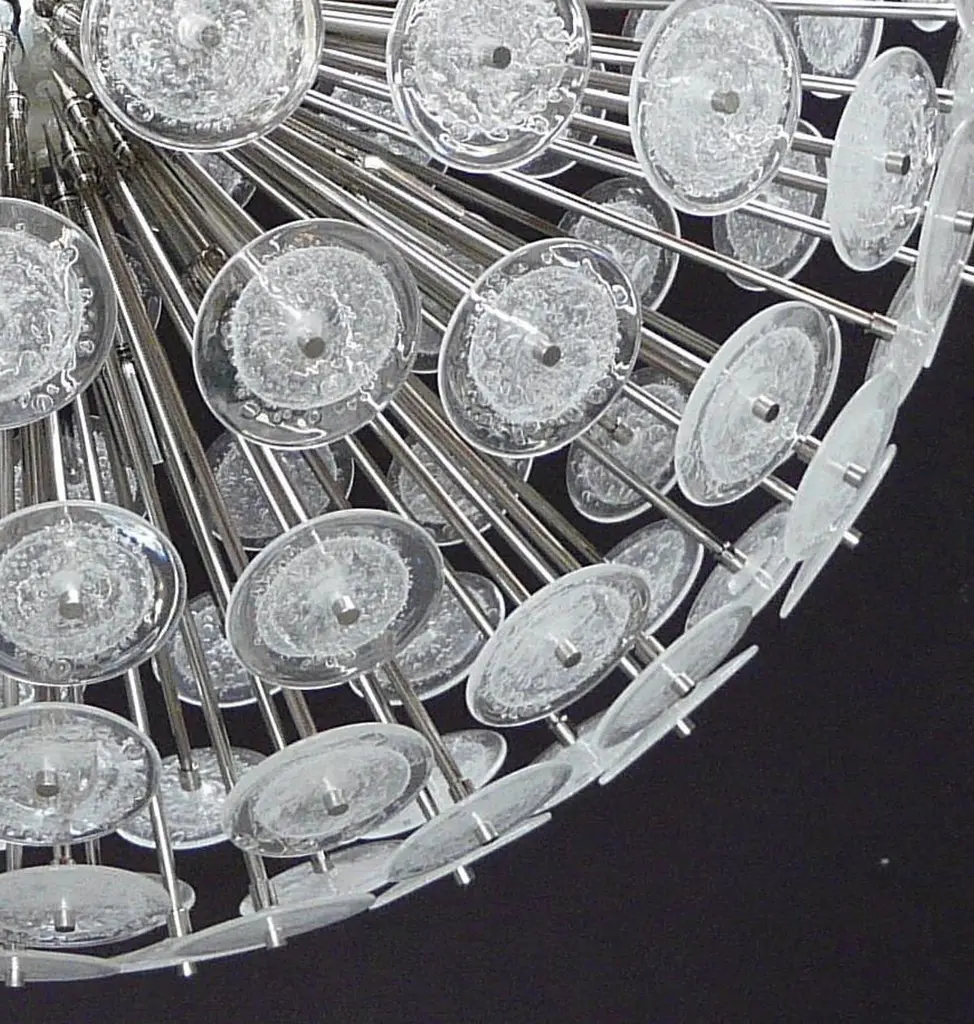 Italian round sputnik chandelier with clear Murano glass discs hand blown with bubbles using Pulegoso technique, mounted on nickel finish metal frame by Fabio Ltd / Made in Italy16 lights / E26 or E27 type / max 60W eachMeasures: Diameter 43.5 inches, height 43.5 inches plus chain and canopyOrder only / This item ships from ItalyOrder reference #: FABIOLTD VPDL