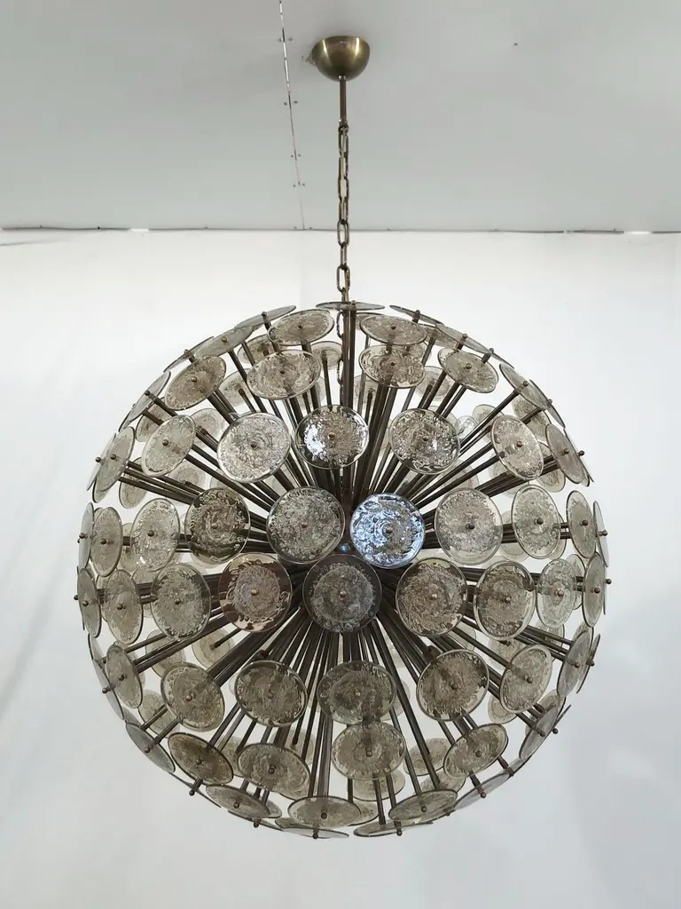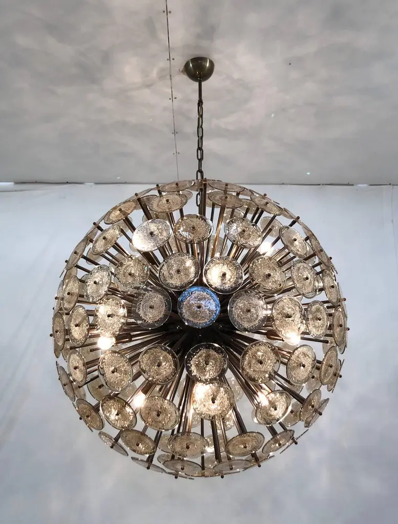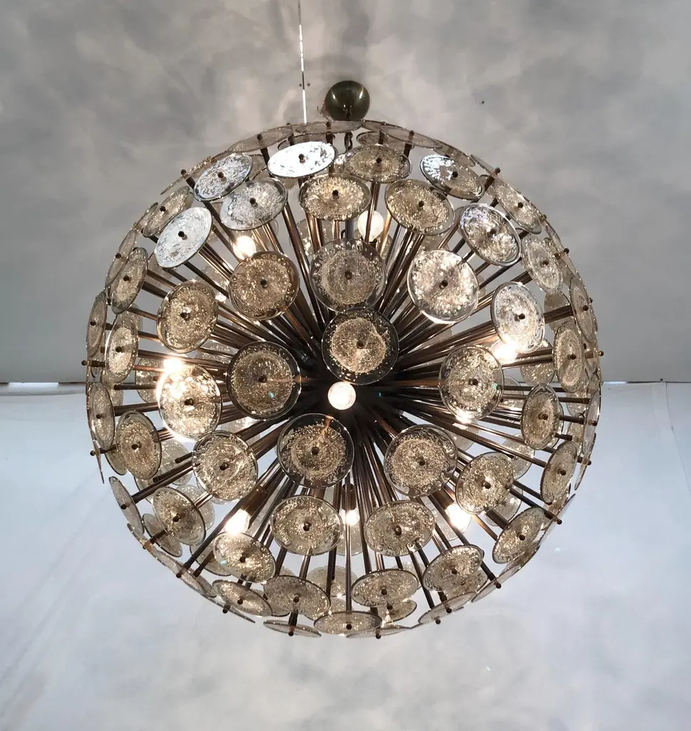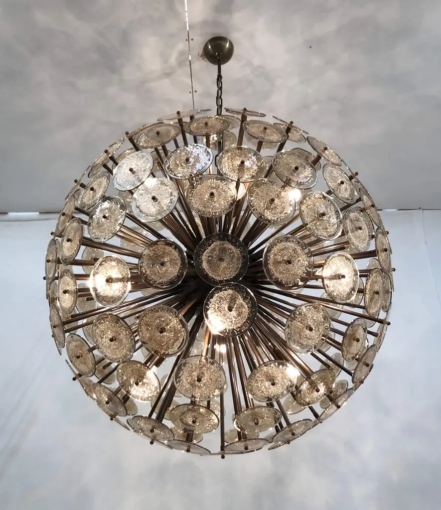 Italian round sputnik chandelier with smoky brown Murano glass discs hand blown with bubbles using Pulegoso technique, mounted on dark bronzed frame, by Fabio Ltd / Made in Italy16 lights / E26 or E27 type / max 60W eachMeasures: Diameter 43.5 inches, height 43.5 inches plus chain and canopyOrder only / This item ships from Italy.