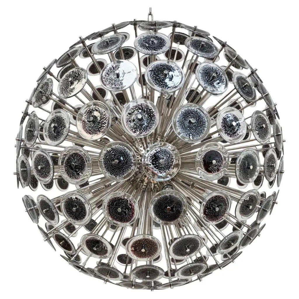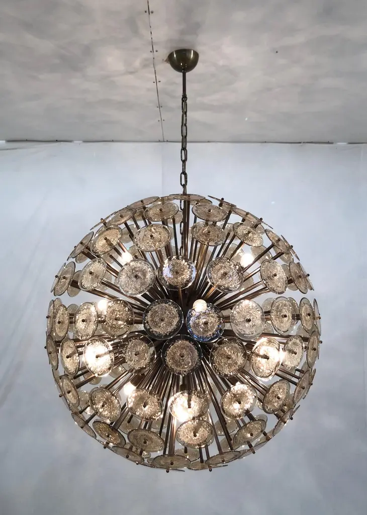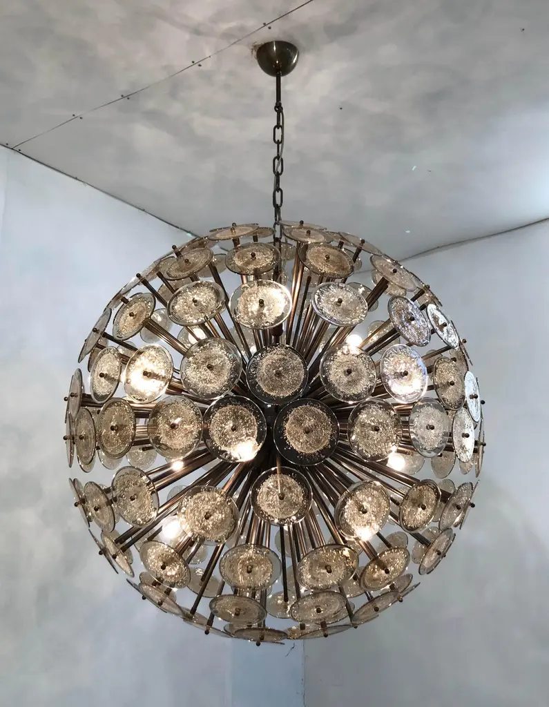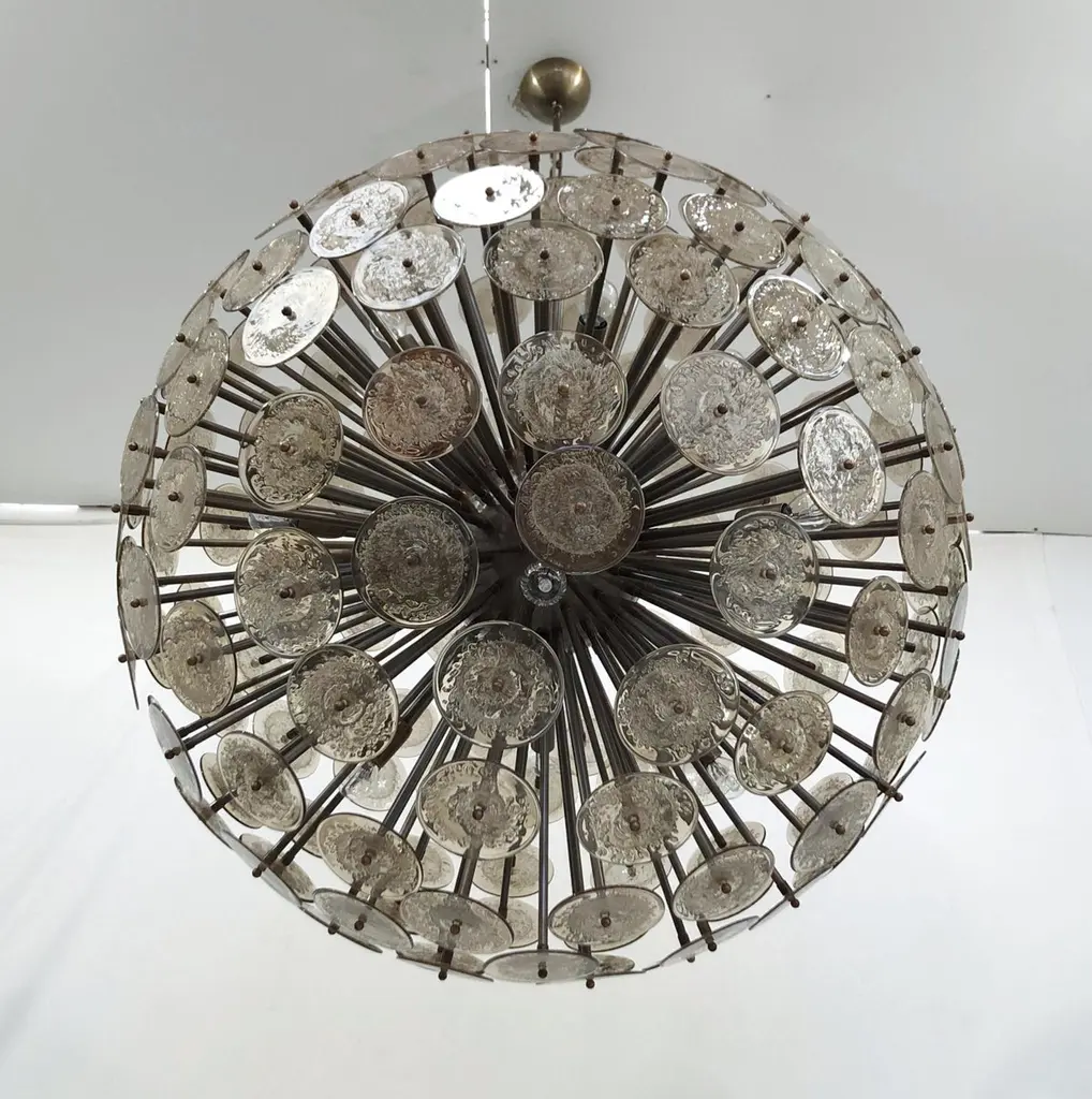 Italian round sputnik chandelier with smoky brown Murano glass discs hand blown with bubbles using Pulegoso technique, mounted on dark bronzed frame, by Fabio Ltd / Made in Italy16 lights / E26 or E27 type / max 60W eachMeasures: Diameter 43.5 inches, height 43.5 inches plus chain and canopyOrder only / This item ships from Italy.