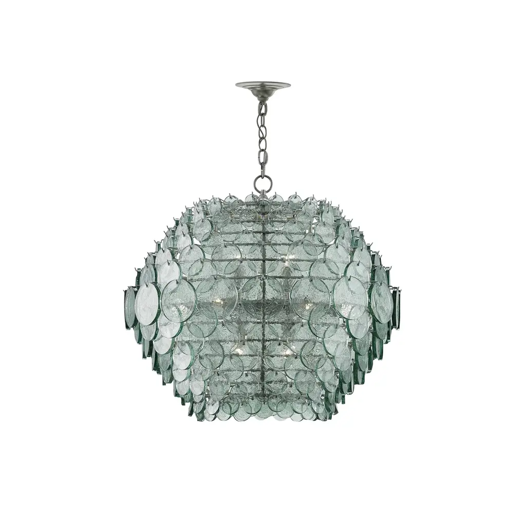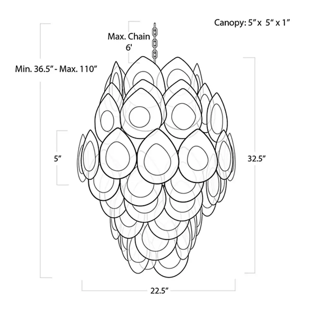The Diva Chandelier by Regina Andrew is a statement-worthy addition to spaces with a big presence. Suspended from a linked chain, a collection of teardrop-shaped glass discs with milky centers are layered together to create a tapered silhouette that has a delicate yet substantial feel. The layered glass and variation in opaqueness allow this chandelier to lend a softly filtered, welcoming layer of illumination to surroundings while bringing its dynamic build to life.