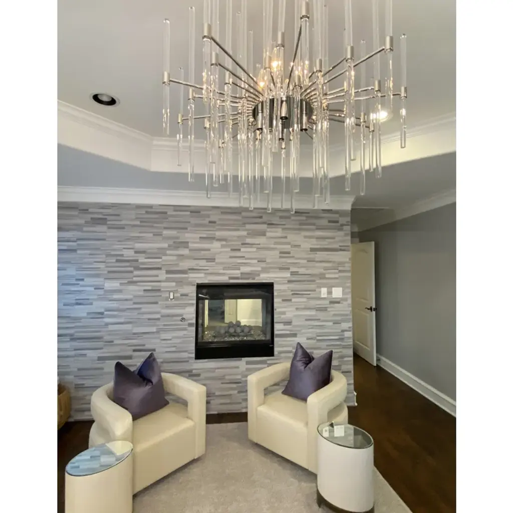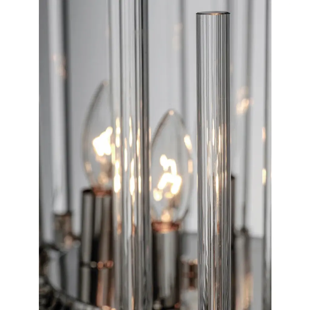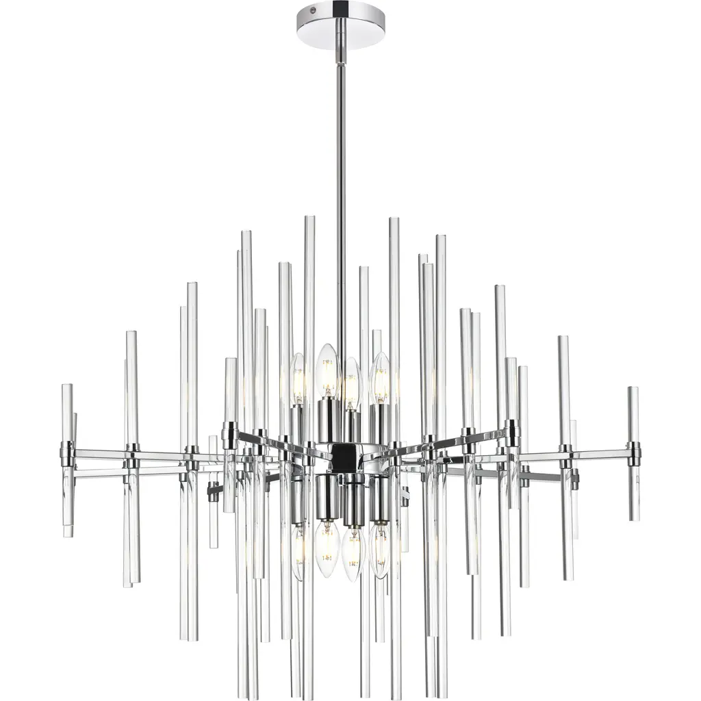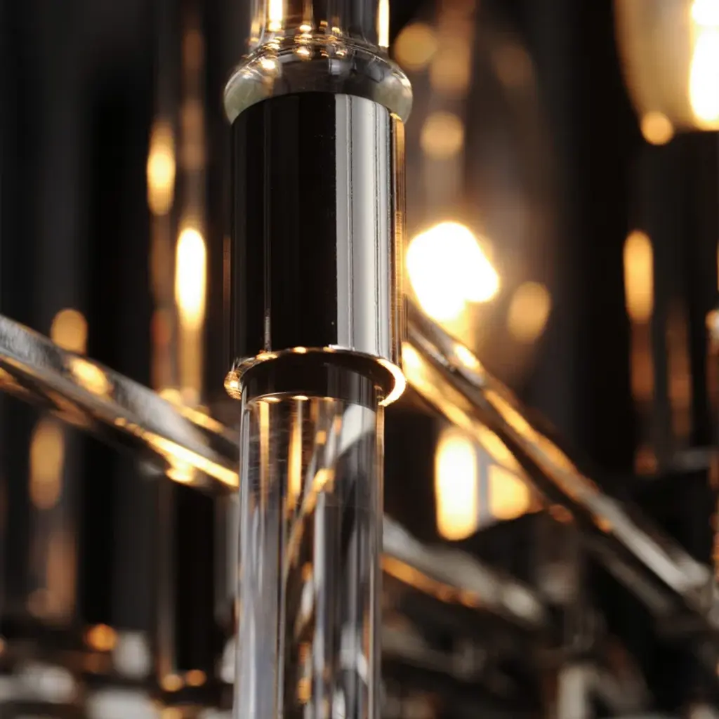 Streamlined forms create an unexpectedly lavish effect in this modern chandelier. Its eight lights are refracted through a nimbus of clear glass rods held at varying heights + lengths by slim steel arms in a polished finish. The smaller size makes a statement without overwhelming your space.