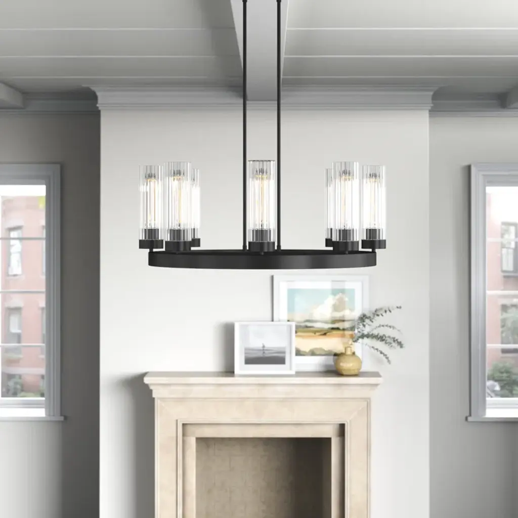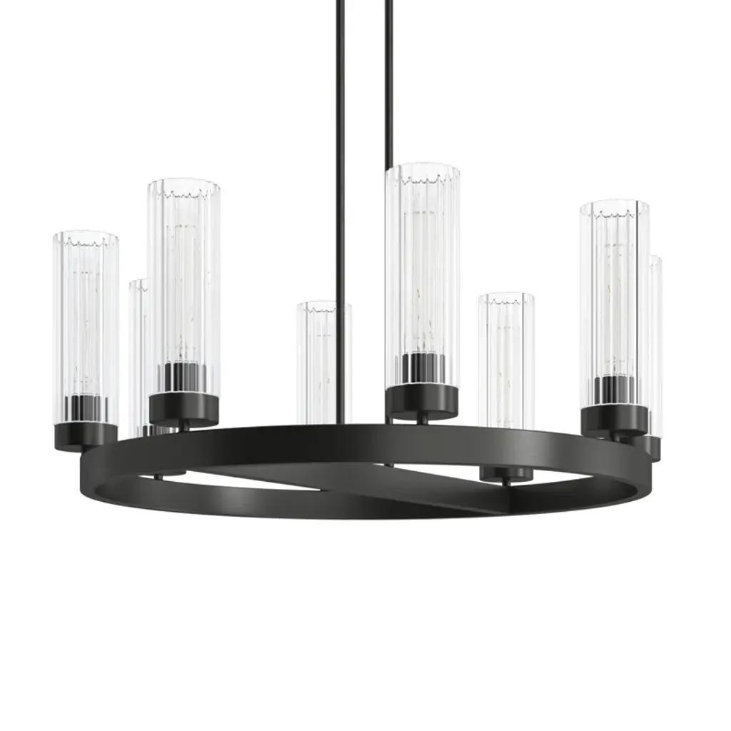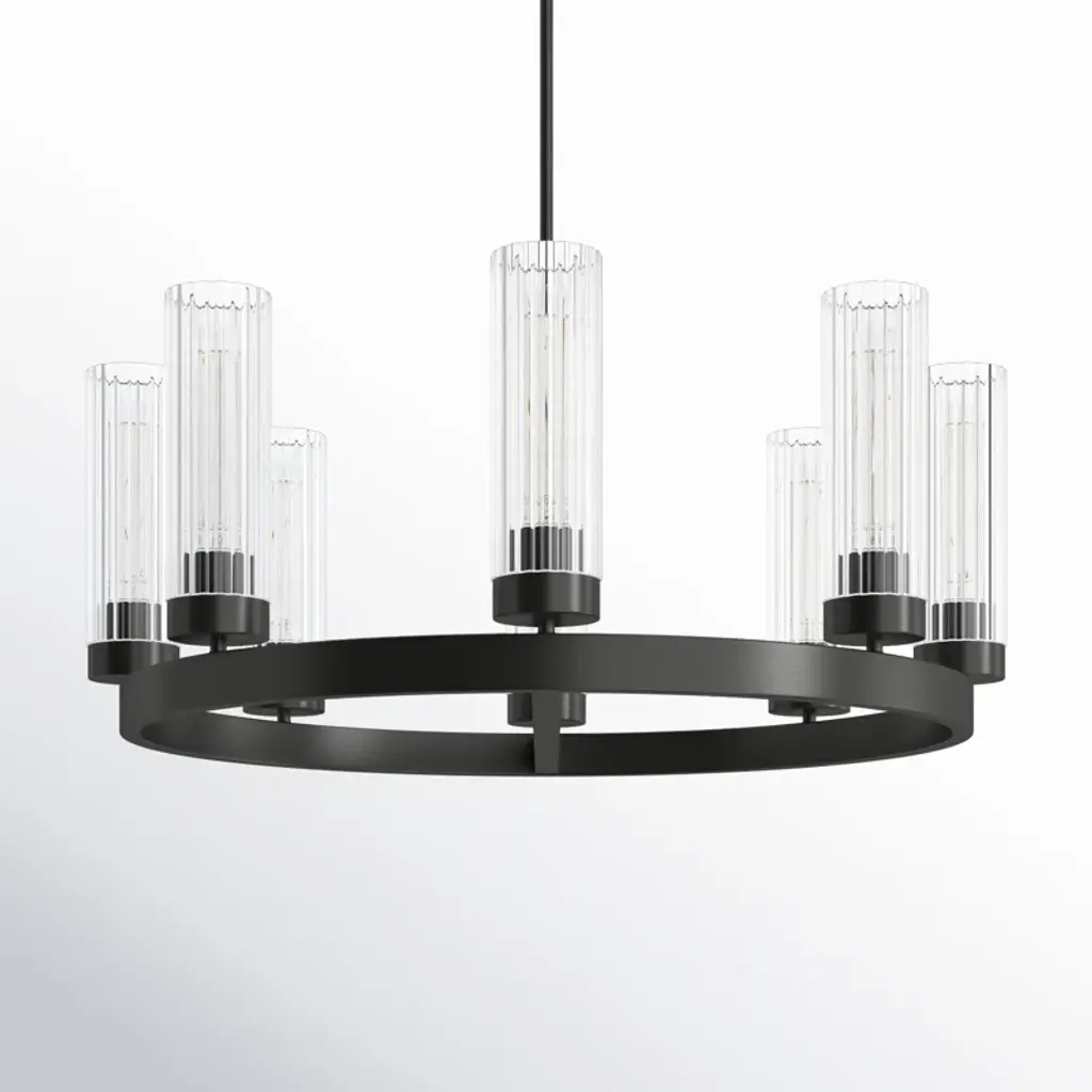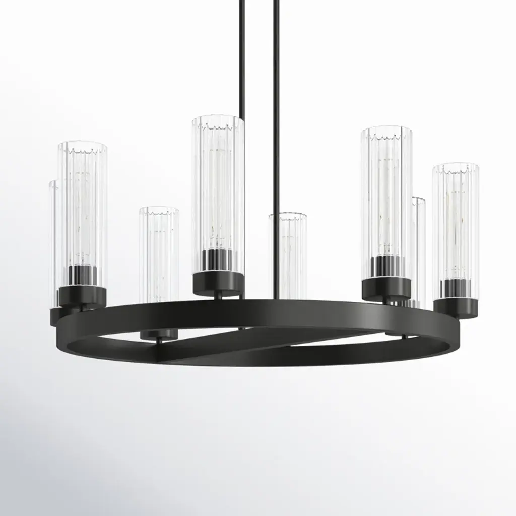 This 8-light chandelier combines the best aspects of old-world charm with sleek, modern minimalism. The frame is made from metal and hangs from a sloped ceiling-compatible canopy and two lengths of adjustable height downrod. Eight striated blown glass shades add an artisanal touch that works in contrast to the crisp feel of the metal's iron graphite finish. Best of all, this fixture is compatible with dimmer switches, so it's great for adding a warm glow to your entryway or setting the mood for a fancy dinner. It accommodates eight 60W bulbs (sold separately).