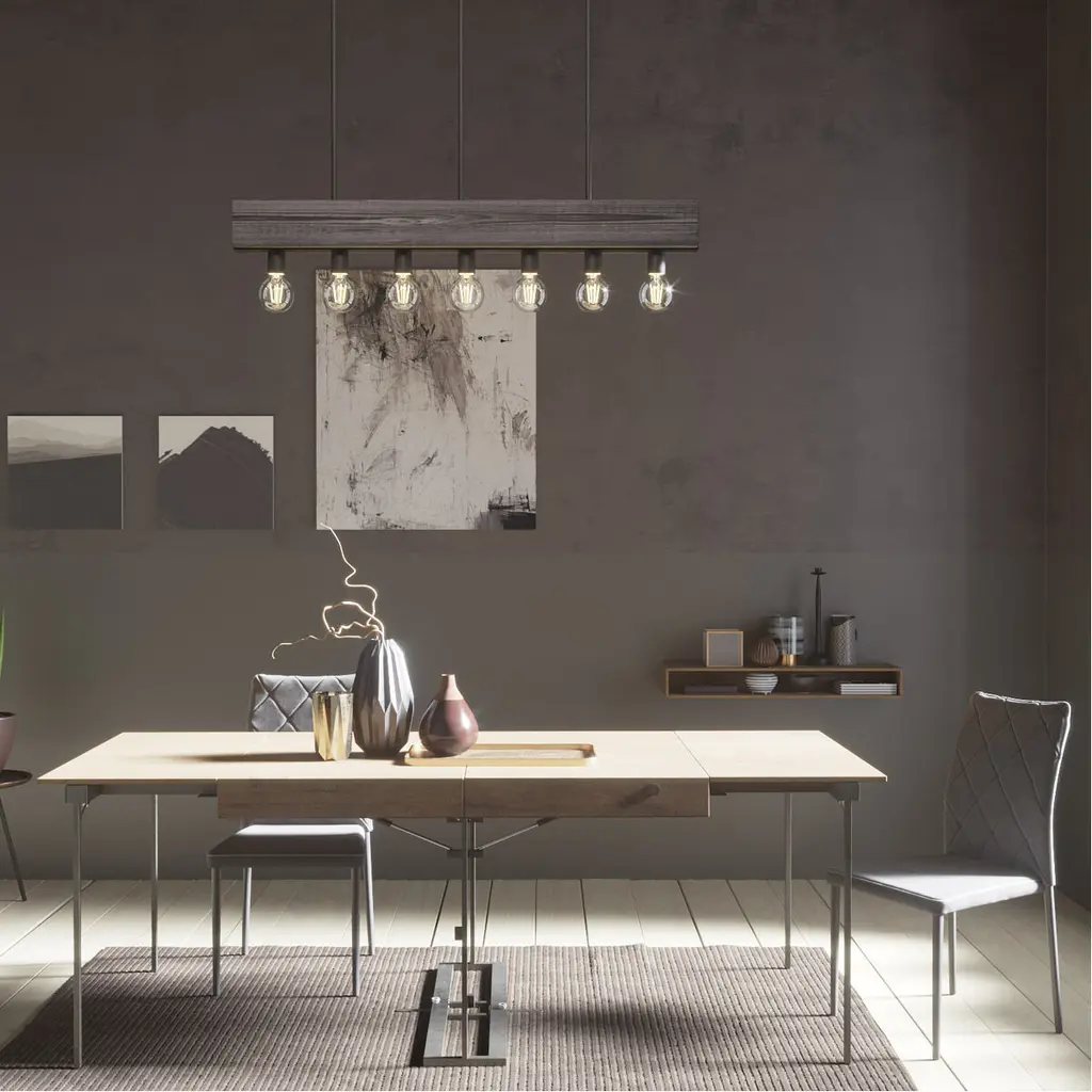 The ironwork detailing and application of real wood on the Donelson 7 Light Linear Chandelier gives it an impressive yet authentic aesthetic that shines in farmhouse and modern industrial dining room and kitchens. The exposed bulb design puts creativity in your hands when choosing the light bulbs to use.