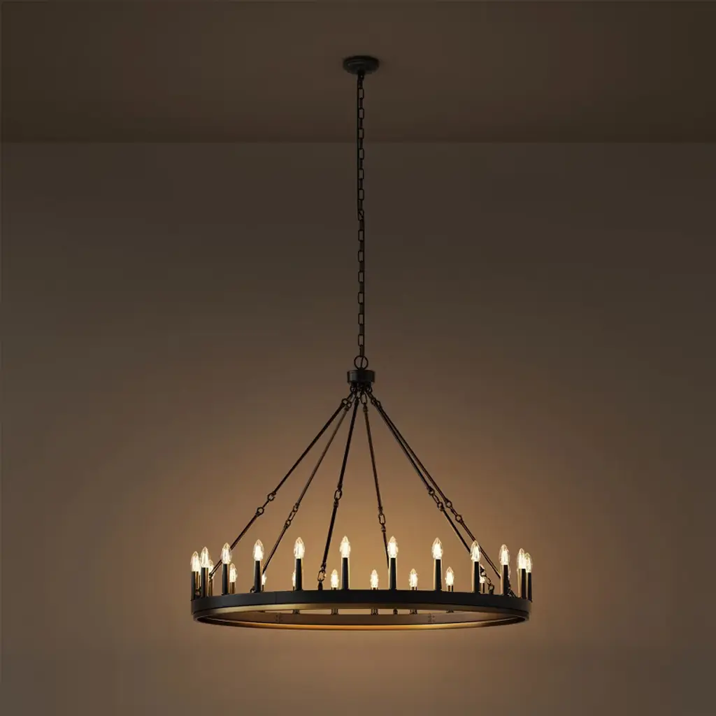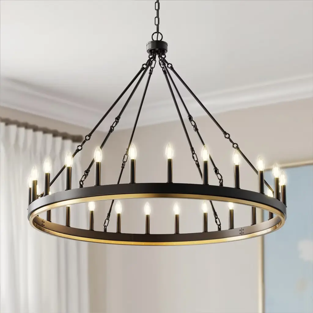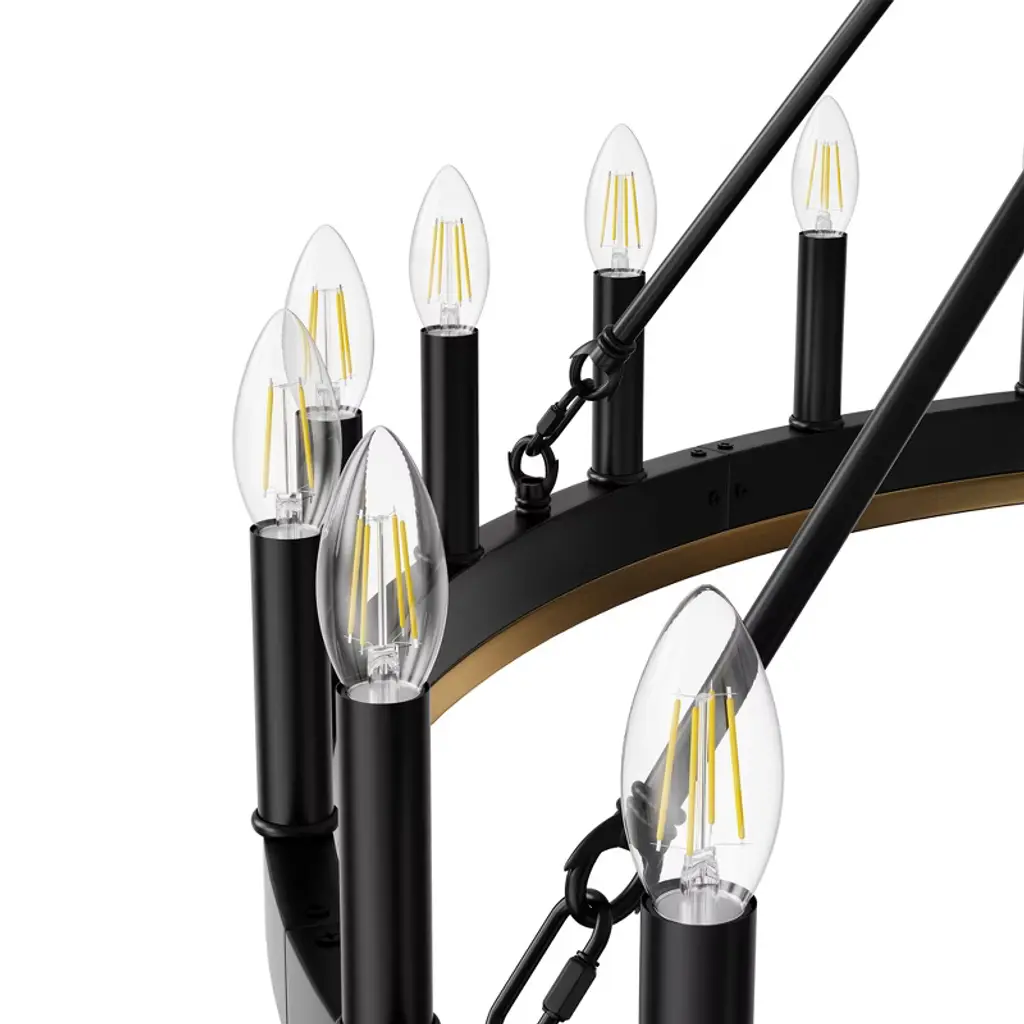 Make a grand statement with this 24-light wagon wheel chandelier featuring a striking black and gold finish that perfectly blends rustic farmhouse charm with modern elegance. Designed with a single tier and E12 sockets, this fixture offers flexibility to customize your lighting with your choice of bulbs (not included). The non-integrated design ensures easy bulb replacement and maintenance. Ideal for large dining rooms, entryways, or living spaces, this chandelier adds a bold, vintage-inspired focal point to your home d¨¦cor.