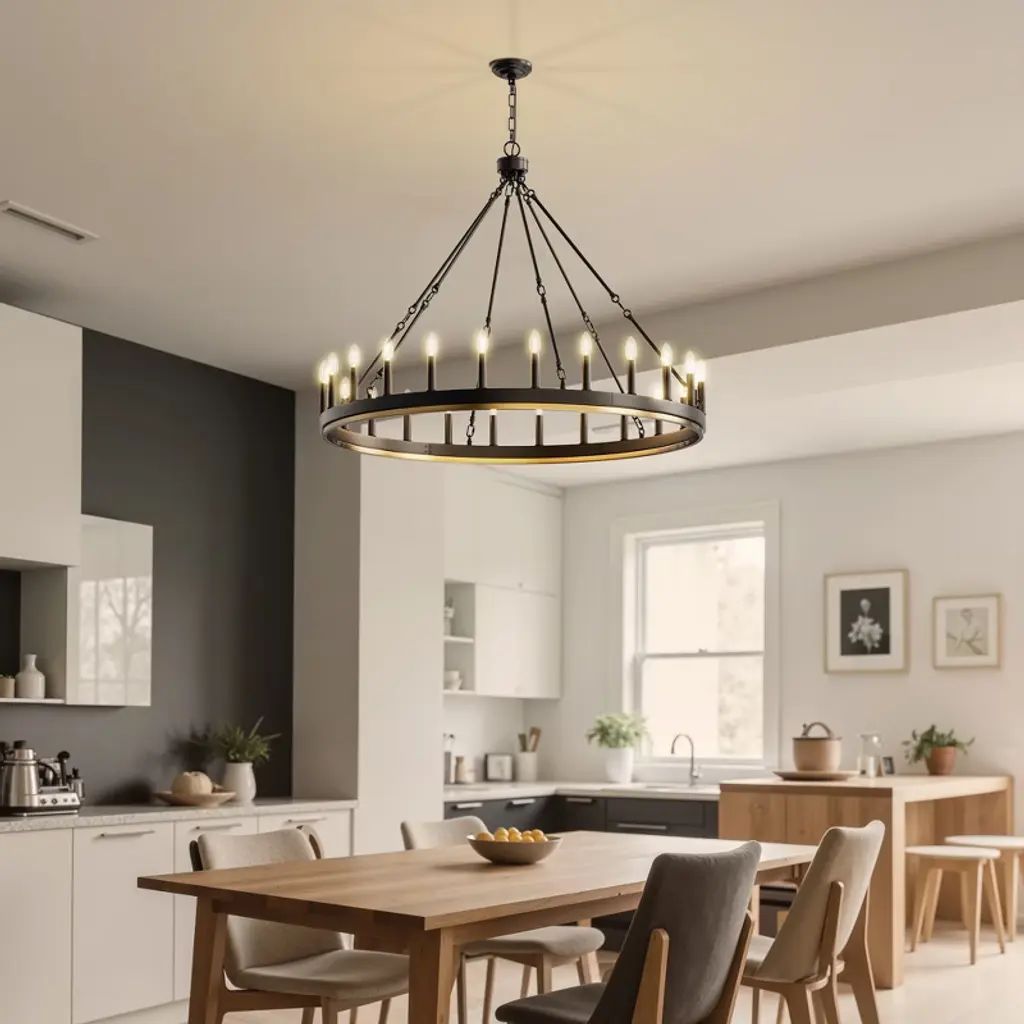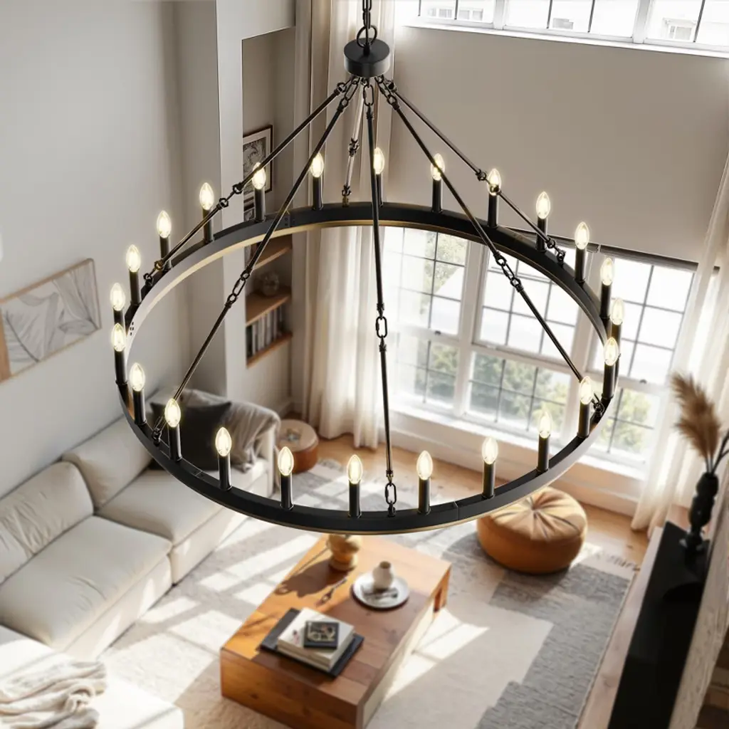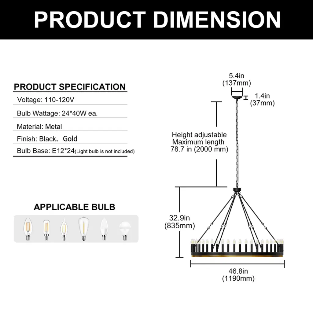 Make a grand statement with this 24-light wagon wheel chandelier featuring a striking black and gold finish that perfectly blends rustic farmhouse charm with modern elegance. Designed with a single tier and E12 sockets, this fixture offers flexibility to customize your lighting with your choice of bulbs (not included). The non-integrated design ensures easy bulb replacement and maintenance. Ideal for large dining rooms, entryways, or living spaces, this chandelier adds a bold, vintage-inspired focal point to your home d¨¦cor.