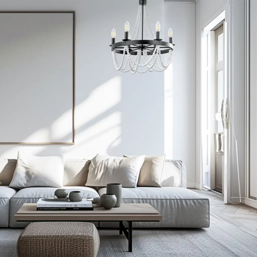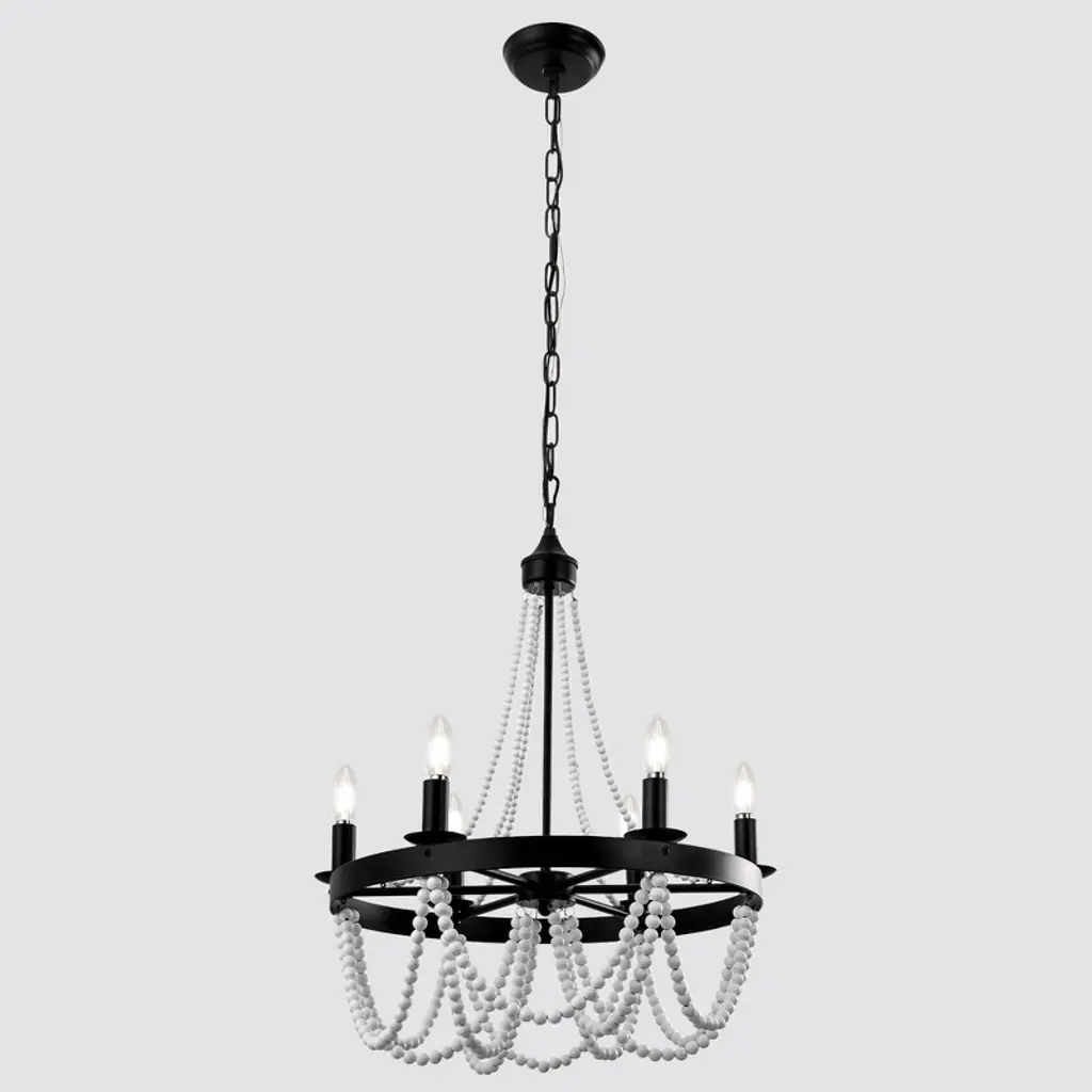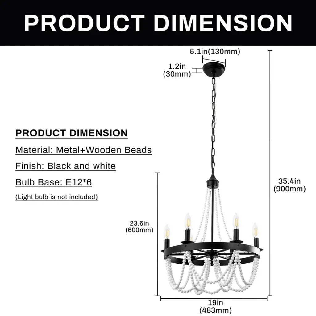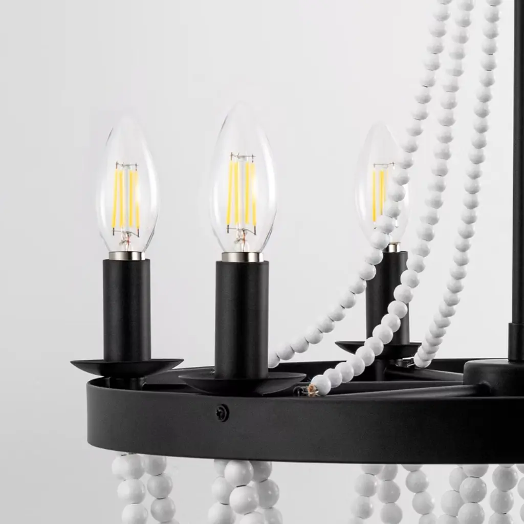 Add a blend of rustic charm and modern elegance with this 6-light matte black chandelier featuring white wooden beads and clean lines. Its striking presence makes it ideal for dining rooms, bedrooms, and kitchens. With six E12 sockets, this chandelier offers ample illumination and stylish flair. (Light Bulbs Not Included)
