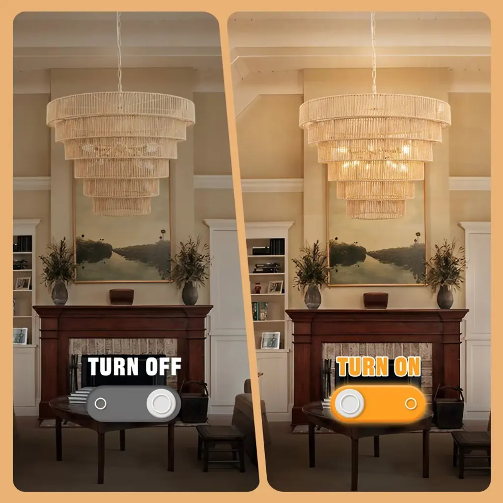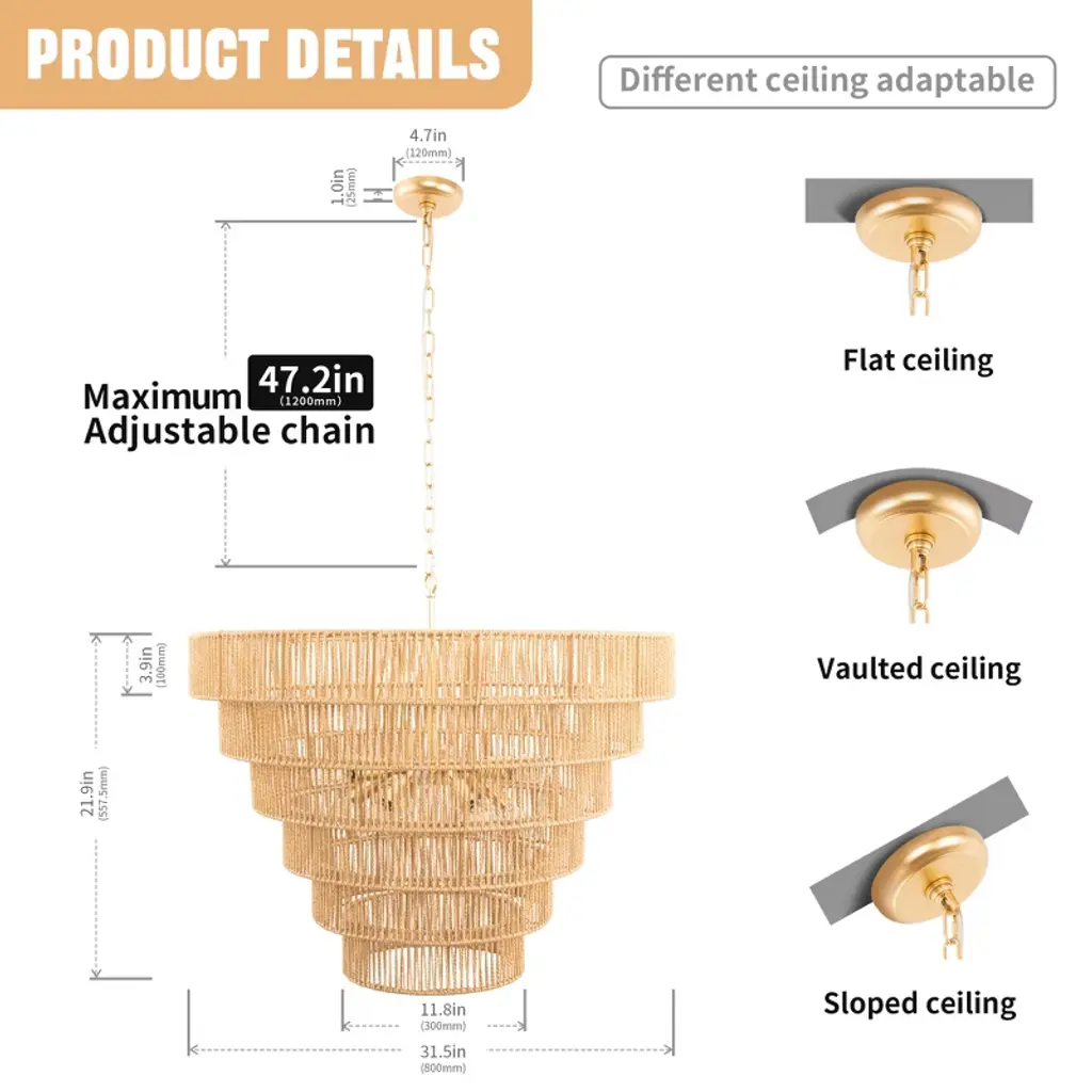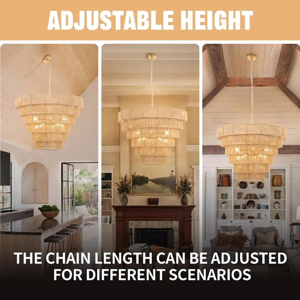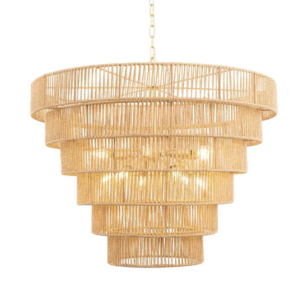 Bring a touch of bohemian elegance to your home with this 70-inch copper chandelier. Featuring 12 E12 sockets, this 5-tier chandelier is adorned with beautifully woven rattan shades, offering a warm and inviting glow. Perfect for large dining rooms, living areas, or entryways, this chandelier provides both style and function, illuminating your space while adding a unique design element to your home.