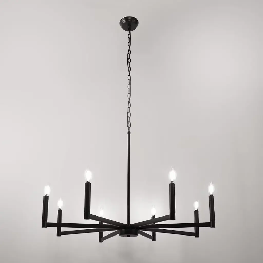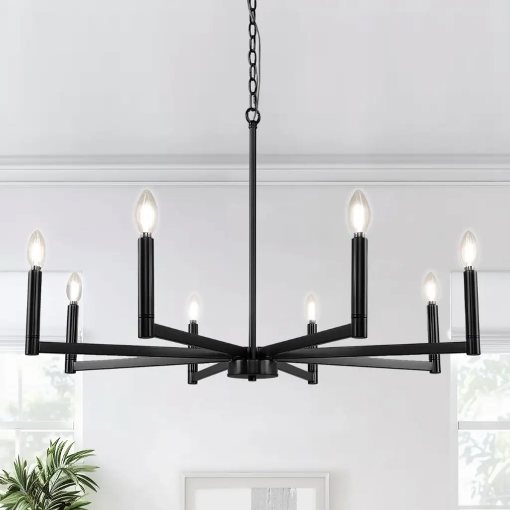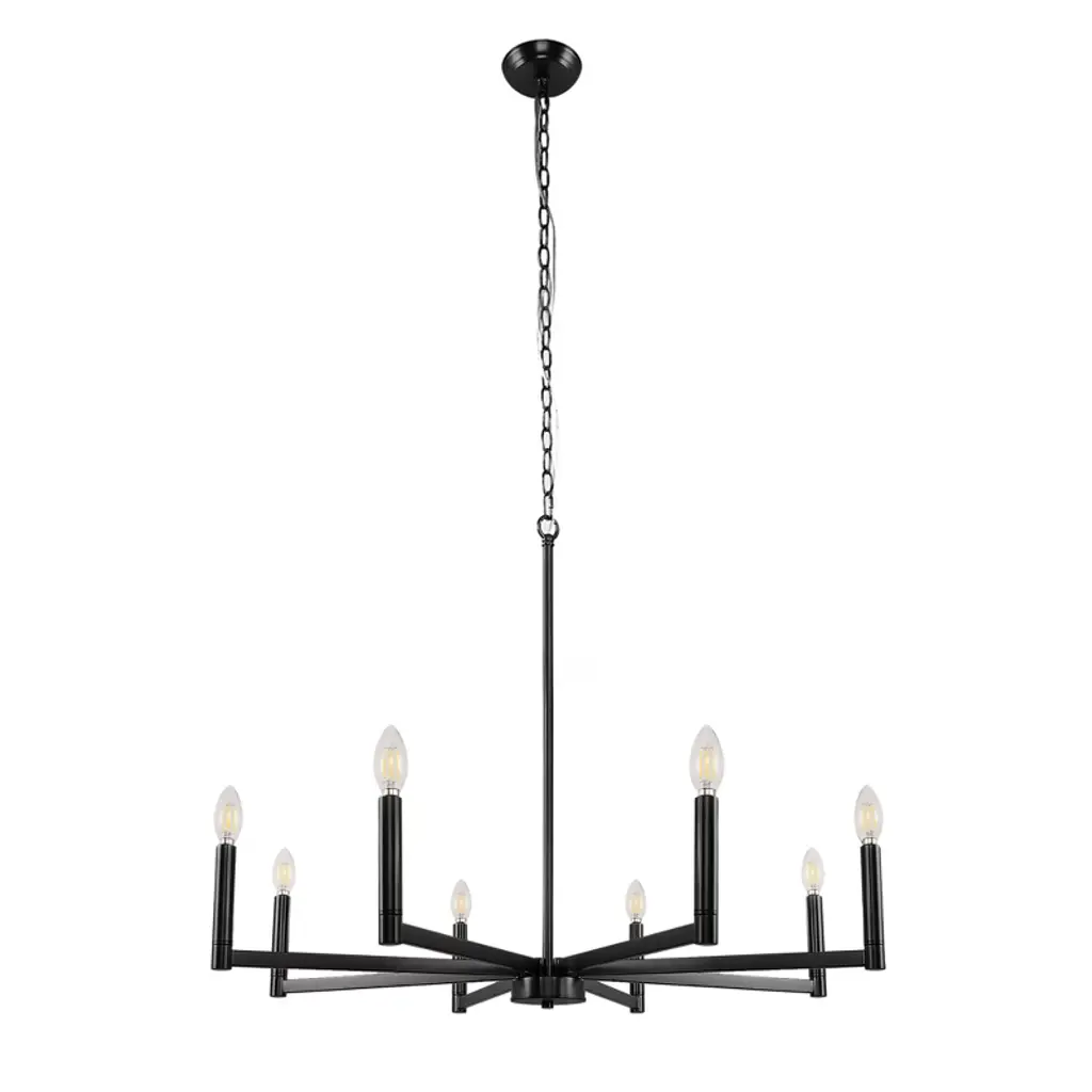 This 8-light chandelier showcases a timeless candelabra design finished in classic black, creating a bold yet elegant focal point in any space. Crafted to accommodate E12 base bulbs, it brings warm, customizable illumination to dining areas, entryways, or large living rooms. Its dramatic multi-arm silhouette is perfect for traditional, transitional, or modern farmhouse interiors.