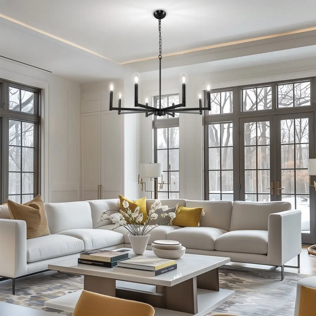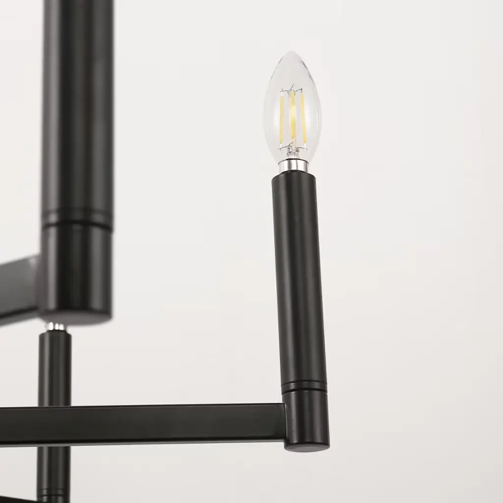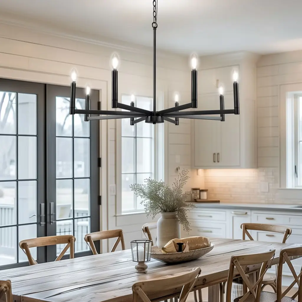 This 8-light chandelier showcases a timeless candelabra design finished in classic black, creating a bold yet elegant focal point in any space. Crafted to accommodate E12 base bulbs, it brings warm, customizable illumination to dining areas, entryways, or large living rooms. Its dramatic multi-arm silhouette is perfect for traditional, transitional, or modern farmhouse interiors.
