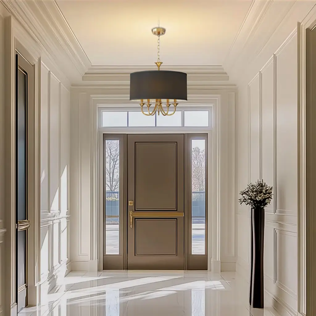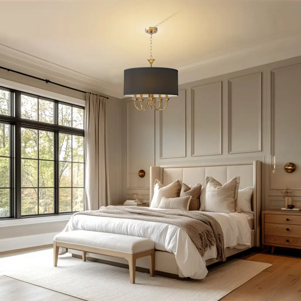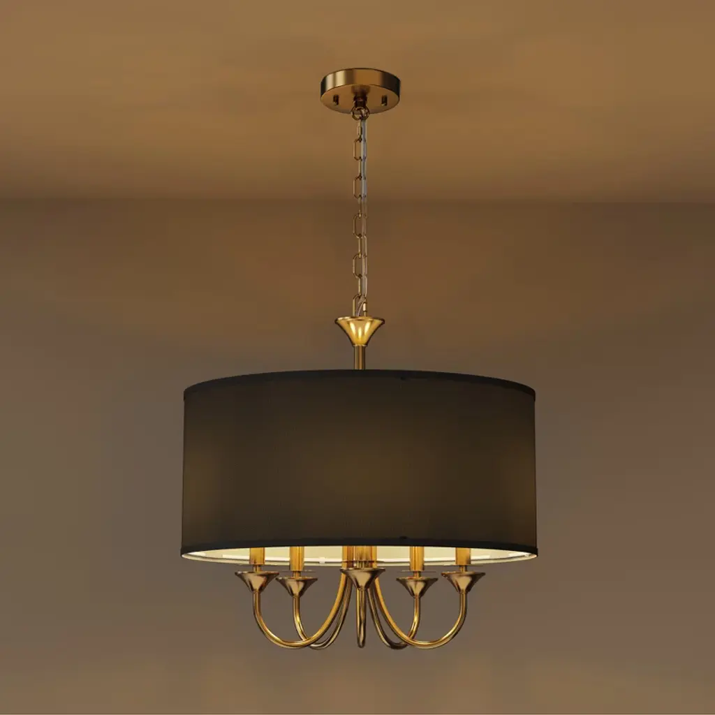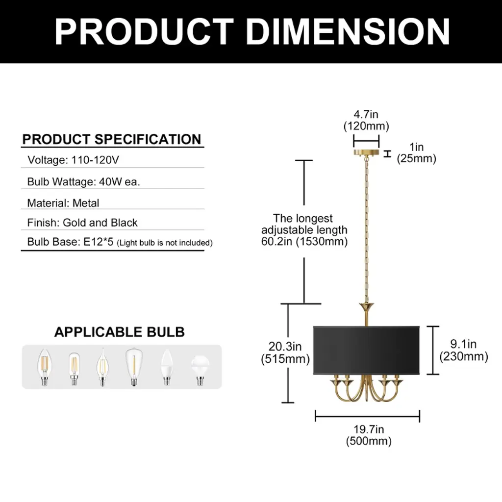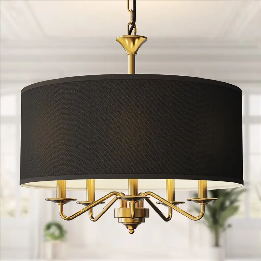 Elevate your home with this modern 5-light gold chandelier featuring a sleek black drum shade design. Its E12 sockets provide flexibility for light bulbs, allowing you to customize the brightness to match your space. This sophisticated fixture will make a statement in your kitchen, dining room, or living room with its modern industrial charm.