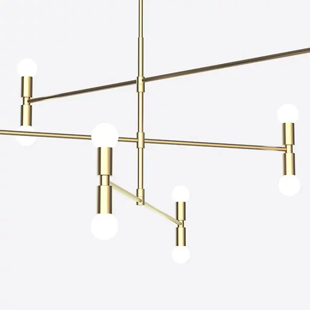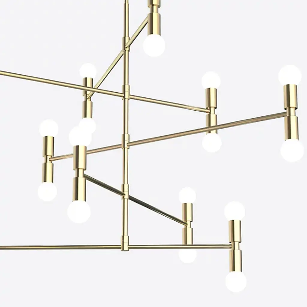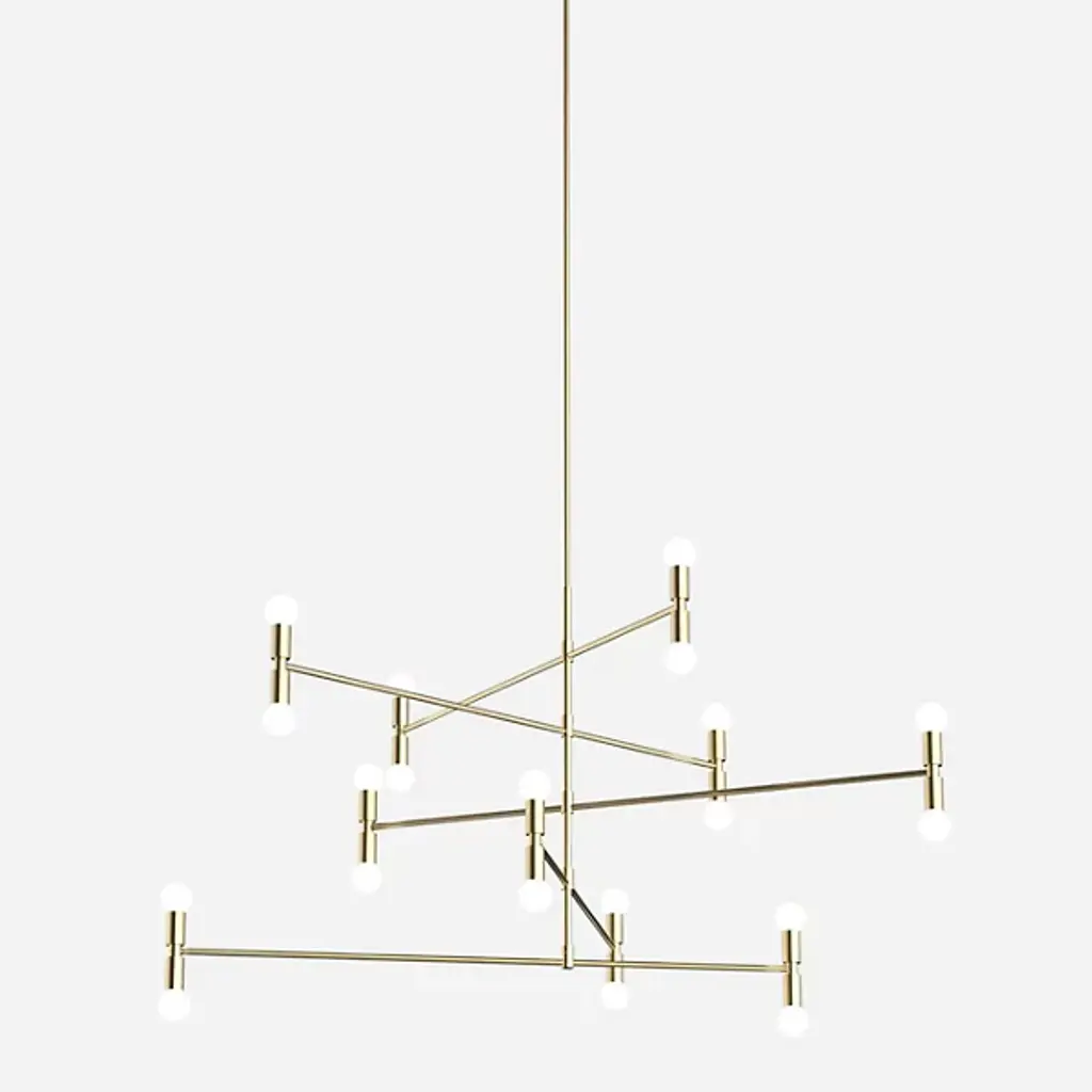 The Dot 14 C Chandelier by Lambert & Fils was inspired by a balance between lines and incandescent points. Designed by Samuel Lambert, this graceful piece is suspended by a single down rod that a series of slender metal rods are supported by. Along their simple, defined forms, a collection of exposed, spherical bulbs create bright focal points that illuminate surroundings and highlight the beautiful, uniform finish of the form supporting them.