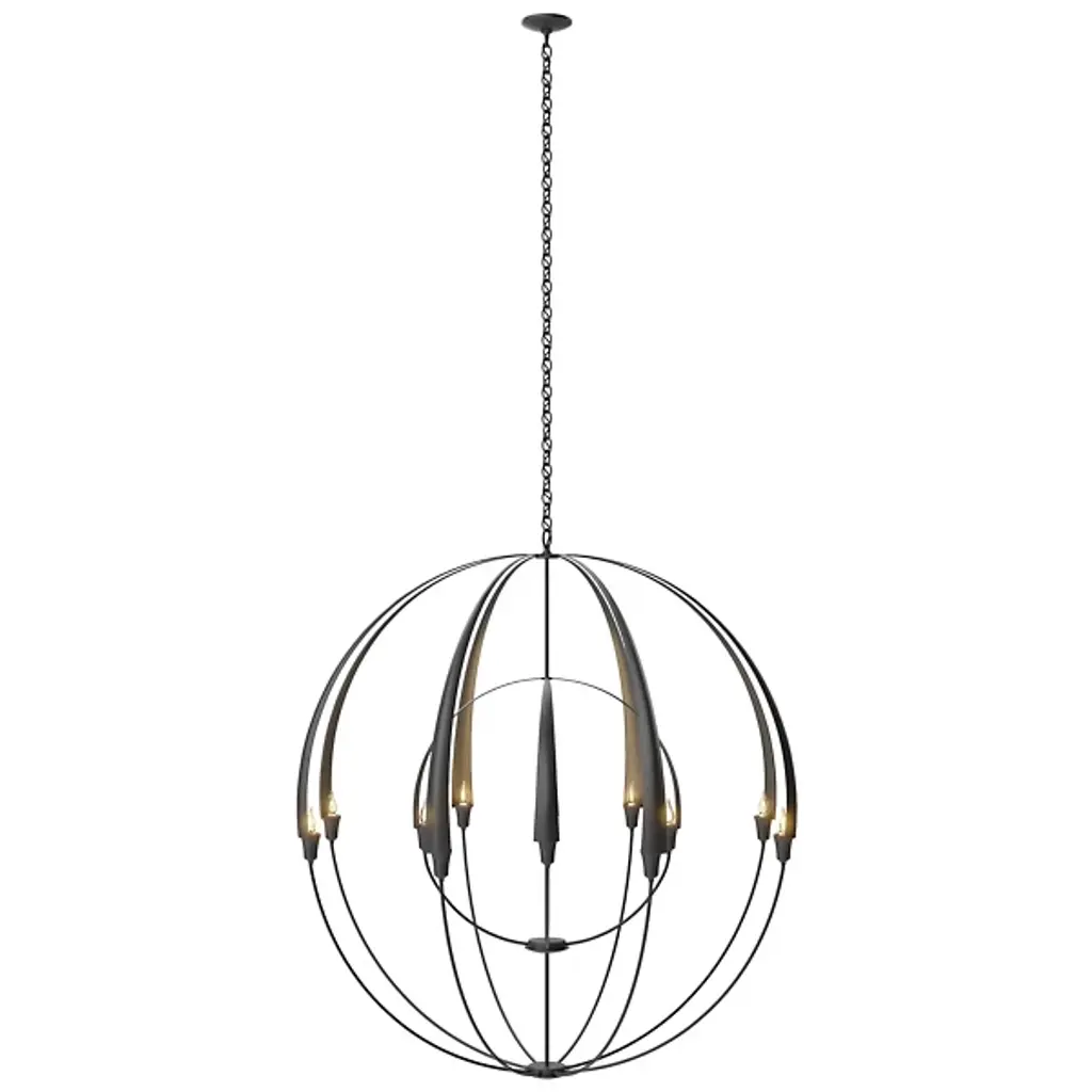 More is more in the Hubbardton Forge Double Cirque Chandelier. Building on the minimalist elegance of the original Cirque Chandelier, this fixture doubles the drama with a second orb nestled inside the outer frame. Exposed bulbs are tucked into the base of each petal-like wrought iron frond, creating a warm look reminiscent of an antique armillary sphere.