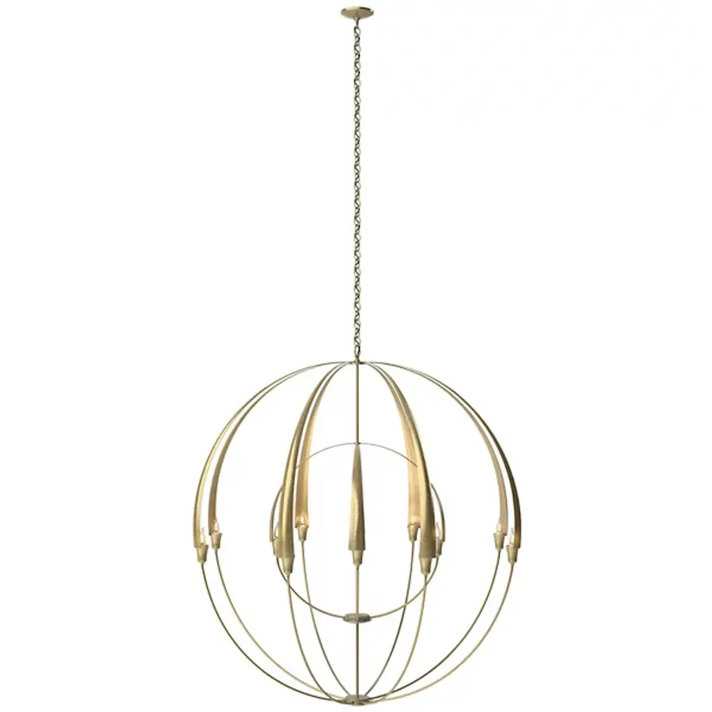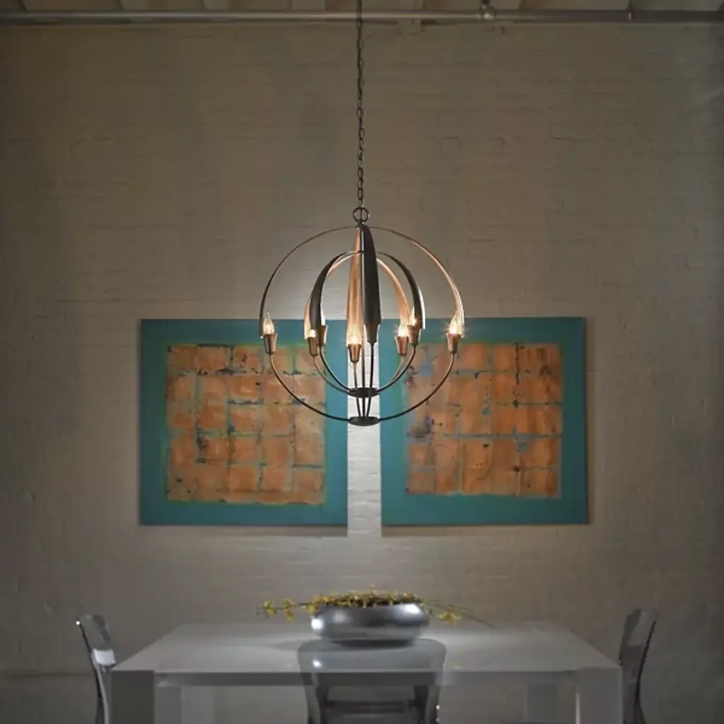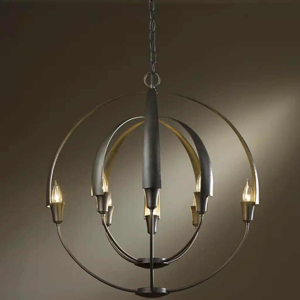 More is more in the Hubbardton Forge Double Cirque Chandelier. Building on the minimalist elegance of the original Cirque Chandelier, this fixture doubles the drama with a second orb nestled inside the outer frame. Exposed bulbs are tucked into the base of each petal-like wrought iron frond, creating a warm look reminiscent of an antique armillary sphere.