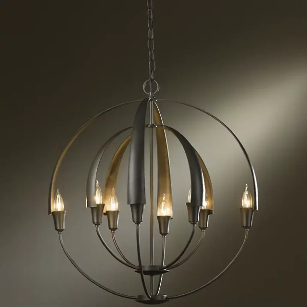 More is more in the Hubbardton Forge Double Cirque Chandelier. Building on the minimalist elegance of the original Cirque Chandelier, this fixture doubles the drama with a second orb nestled inside the outer frame. Exposed bulbs are tucked into the base of each petal-like wrought iron frond, creating a warm look reminiscent of an antique armillary sphere.