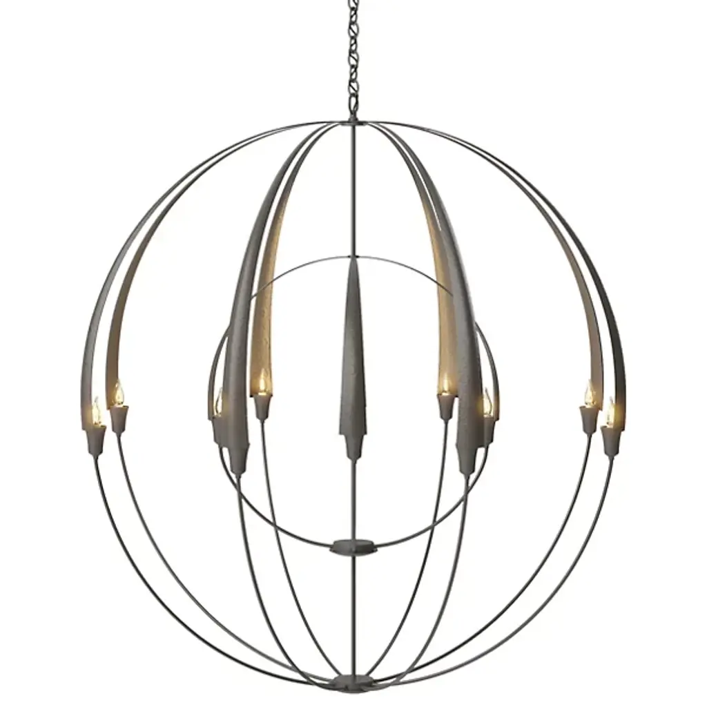 More is more in the Hubbardton Forge Double Cirque Chandelier. Building on the minimalist elegance of the original Cirque Chandelier, this fixture doubles the drama with a second orb nestled inside the outer frame. Exposed bulbs are tucked into the base of each petal-like wrought iron frond, creating a warm look reminiscent of an antique armillary sphere.
