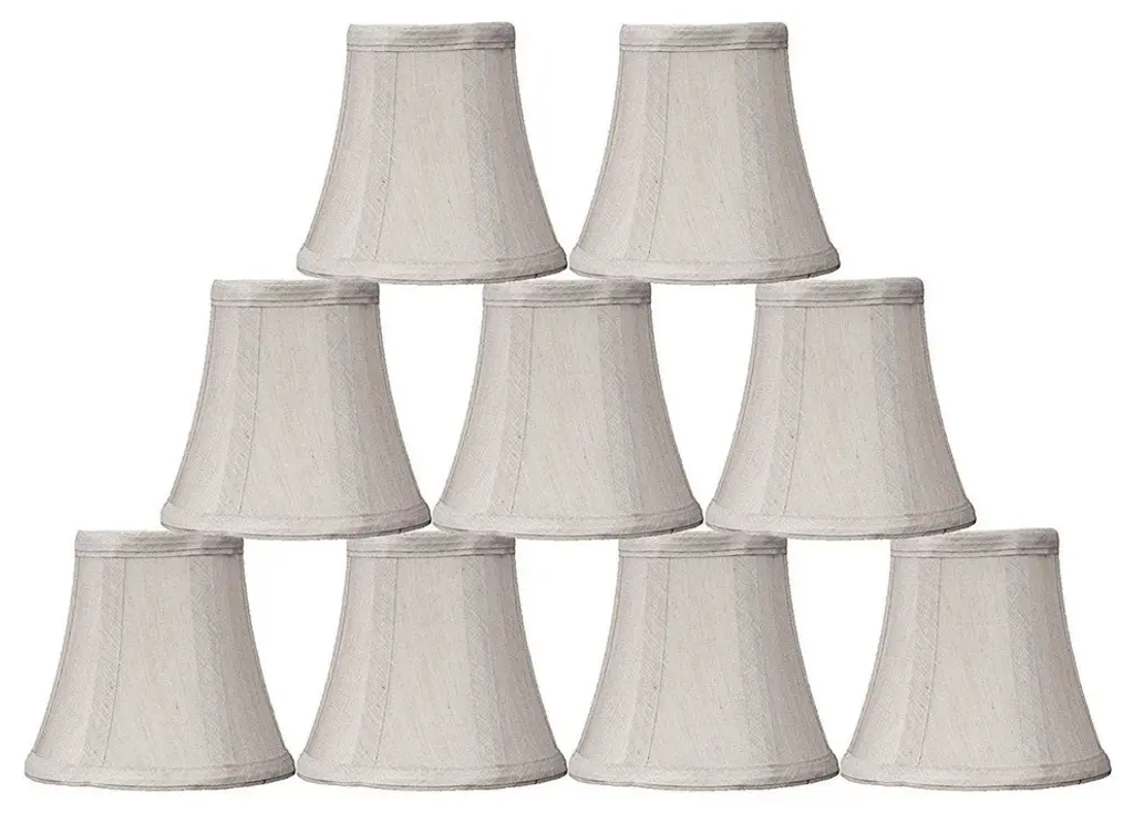 Urbanest chandelier shades, Set of 5Softback bell shape; Clip onMeasurements: 3" top; 5" bottom; 4.5" slant heightChampagne color faux silk; Off white LinerUse 25 watts max candelabra bulb