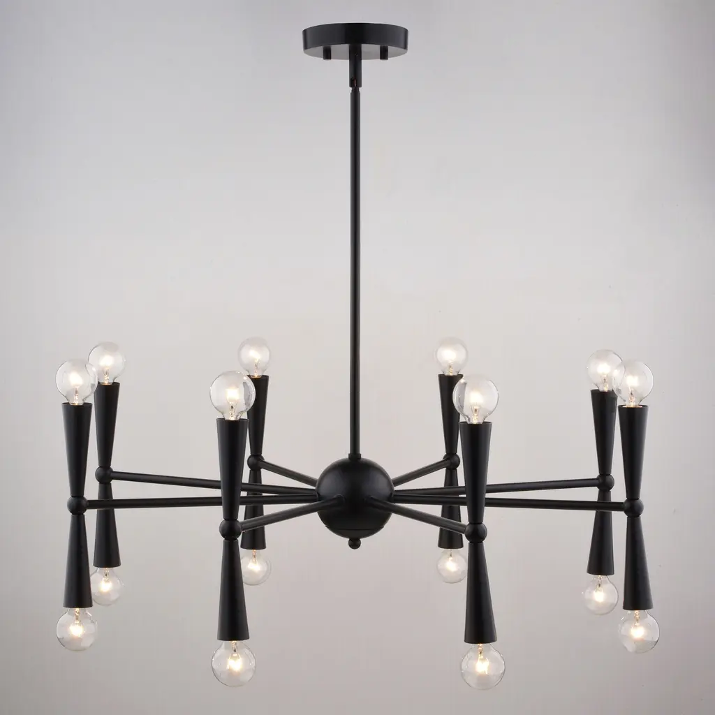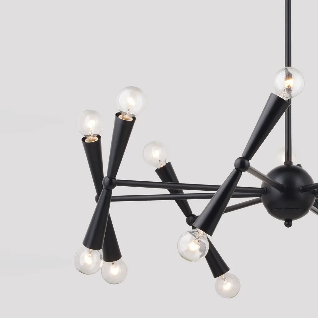 The Drake 29-in. chandelier is a playful homage to mid-century modern design. Rotating outer arms for customizable ambiance with its 16 lights and the striking matte black finish completes the overall look. Perfect for dining rooms, living spaces, bedrooms or home offices seeking a touch of retro-chic charm.