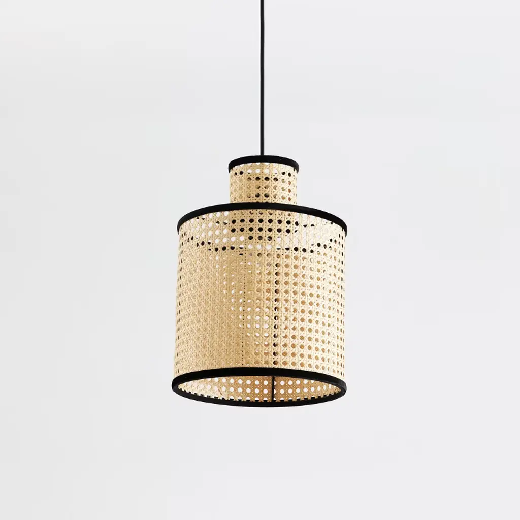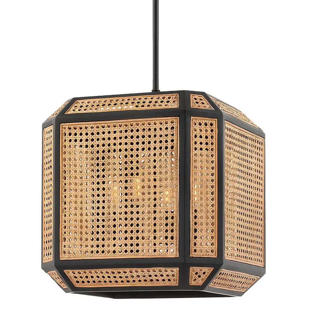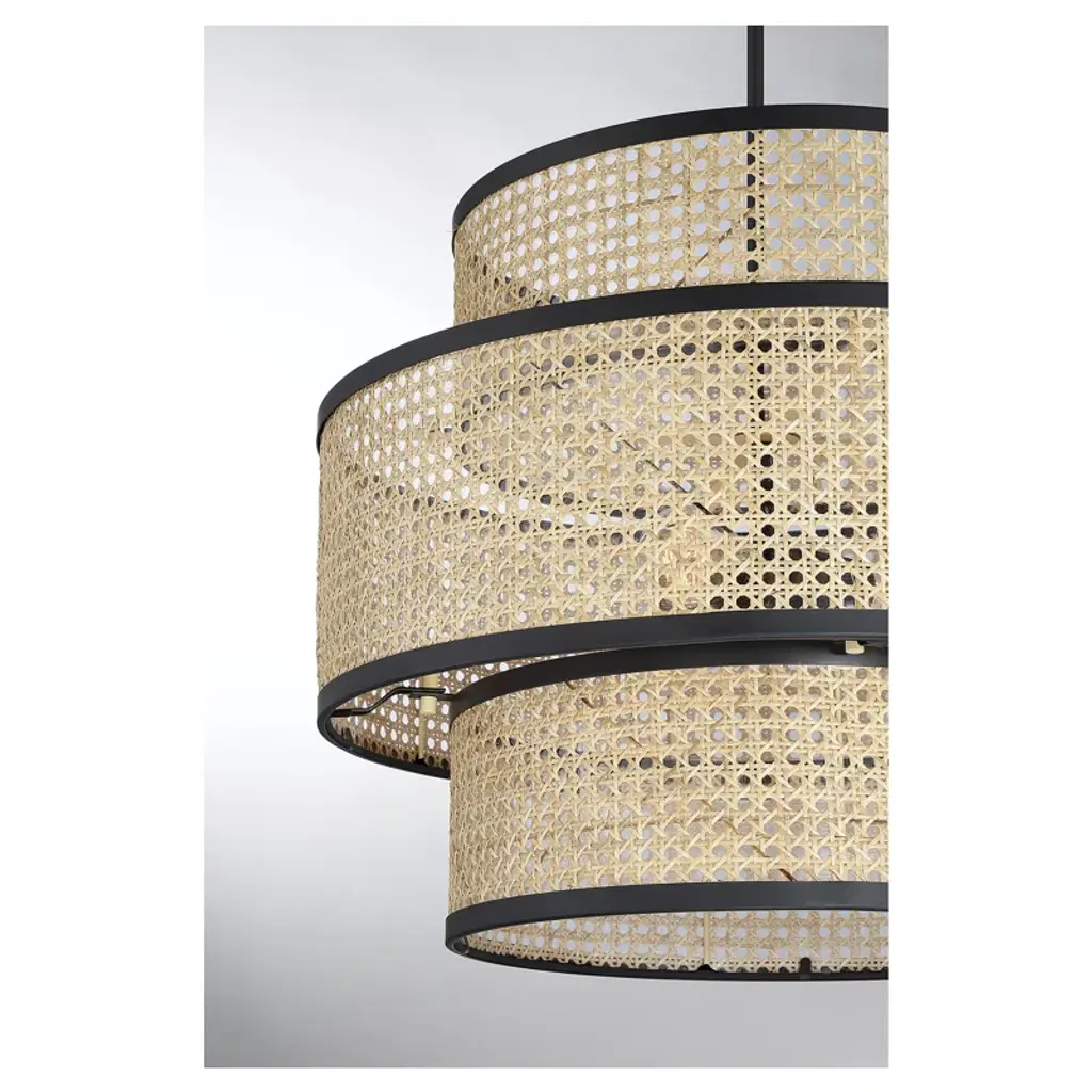 Bring in a relaxed, organic look with this stylish 3-light pendant. It features three different shades, each in natural cane with matte black edging, that overlap to create an eye-catching silhouette. Matte black finish. 18" height, 22" width. Max height 72". Max 60 watts per bulb, standard size A19 bulbs recommended. LED bulb compatible. Supplied with four 12" rods and one 6" rod.