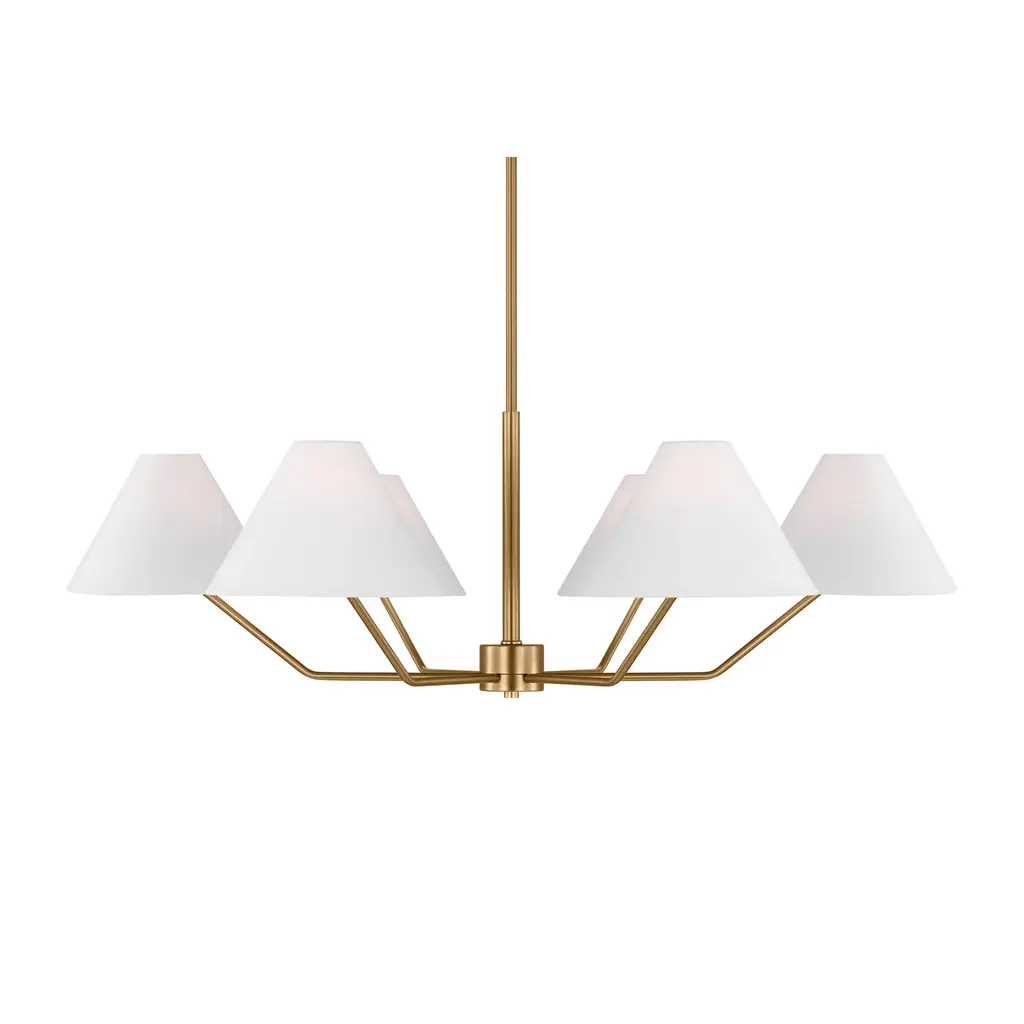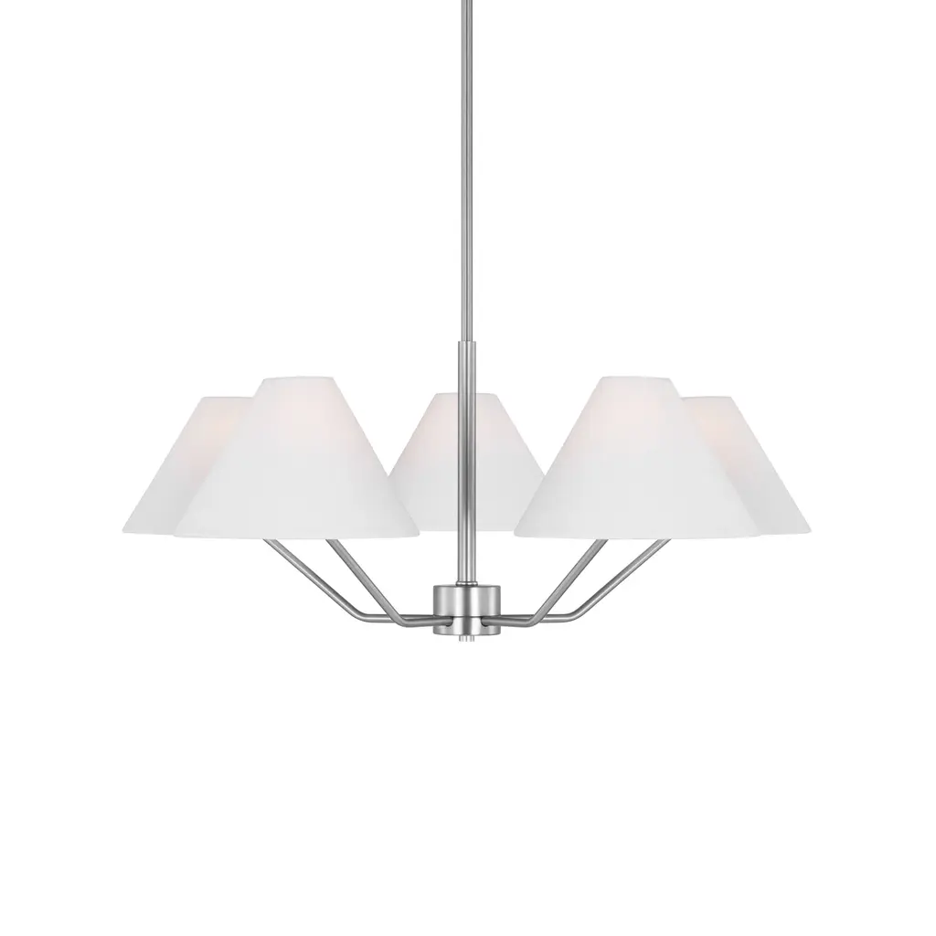 The Drew and Jonathan Burke Chandelier from Visual Comfort Studio features slender, angular steel arms paired with charming white linen cone shades for a sleek, modern aesthetic. Suspended from a slender downrod and secured by a low-profile ceiling canopy, this fixture appears to float gracefully overhead. Equipped with LED lamps, it casts a radiant, even glow that enhances any room with expert craftsmanship and contemporary elegance. Highlights