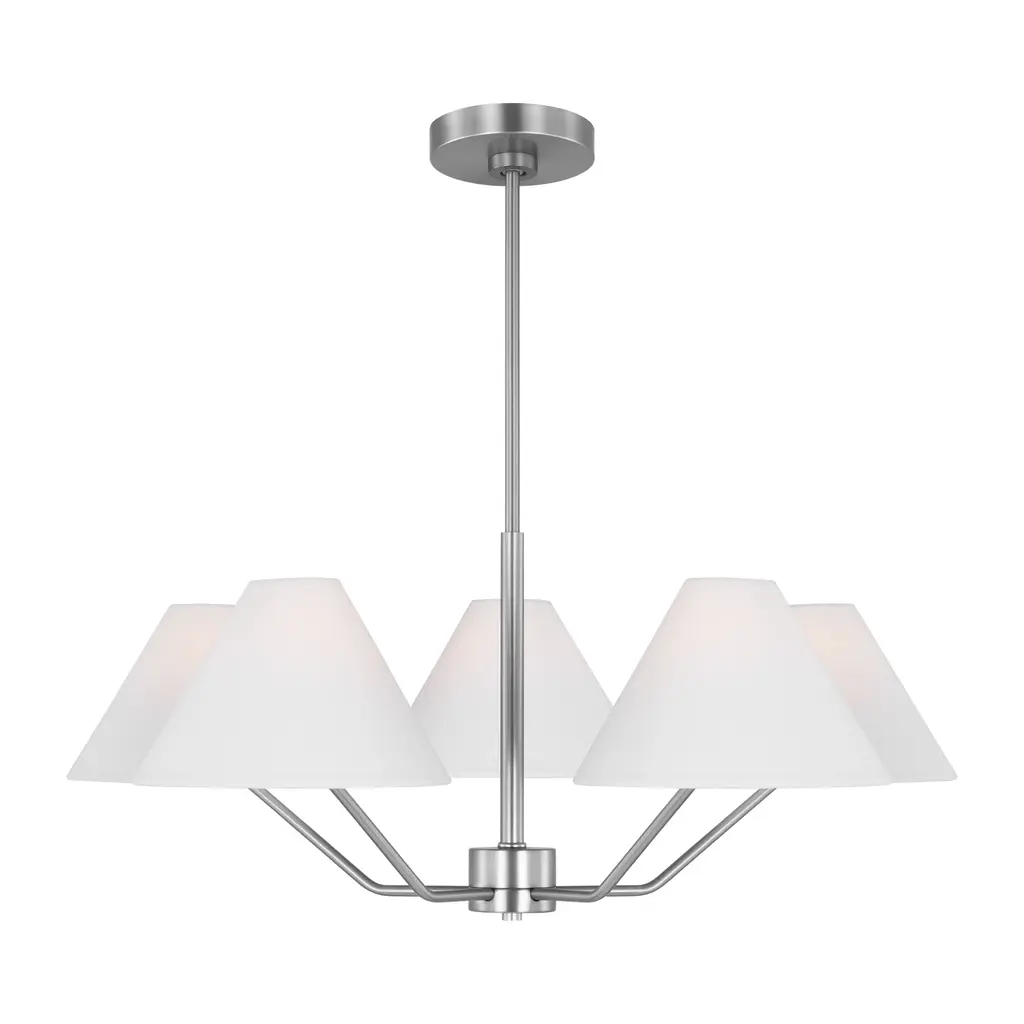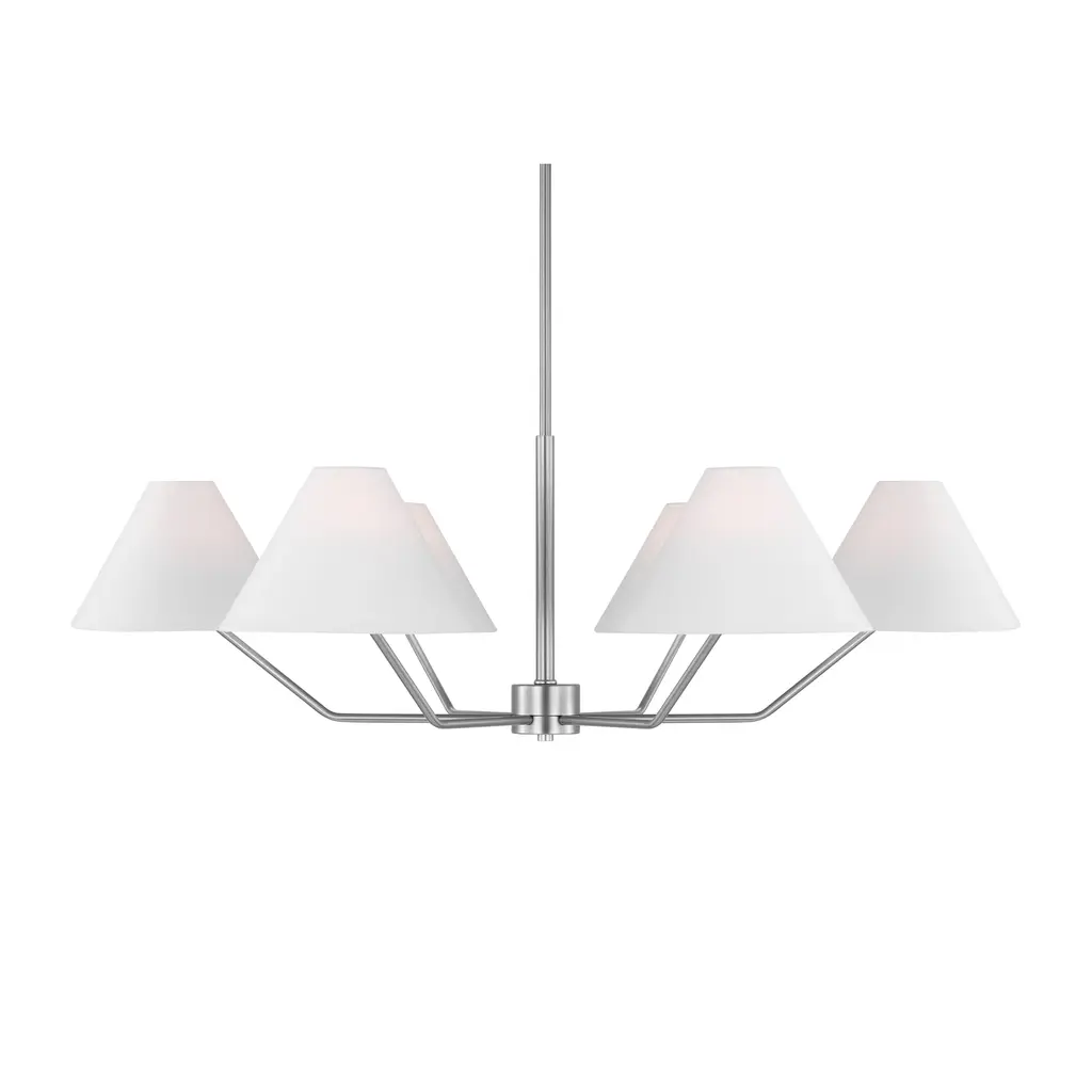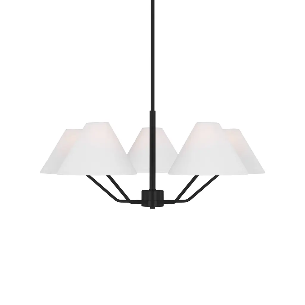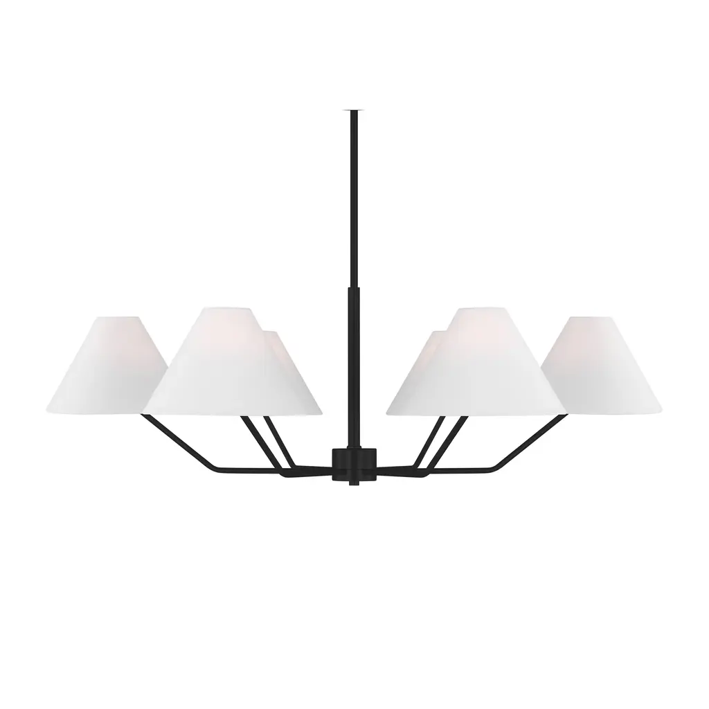 The Drew and Jonathan Burke Chandelier from Visual Comfort Studio features slender, angular steel arms paired with charming white linen cone shades for a sleek, modern aesthetic. Suspended from a slender downrod and secured by a low-profile ceiling canopy, this fixture appears to float gracefully overhead. Equipped with LED lamps, it casts a radiant, even glow that enhances any room with expert craftsmanship and contemporary elegance. Highlights