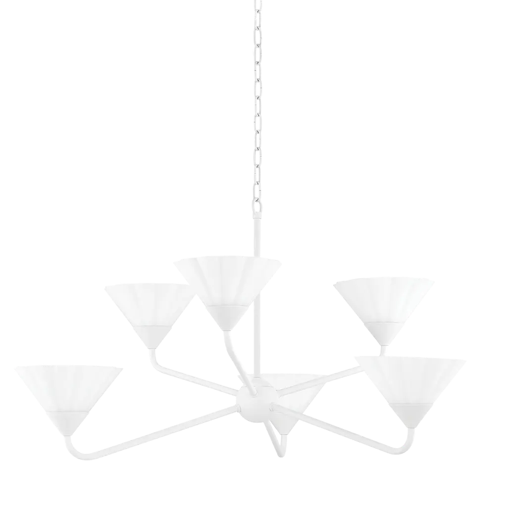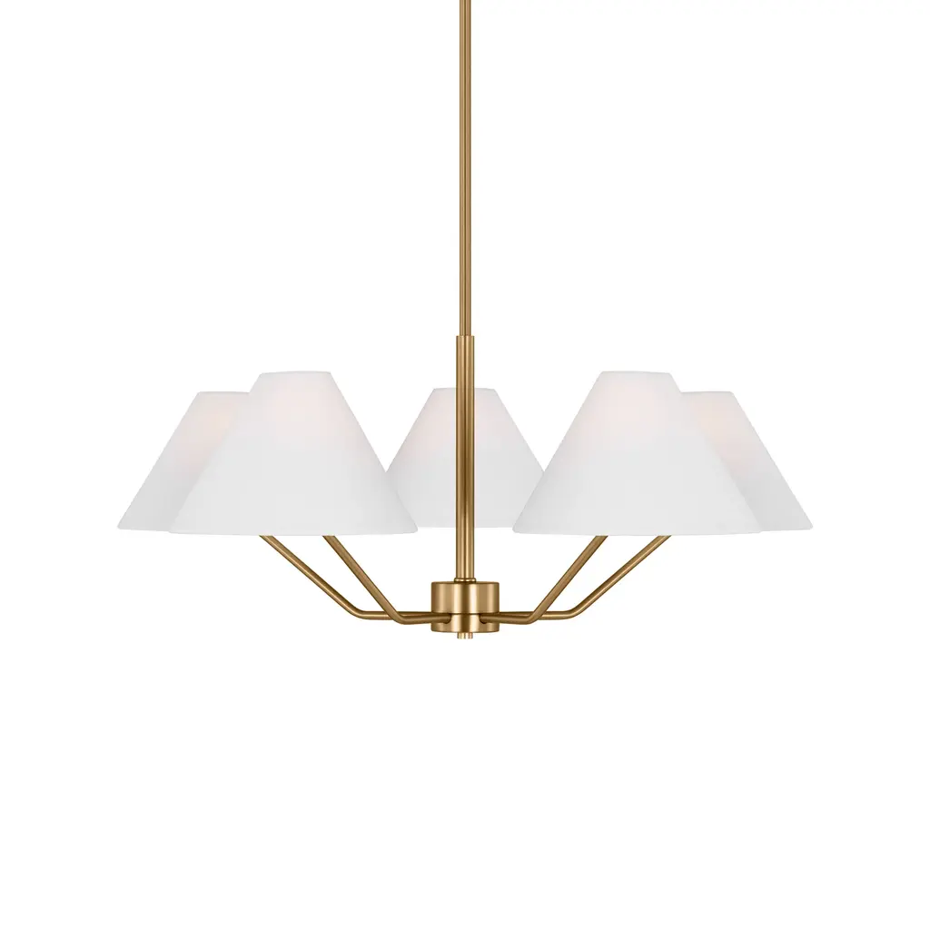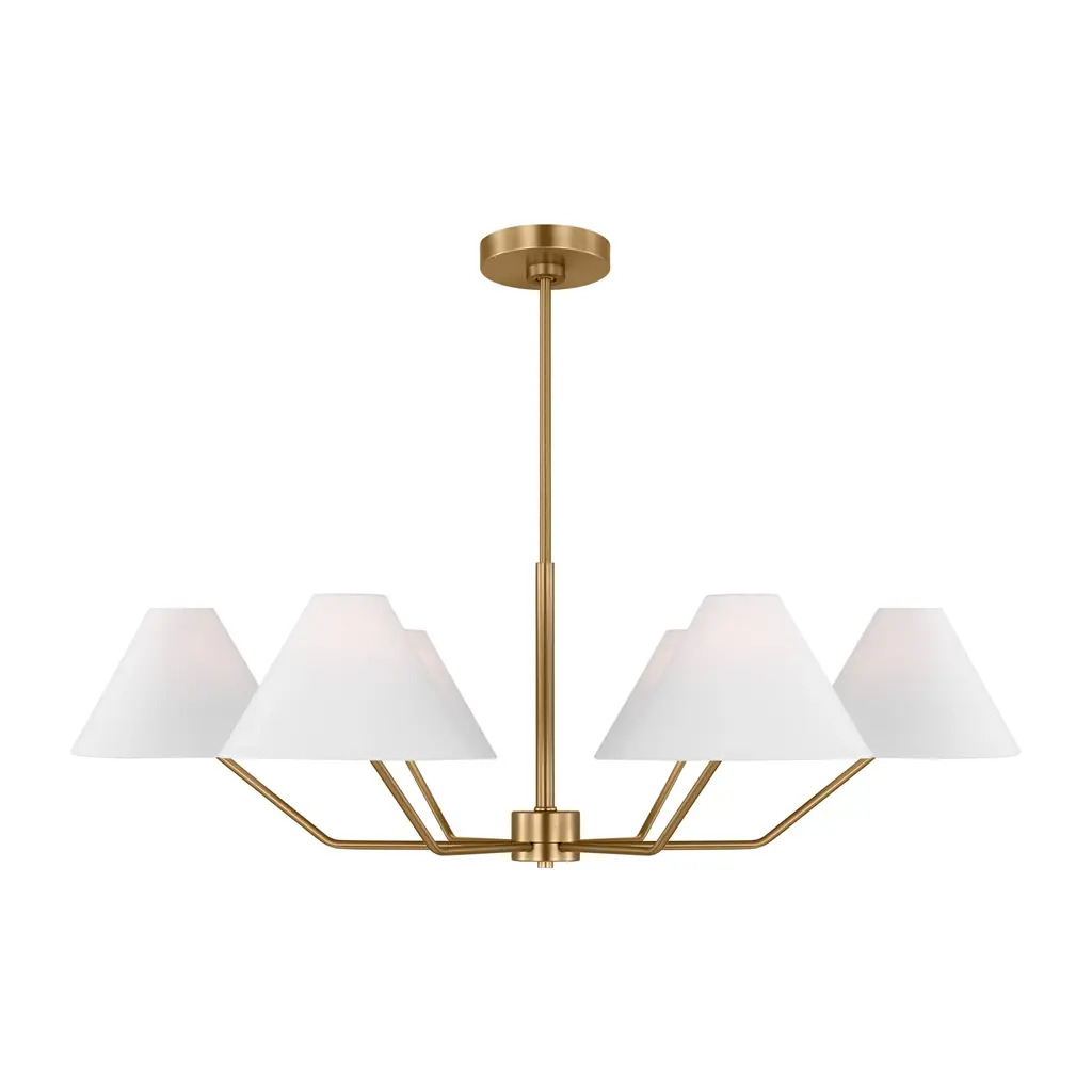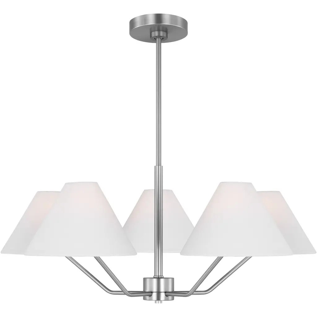 The Drew and Jonathan Burke Chandelier from Visual Comfort Studio features slender, angular steel arms paired with charming white linen cone shades for a sleek, modern aesthetic. Suspended from a slender downrod and secured by a low-profile ceiling canopy, this fixture appears to float gracefully overhead. Equipped with LED lamps, it casts a radiant, even glow that enhances any room with expert craftsmanship and contemporary elegance. Highlights