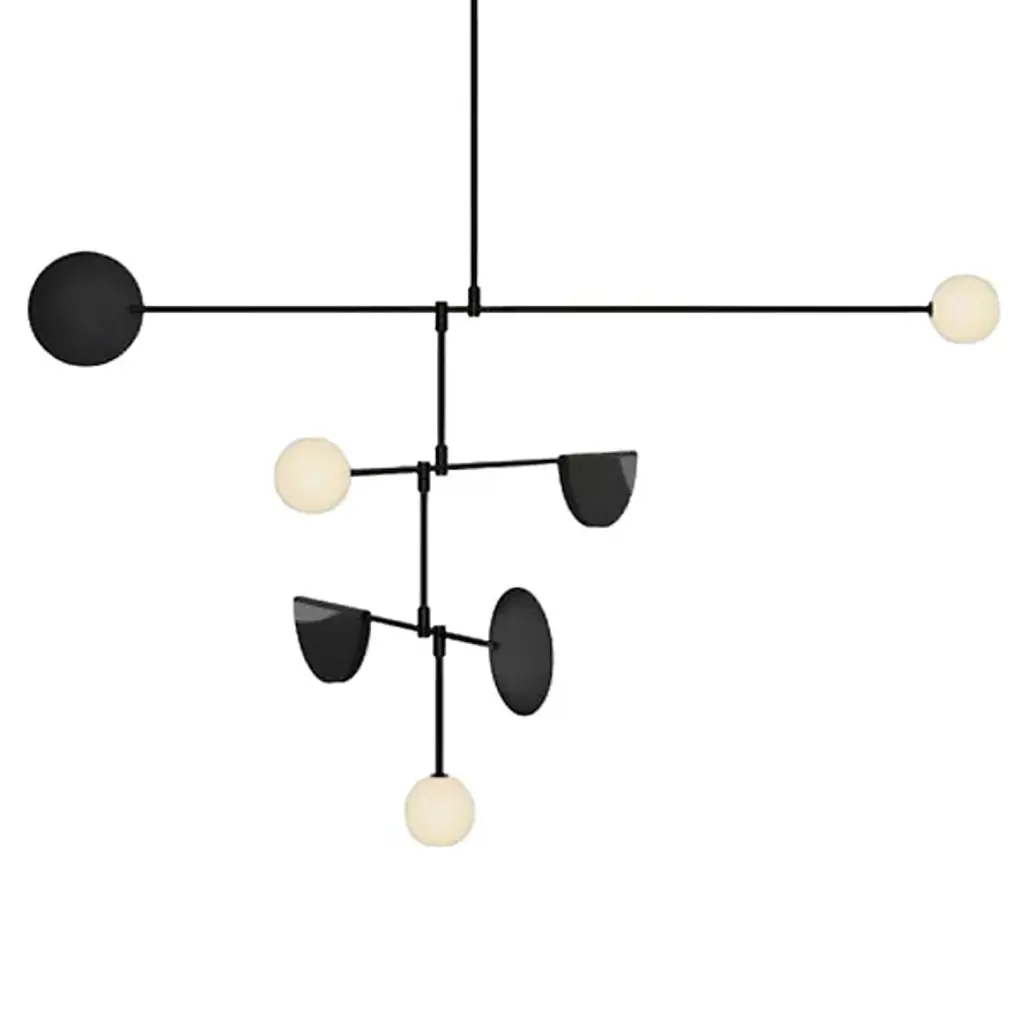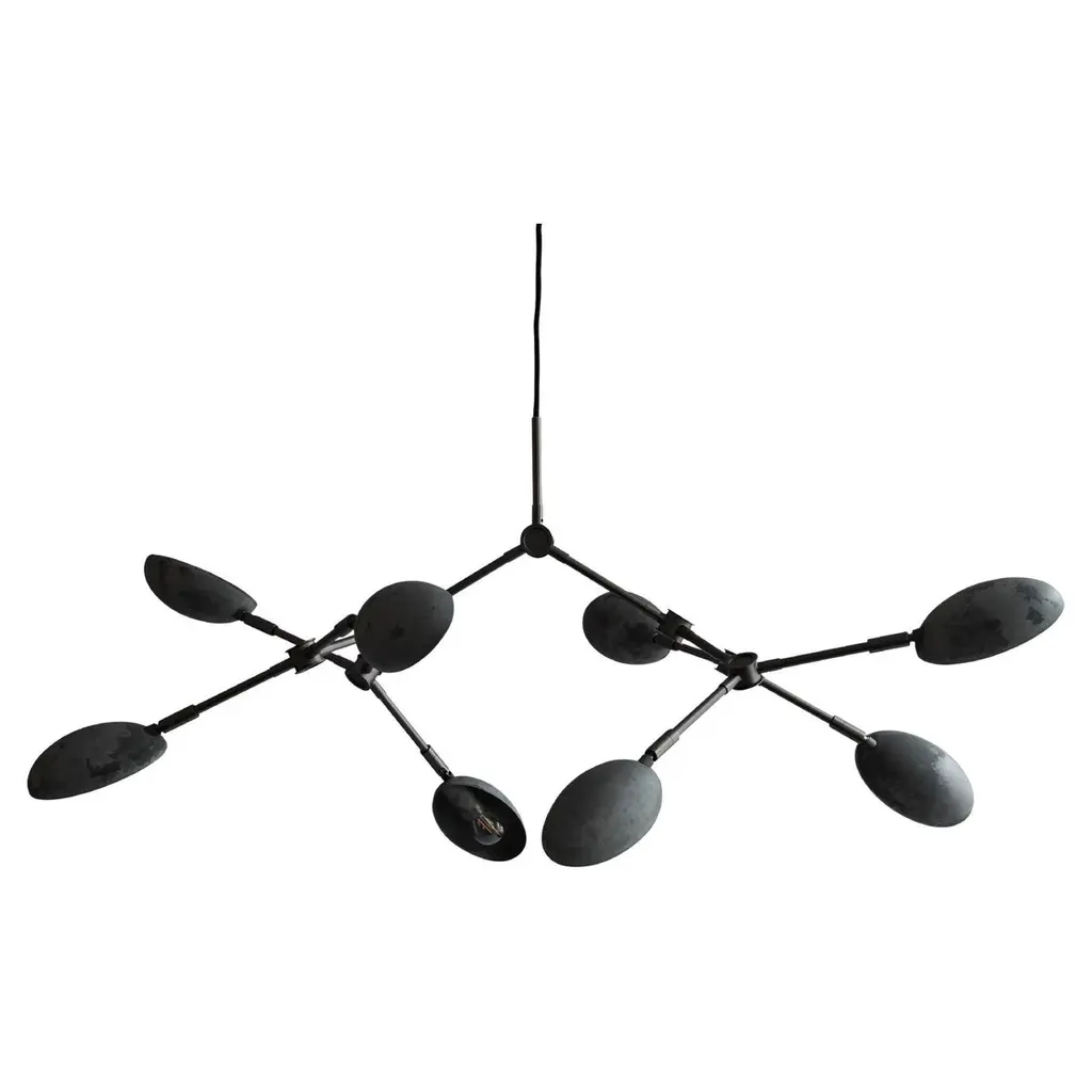 Drop Chandelier in Plated Metal by 101 CopenhagenDesigned by Kristian Sofus Hansen & Tommy Hyldahl.Colour / Material: Burned BlackLampshade & ceiling cup: 100% Iron, with plated Burned Black finish. Pipes & attachment parts are made of 100% Iron color, Burned Black, and polished afterwords.Dimensions: L154 x W121 x H73 CMMounting plate: H1,3/W5,5 CMCeiling cup: H18 /W6 CMFabric-covered cable (divided in two): Cable 1. from 15 to 85 CM / Cable 2. 200 CMThis product is not wired for the USA.Suitable for rooms with a height of 230-320 CM.Does not comply with US Standards.While The Drop Chandelier collection honors modernist lamp designs of the 1950s, it also celebrates an experimental, innovative approach with its gently curving shades and 14 flexible and functional adjustable arms - creating countless options, variations, and angles. The beautifully crafted oxidized and plated metal body is subsequently hand brushed, and the lamp brightens up the room elegantly with a warm, pleasant light. 101 Copenhagen is a Danish design brand founded in 2017. With a vision to honor exquisite quality and craftsmanship, the collection encompasses furniture, lighting, and accessories in a timeless yet modern design. With a true passion for materials, refined textures, organic shapes, and colors, 101 Copenhagen presents the epitome of classics and must-have novelties for Scandinavian and international interior connoisseurs.
