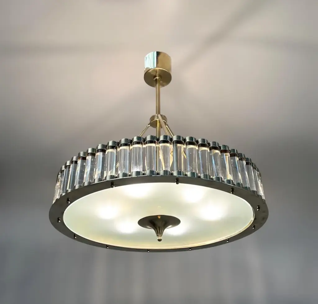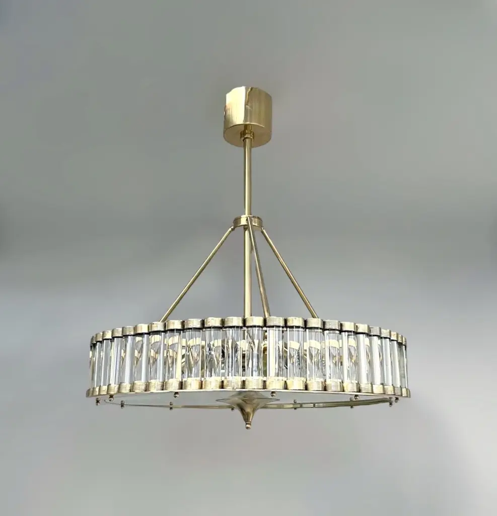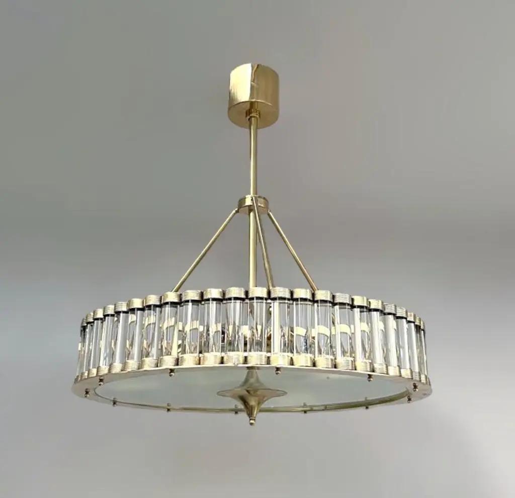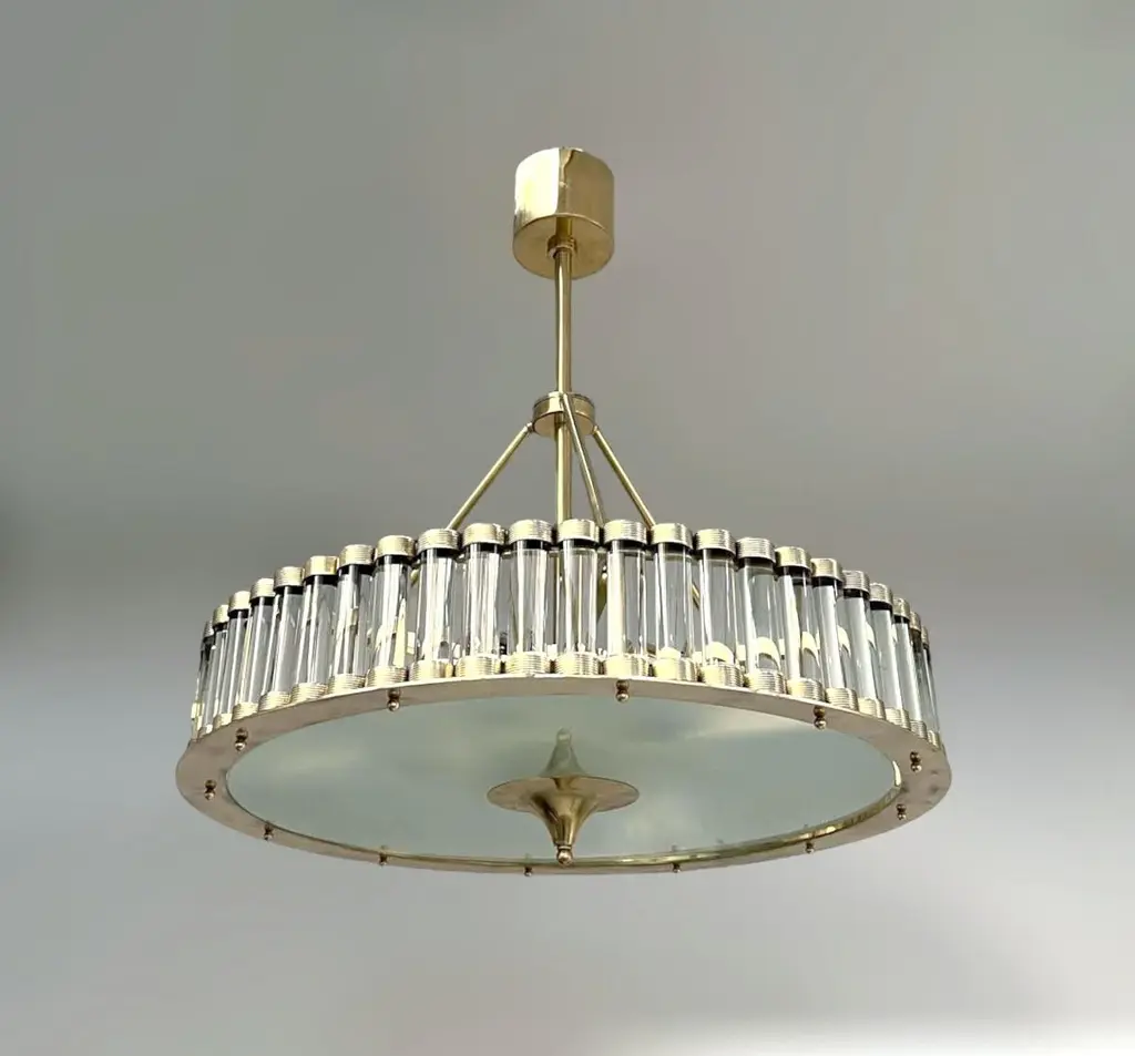 Italian art deco style drum chandelier with clear Murano glass rods mounted on solid brass frame in unlacquered natural brass finish / Made in Italy6 lights / E26 or E27 type / max 60W eachMeasures: diameter 27.5 inches, height 30 inches including rods and canopyOrder only / This item ships from Italy Order Reference #: FABIOLTD C842