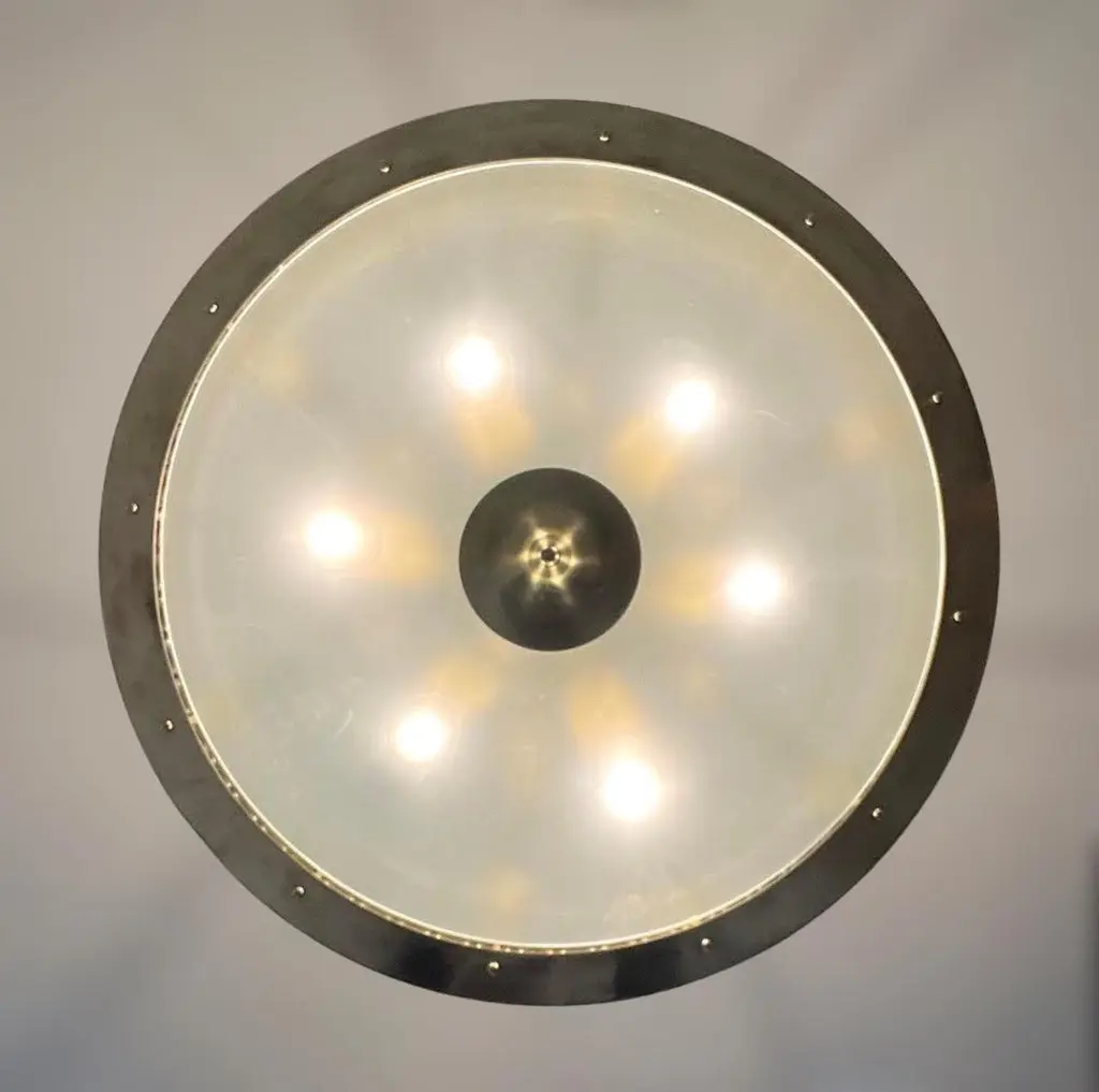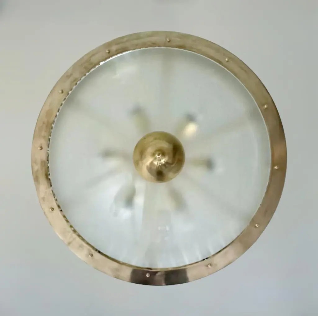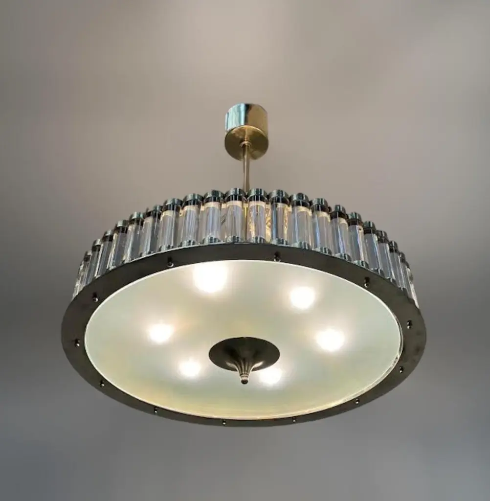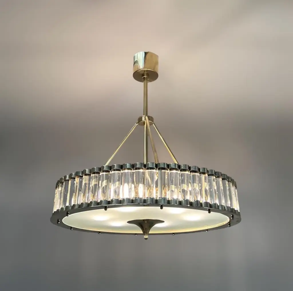 Italian art deco style drum chandelier with clear Murano glass rods mounted on solid brass frame in unlacquered natural brass finish / Made in Italy6 lights / E26 or E27 type / max 60W eachMeasures: diameter 27.5 inches, height 30 inches including rods and canopyOrder only / This item ships from Italy Order Reference #: FABIOLTD C842