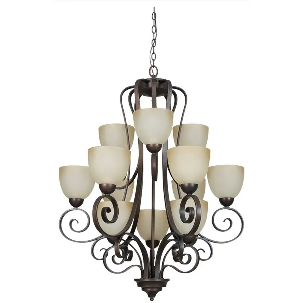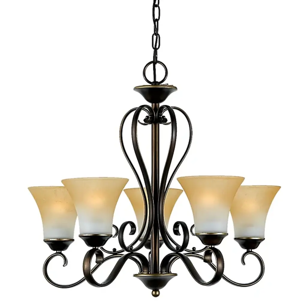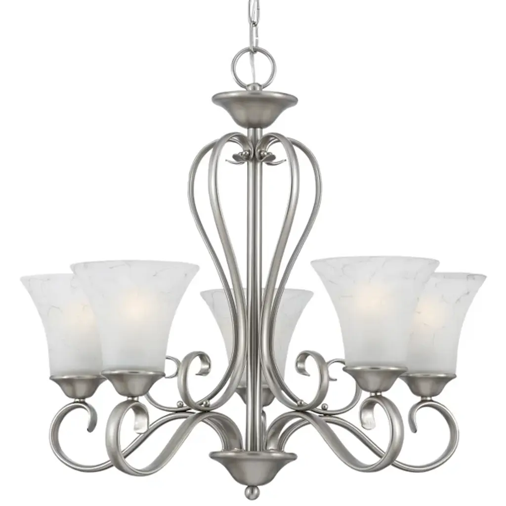 Create a royal welcome in an entryway or dining room with the Quoizel Duchess Chandelier. It features five Marble glass shades, the trumpeted shape of which flows effortlessly from the hand-forged iron frame's numerous fluid S-curves. Available in two finish/shade glass color pairings to work with colors schemes both cool and warm.