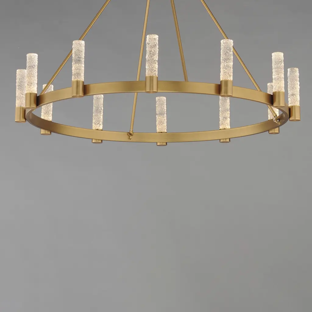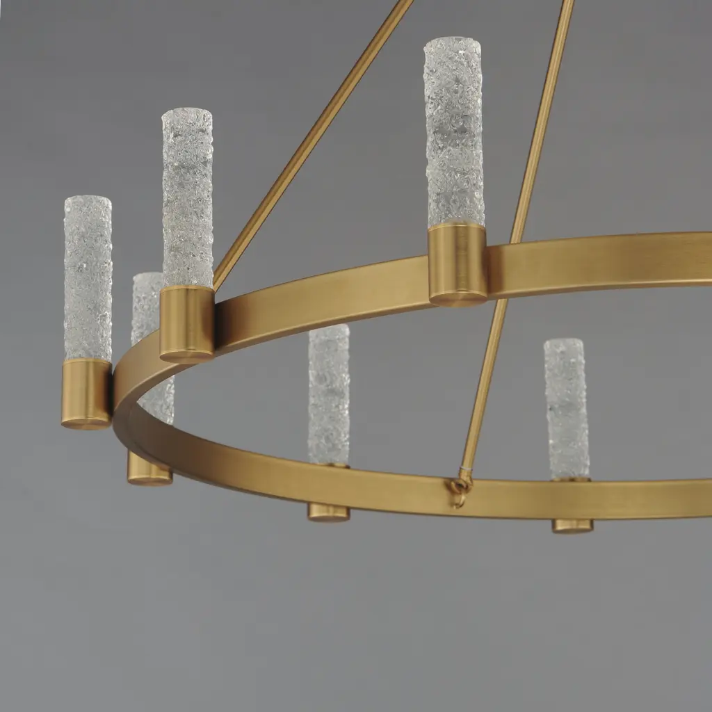 The Duchess collection seamlessly blends traditional brass craftsmanship with modern piastra-style Iceberg glass, illuminated by integrated LED modules. Powered by a commercially rated LED driver with 120-277V input, the low-voltage LEDs deliver a neutral 3000K color temperature. The rectangular tubing frame in Natural Aged Brass softens the contemporary aesthetic, while decorative flat-edge chain links add a touch of elegance. A dual-mount canopy offers flexibility for shorter height profiles or field-adjustable lengths with the included chain.