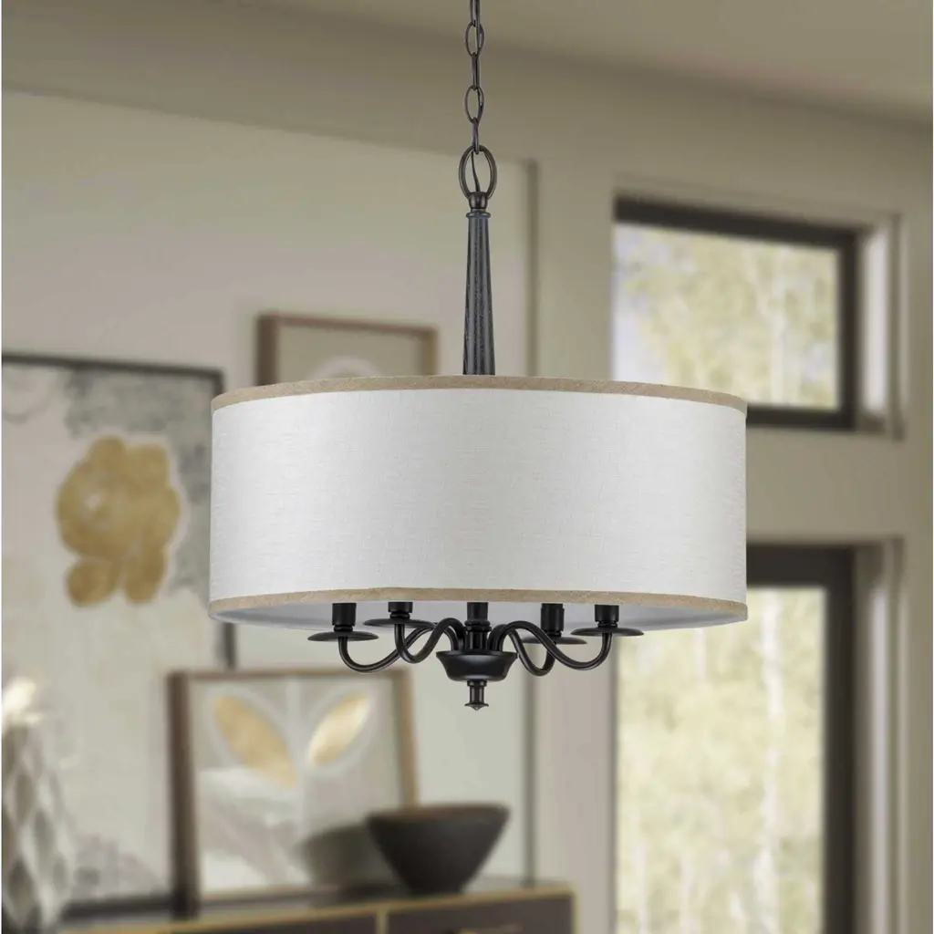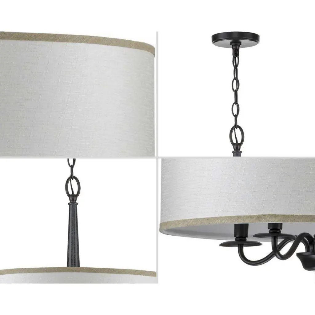 This versatile chandelier from the Durrell Collection will easily find a home in a variety of settings in need of generous illumination. A sailcloth linen shade creates a soft, muted glow. Inside the shade nestle light bases on gently curved arms coated in a beautiful black finish. A wooden stem coated in a cerused black finish attaches the light fixture to a linked chain.