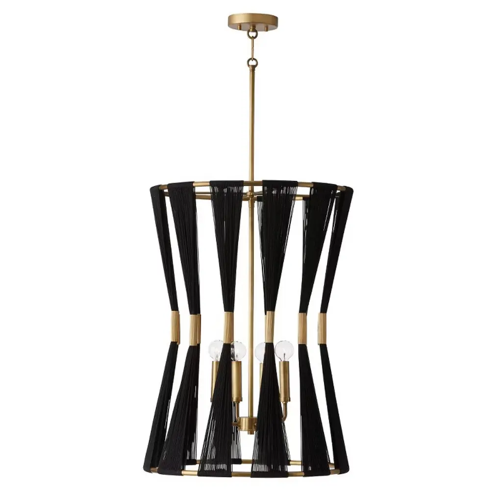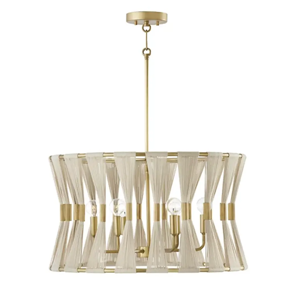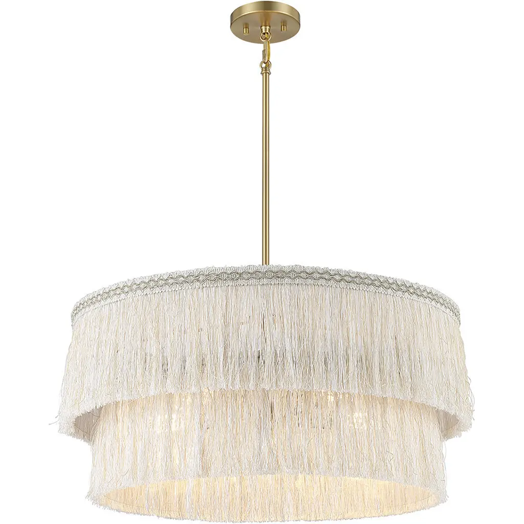 Anchored by matching hook and loop hardware, an elegant drum-shaped light draws its inspiration from the braids and tassels of ancient Greece. A flourish of silken gold and gray fringe is threaded, gathered and bound by shimmering antique brass hardware giving this impactful fixture a timeless appeal. Finish will vary.