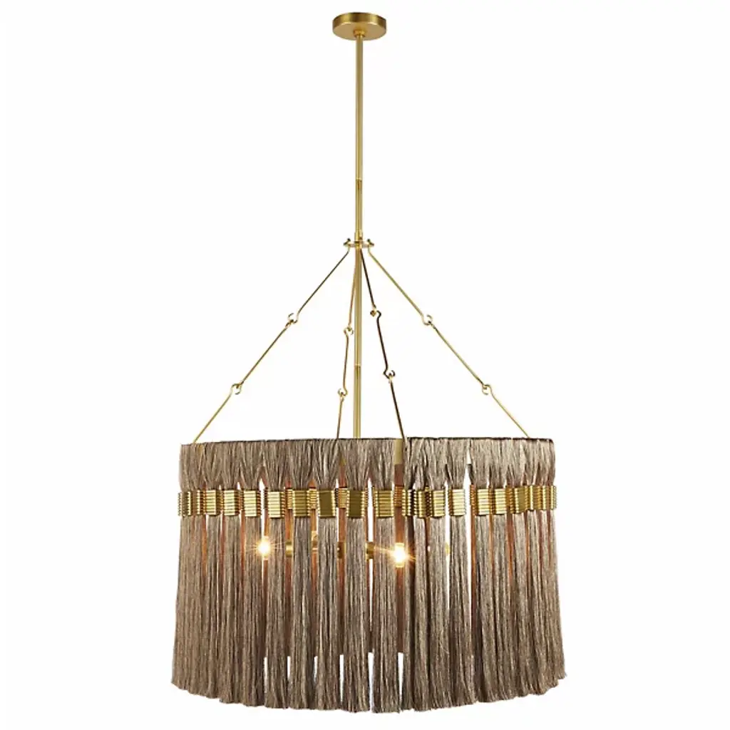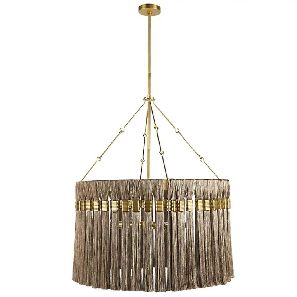 The Dutchess Chandelier from Arteriors showcases transitional style with its elegant drum-shaped design inspired by ancient Greek braids and tassels. Anchored by matching hook-and-loop hardware, the chandelier features a luxurious flourish of silken gold and gray fringe threaded and gathered and then bound by the shimmering antique brass-finished steel. This soft-surfaced fixture leaves a dramatic impact, combining vintage appeal with contemporary design elements. Each chandelier has a unique finish, and its damp-listed lamping allows it to go wherever you need it.