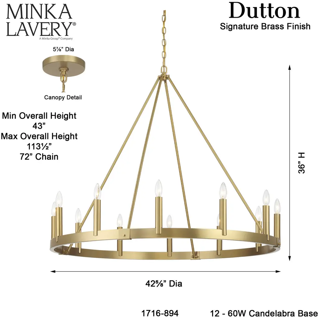 This 12 light Chandelier from the Dutton collection by Minka-Lavery will enhance your home with a perfect mix of form and function. The features include a Signature Brass finish applied by experts. This item qualifies for free shipping!