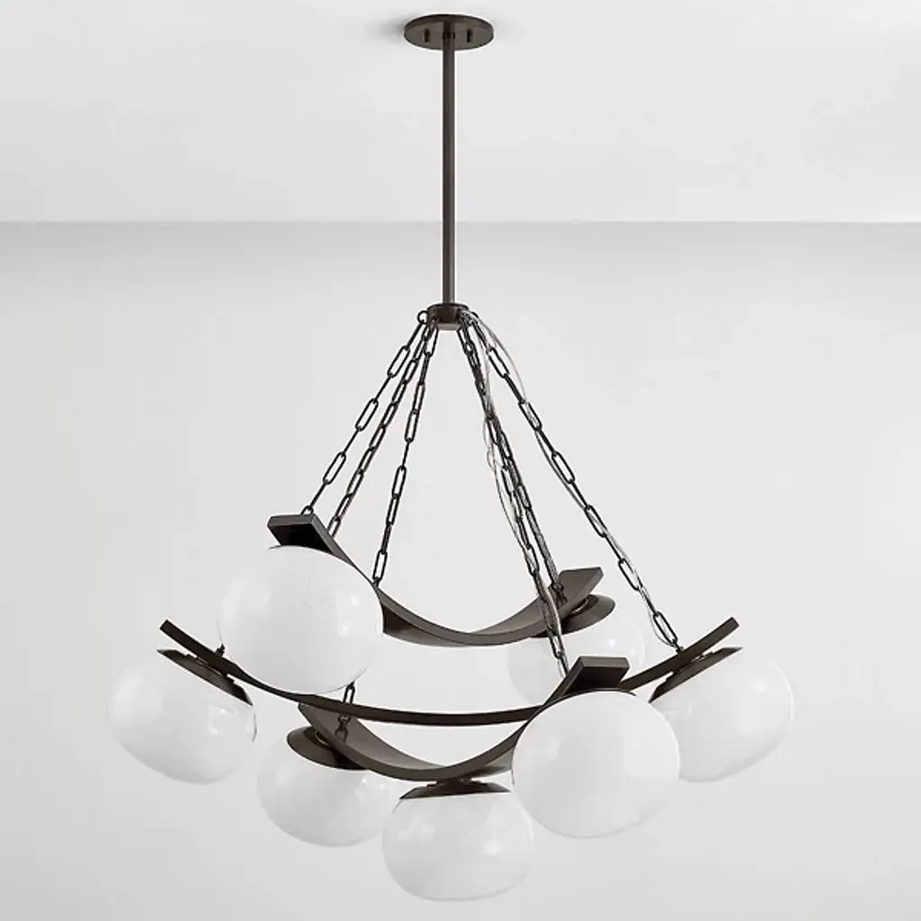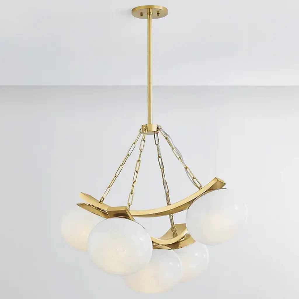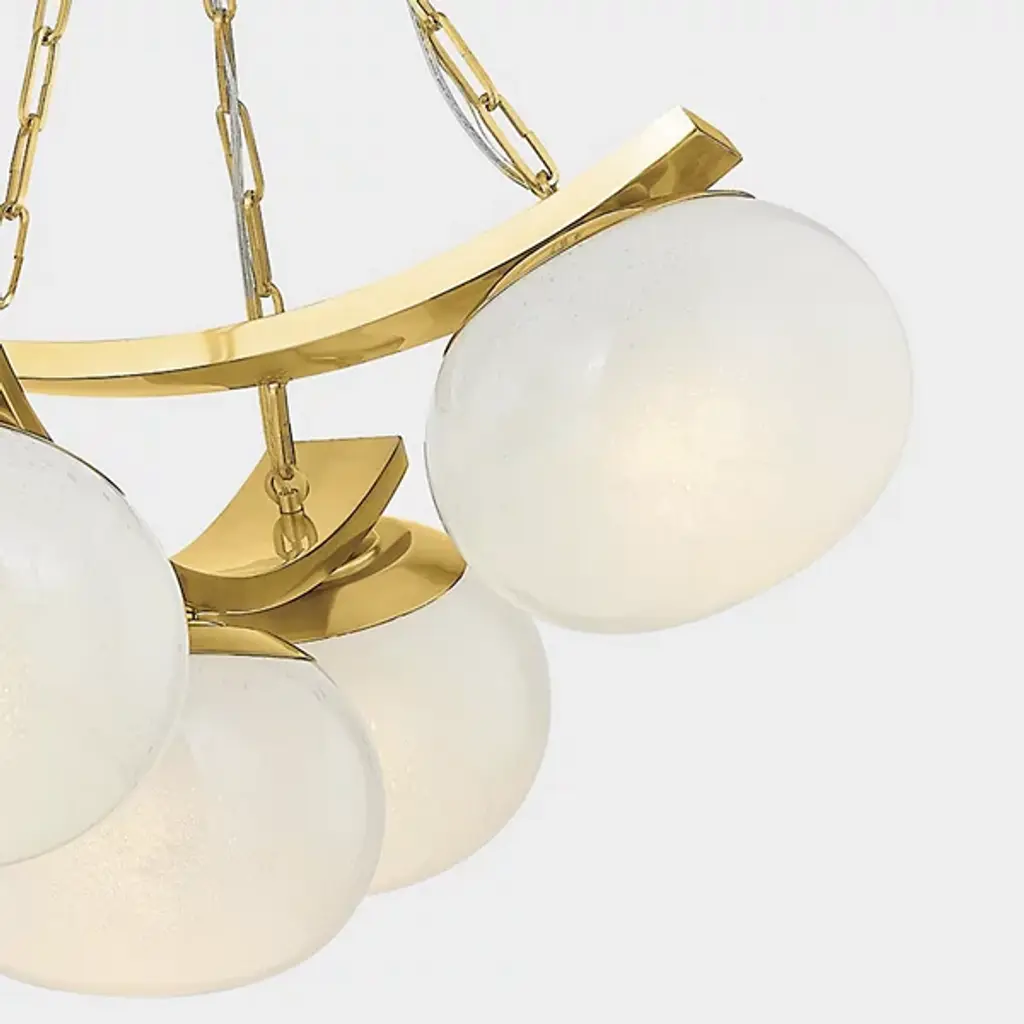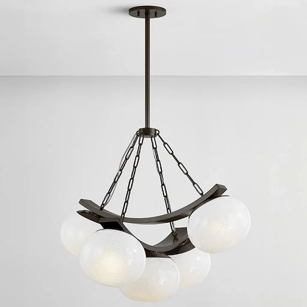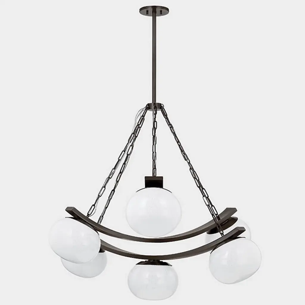 The Duxbury Chandelier from Hudson Valley Lighting strikes a delicate balance between hard and soft details, evoking a modern architectural ambiance reminiscent of morning dew on blades of grass. Its design features rounded cloud seedy glass shades suspended from stark metal bands and chain accents, offering a compelling contrast of textures and forms. The steel contrasts with the glass shades, blending transitional and mid-century modern styles. It embodies a retro, yet contemporary aesthetic with subtle details that exude sophistication.
