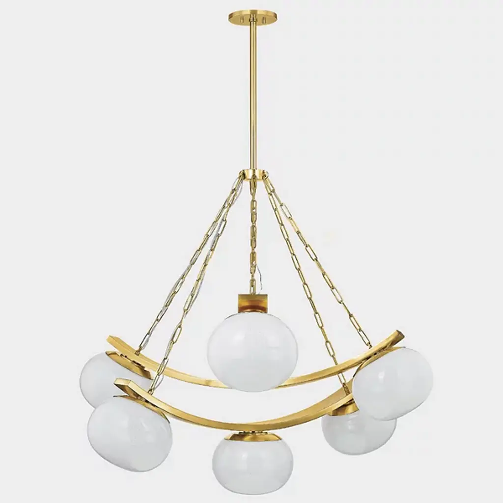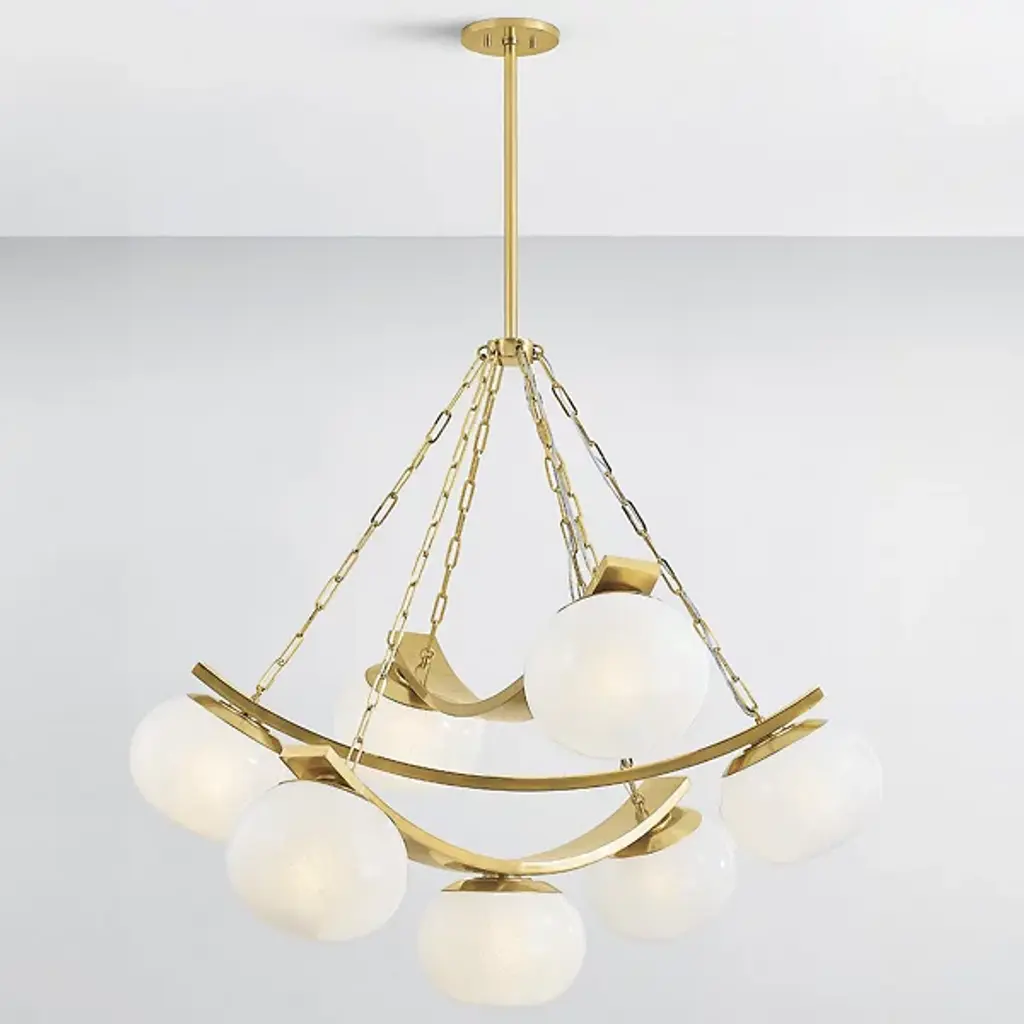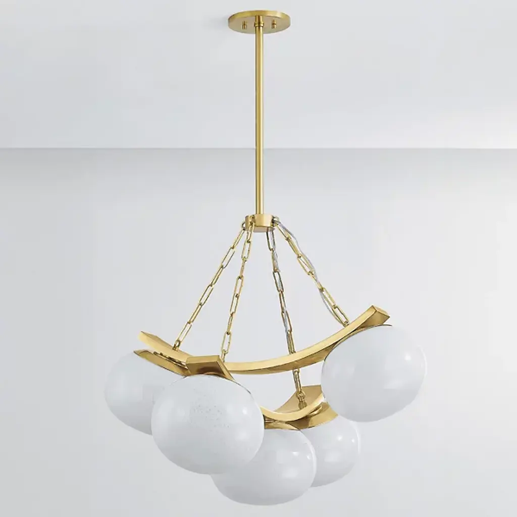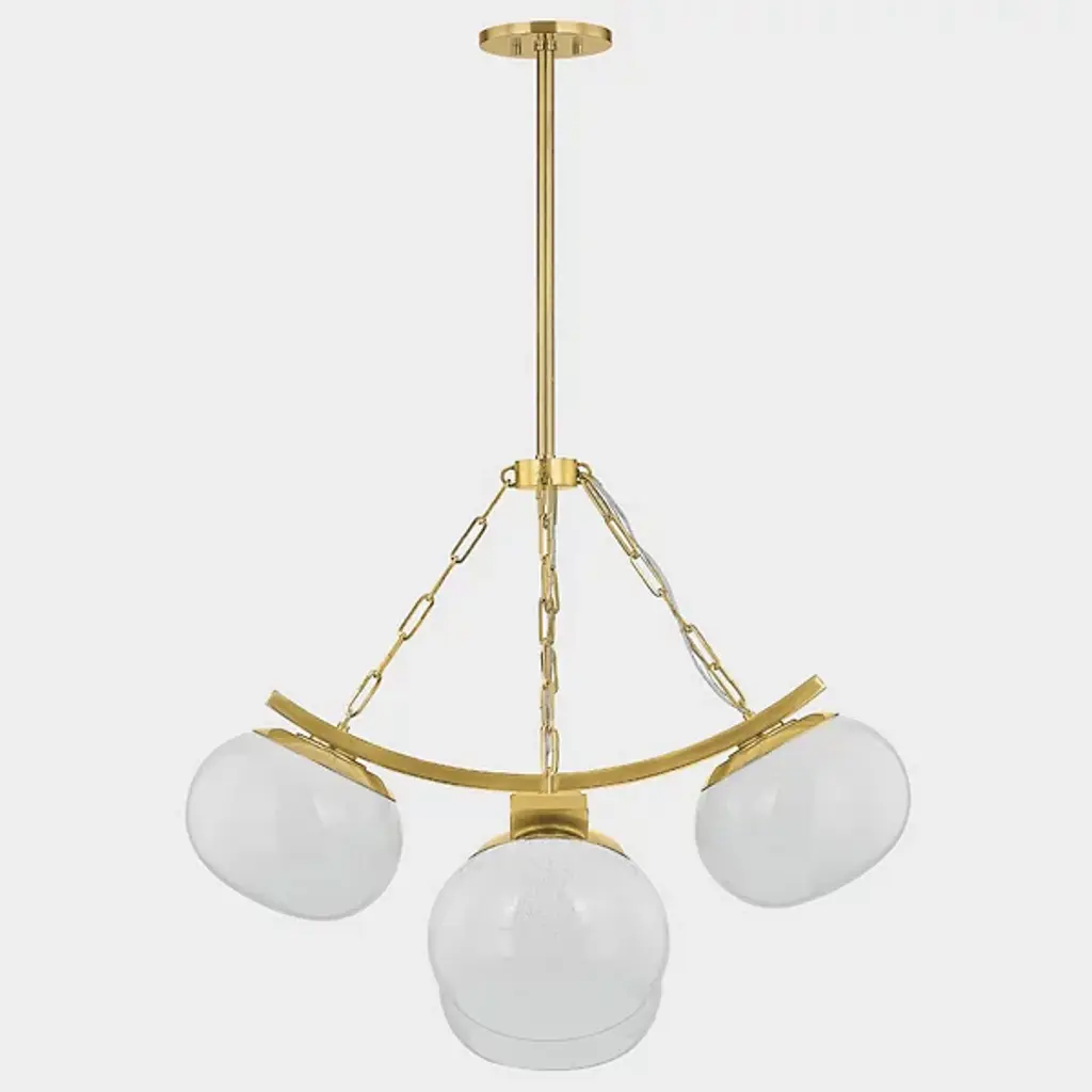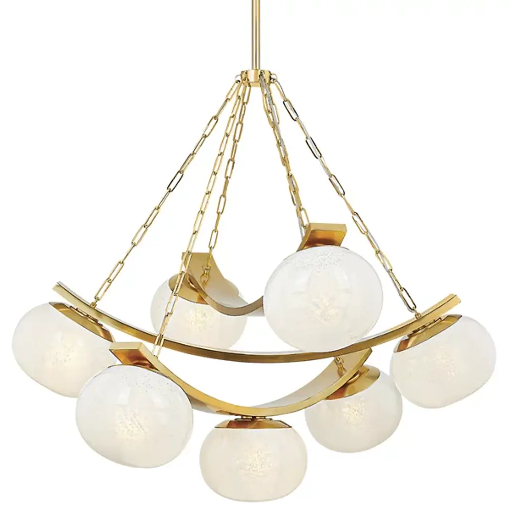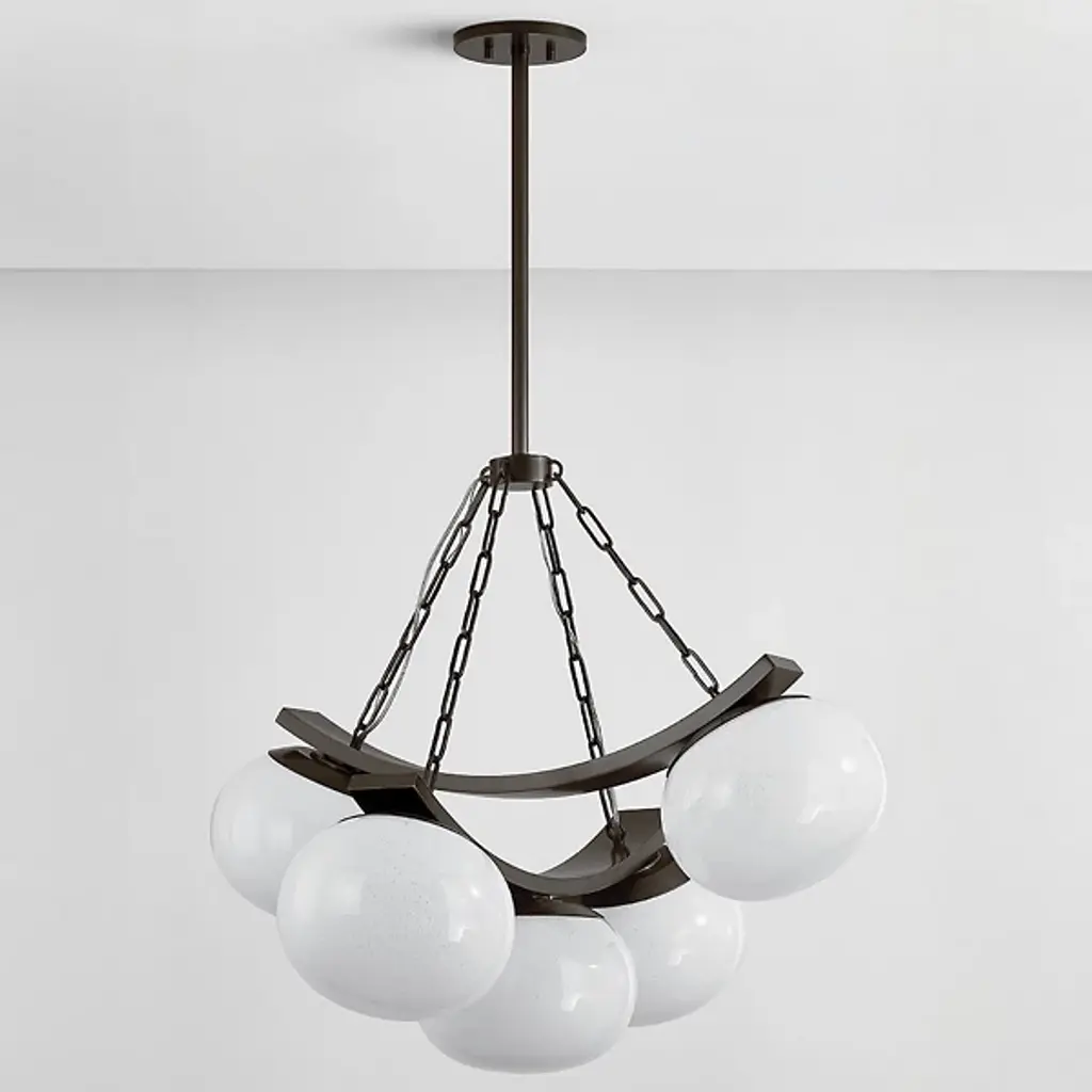 The Duxbury Chandelier from Hudson Valley Lighting strikes a delicate balance between hard and soft details, evoking a modern architectural ambiance reminiscent of morning dew on blades of grass. Its design features rounded cloud seedy glass shades suspended from stark metal bands and chain accents, offering a compelling contrast of textures and forms. The steel contrasts with the glass shades, blending transitional and mid-century modern styles. It embodies a retro, yet contemporary aesthetic with subtle details that exude sophistication.